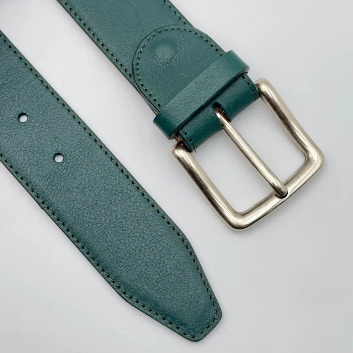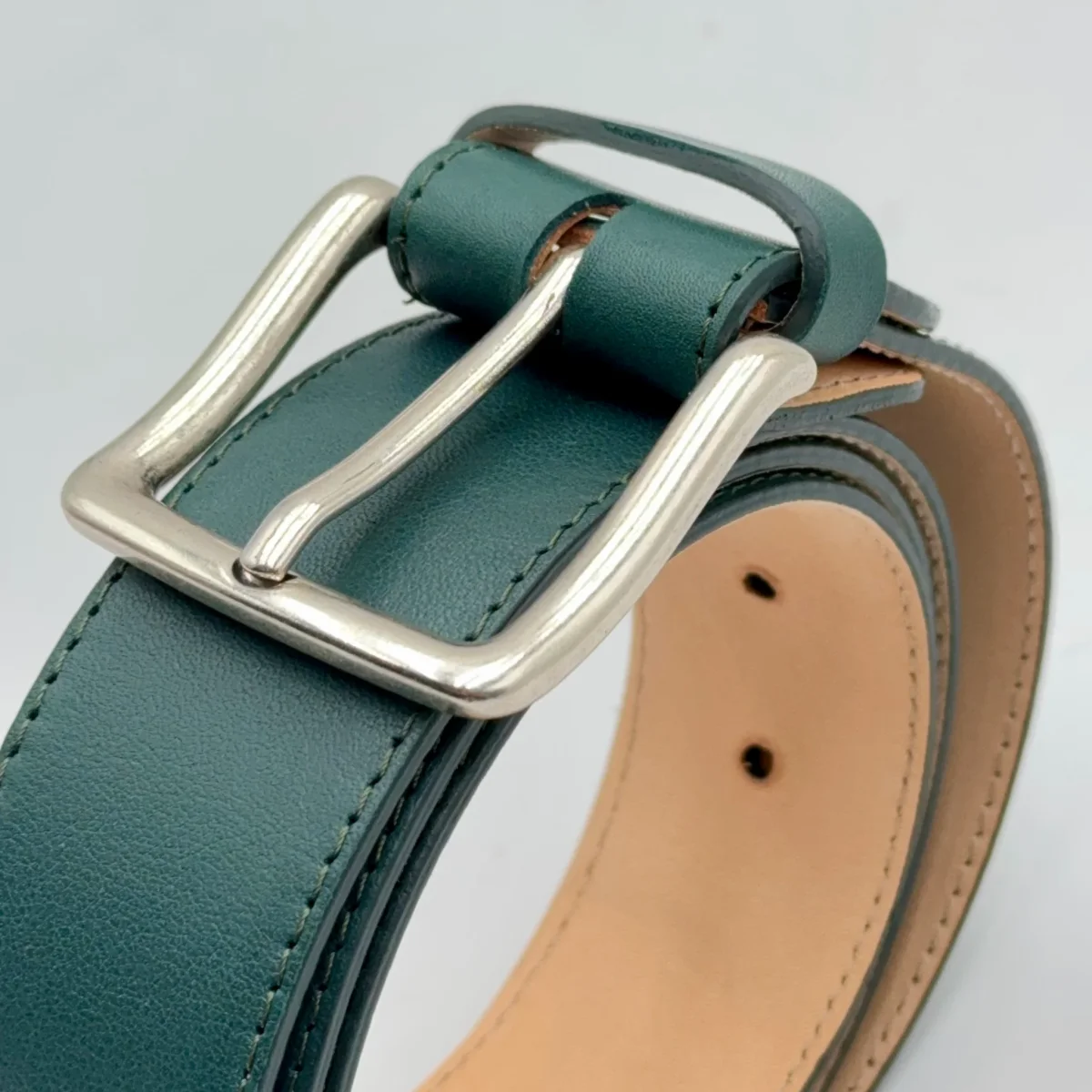 Cintura foderata in cuoio, color cardo marino (verde scuro), con il bordo tinto.