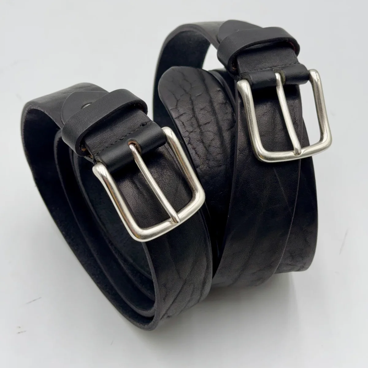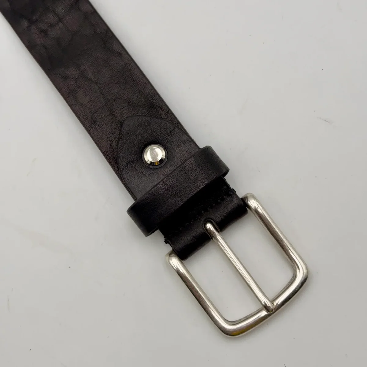 Cintura foderata in cuoio invecchiato nero, con il bordo tinto. Altezza circa 3,5 cm. Fibbie varie, in ottone spazzolato.