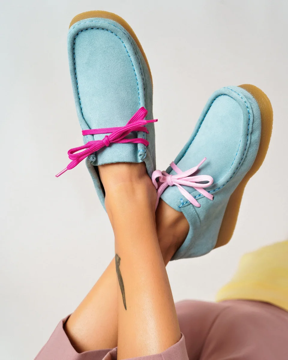 La punta è squadrata, la suola è in gomma tipo para color beige. Si ispirano alla moda casual anni ’90 ma le stringhe colorate le rendono attuali, versatili e divertenti.