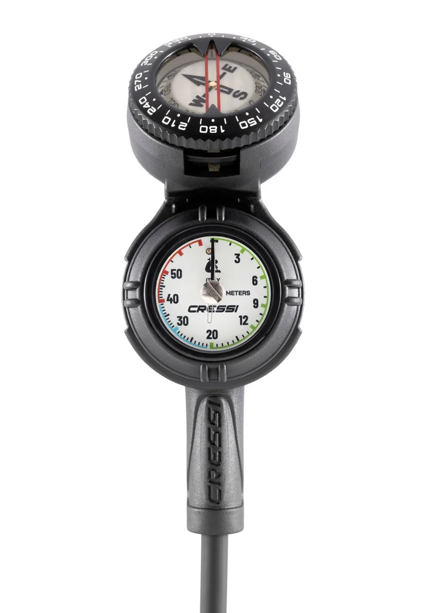 Console di dimensioni minime che ospita un mini manometro, un profondimetro analogico e una bussola leggermente inclinata per ottimizzare la lettura