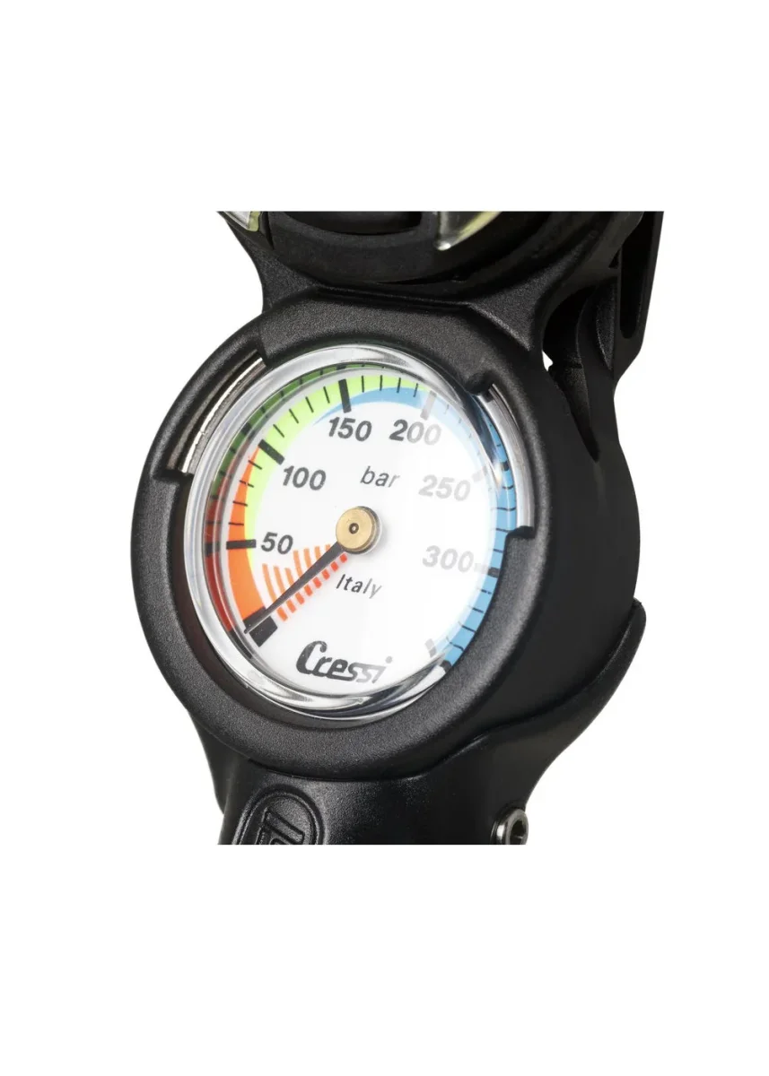 Il MINI MANOMETRO ha una scala colorata che i subacquei possono leggere a colpo d’occhio, E’ un manometro di piccole dimensioni e minimo peso, espressamente progettato per evitare sollecitazioni eccessive alla frusta HP di collegamento al primo stadio dell’erogatore.