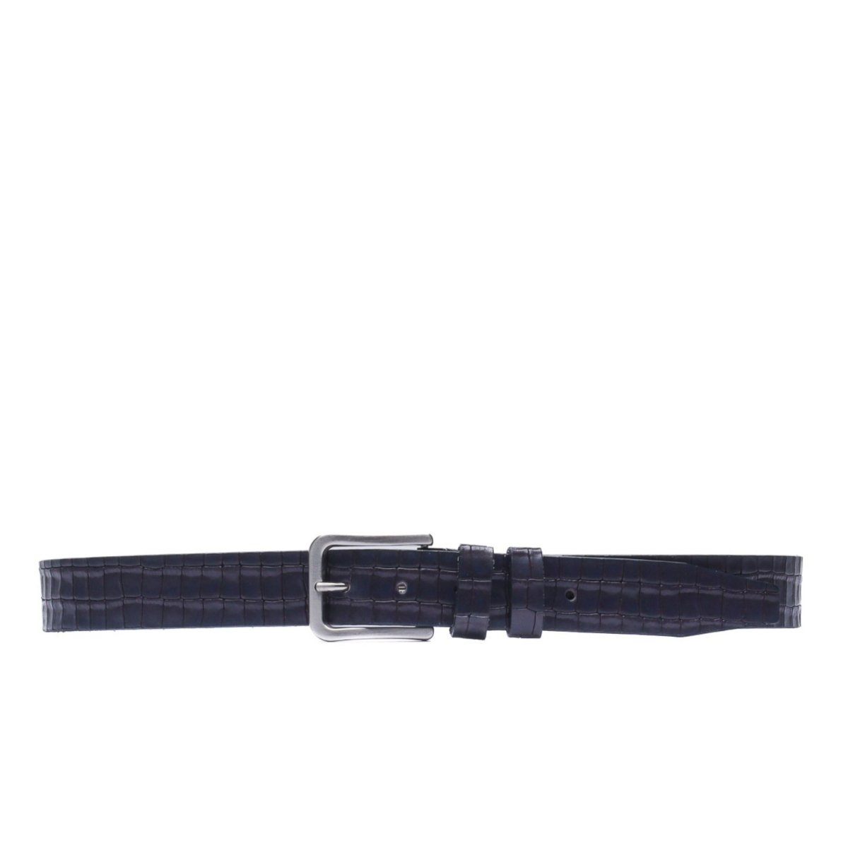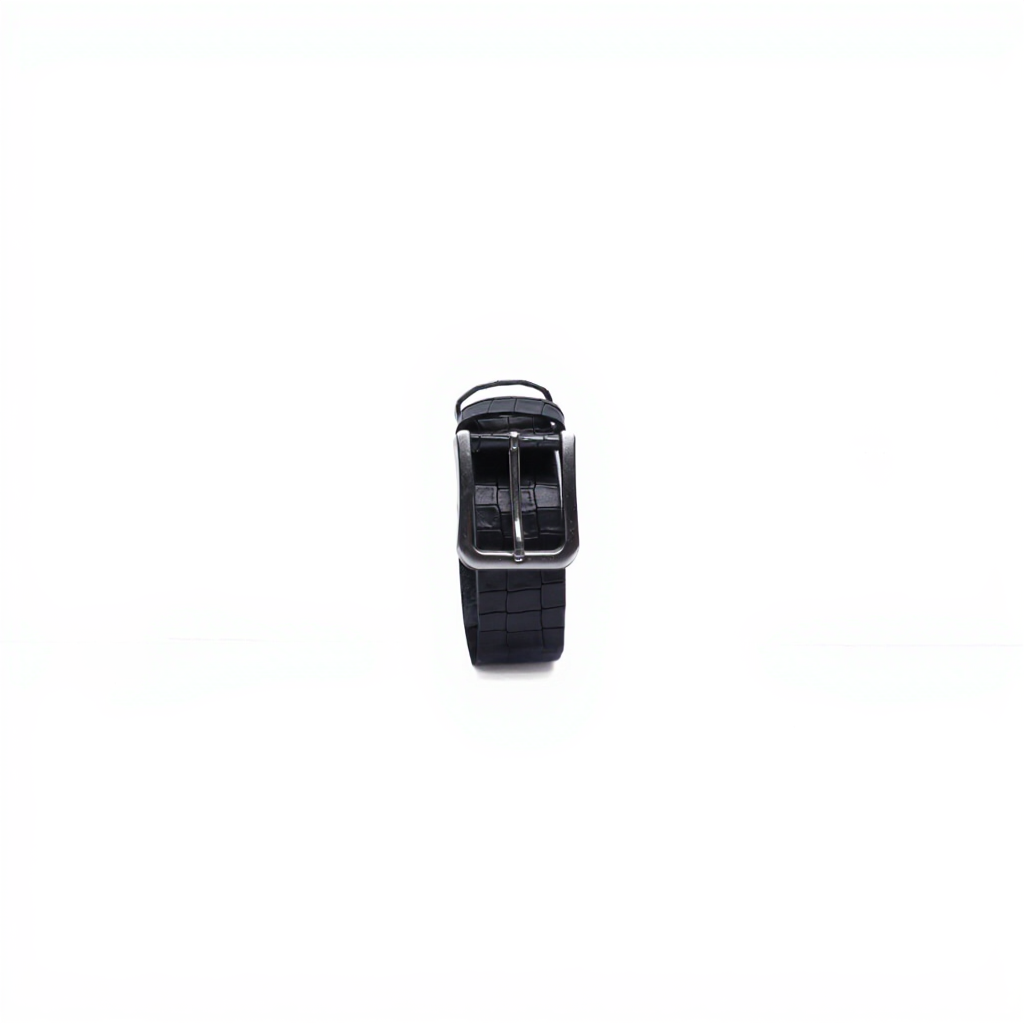 Questa cintura è realizzata in pregiata pelle con stampa coccodrillo, tinta a mano nel colore grigio scuro. La lavorazione a rilievo mette in evidenza il disegno irregolare della grana, conferendo profondità e personalità a un accessorio pensato per distinguersi con eleganza.
