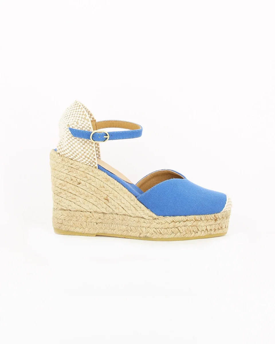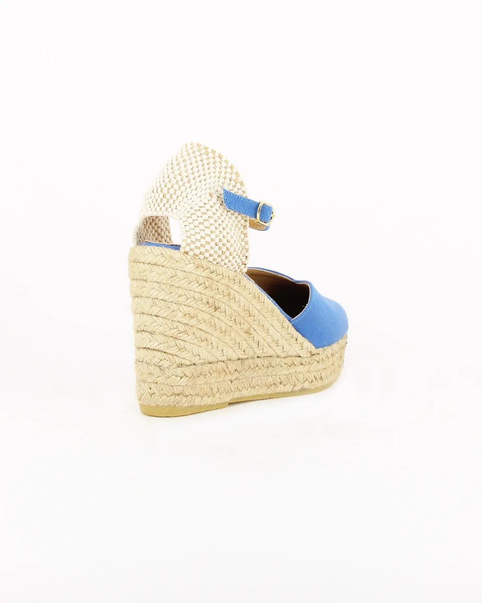 Espadrillas in tessuto con allacciatura alla caviglia, zeppa in iute naturale alta 7 cm e plateau di 1 cm.