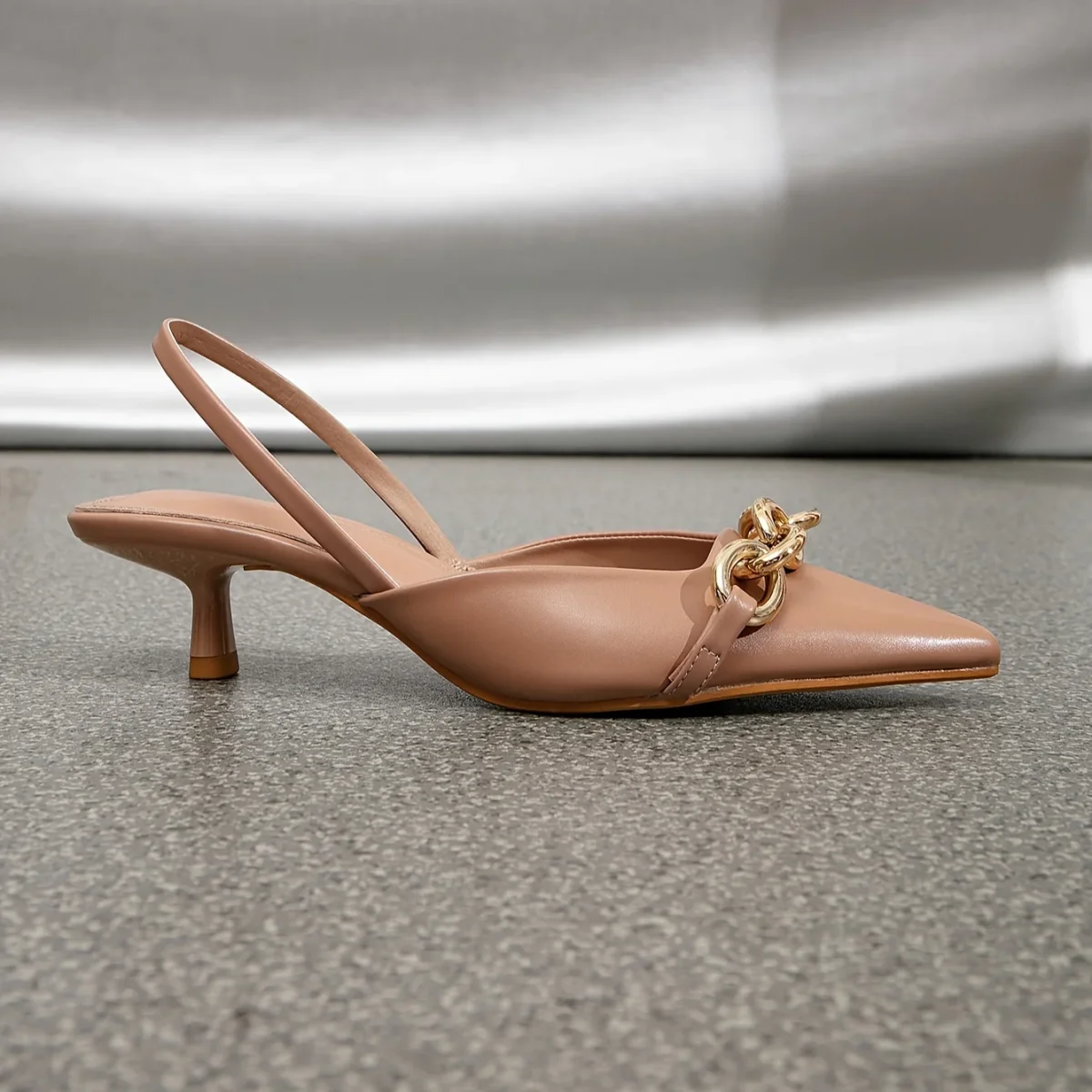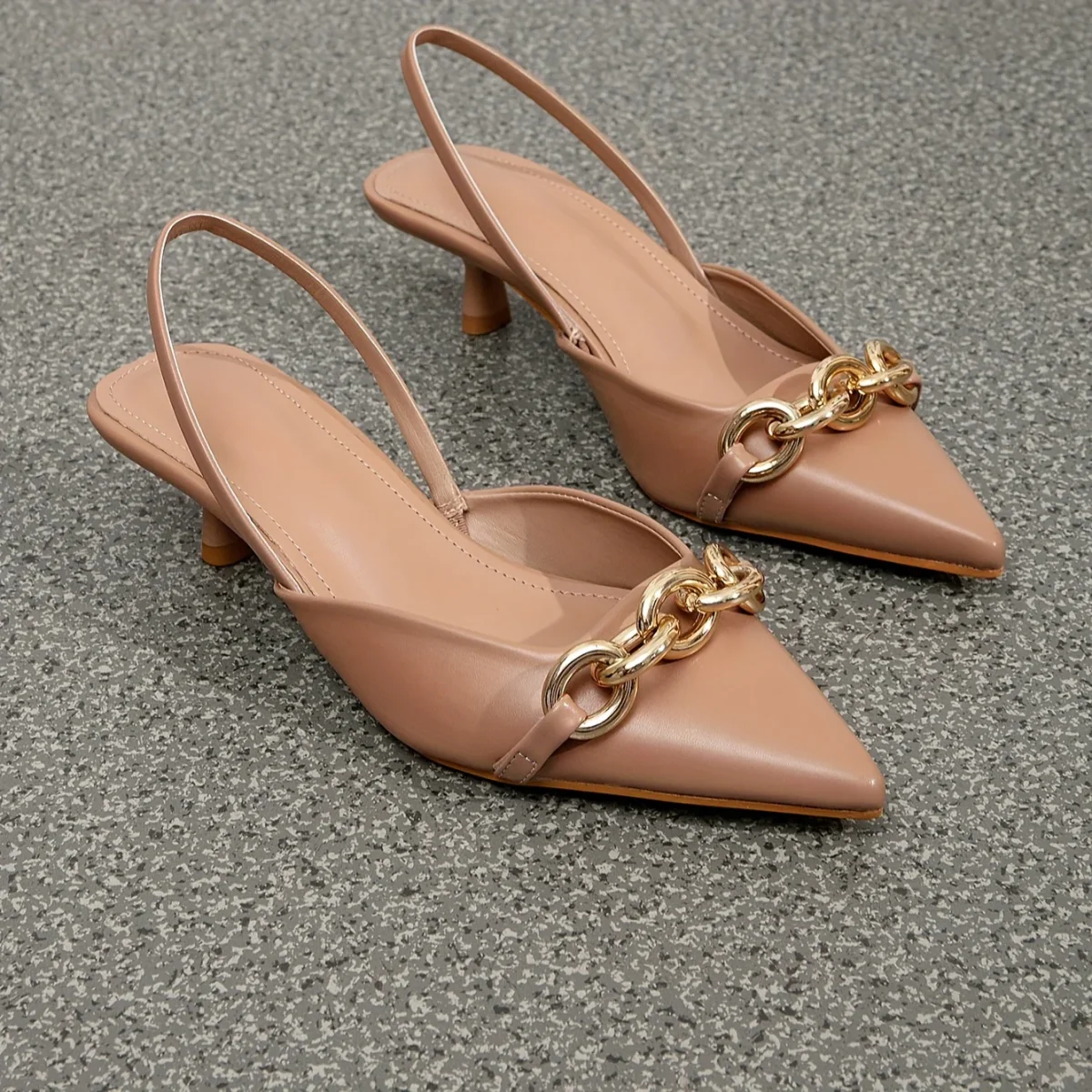 Décolleté in raffinato color bronzo con punta affusolata e tacco flare da 4 cm, pensate per matrimoni, cerimonie ed eventi eleganti. Il design minimalista è arricchito da una fibbia metallica chic che dona luce al look. La calzata slip-on le rende pratiche da indossare, mentre i materiali sintetici di qualità e la suola in gomma garantiscono comfort per tutta la giornata.