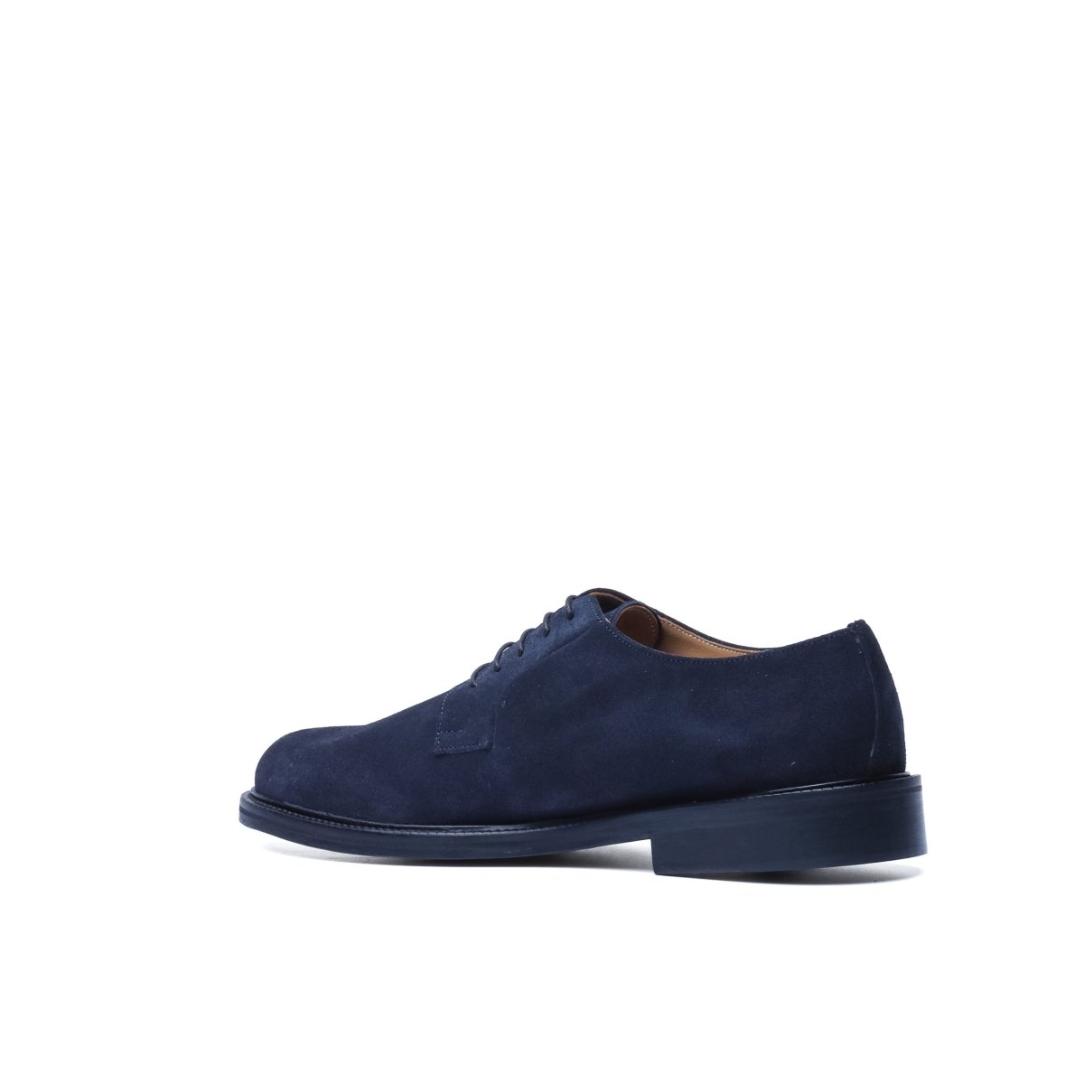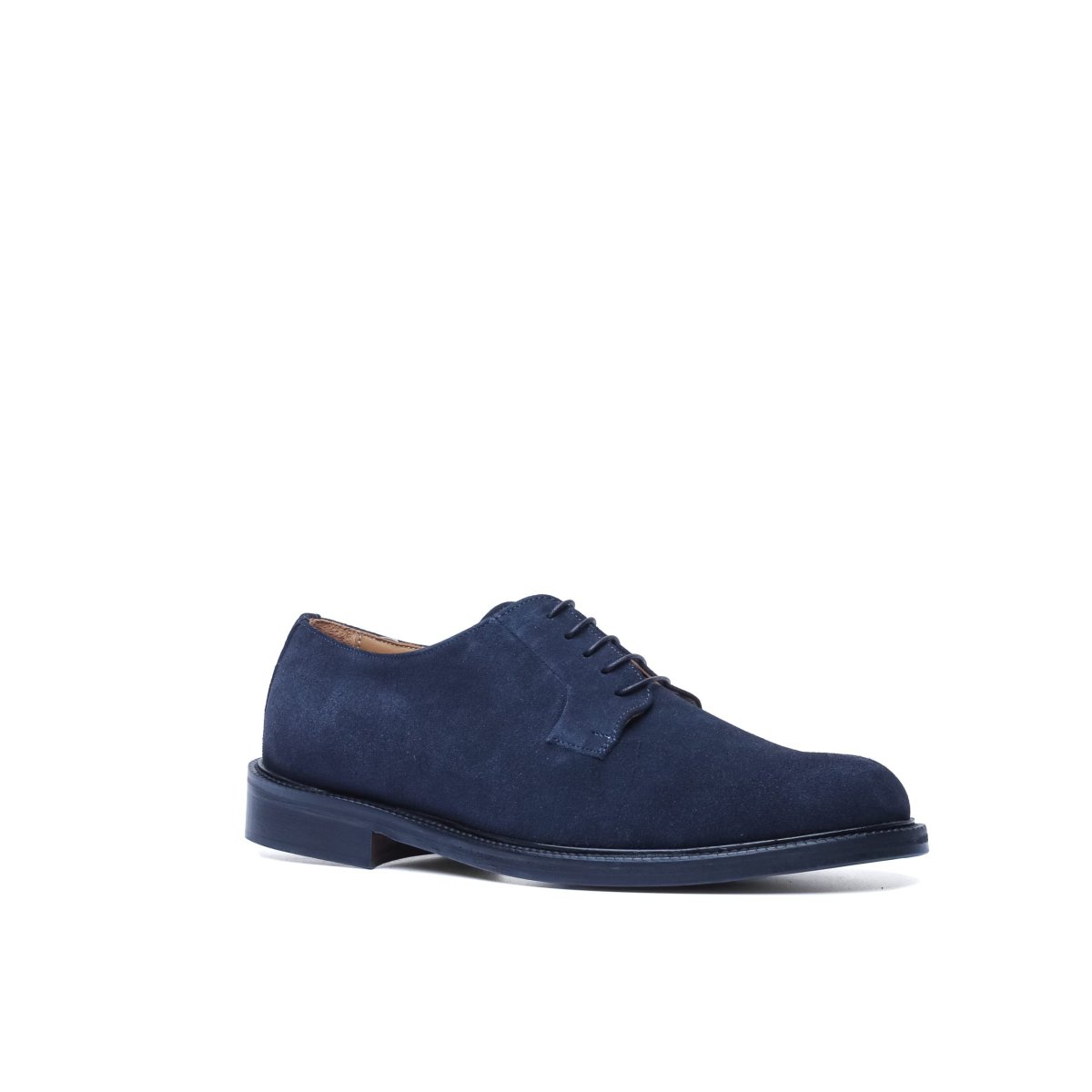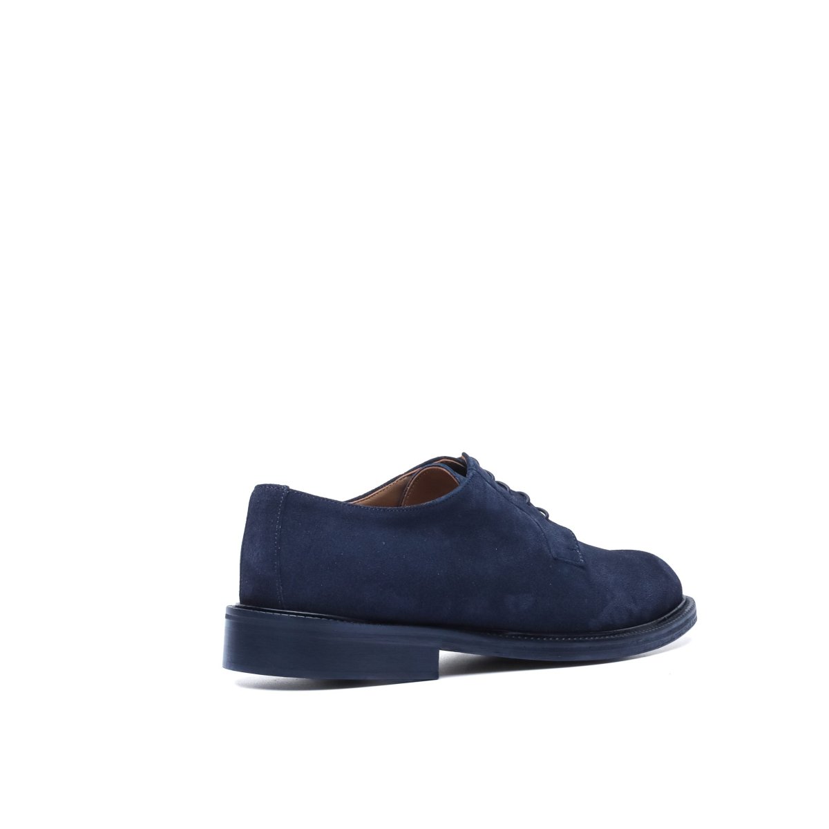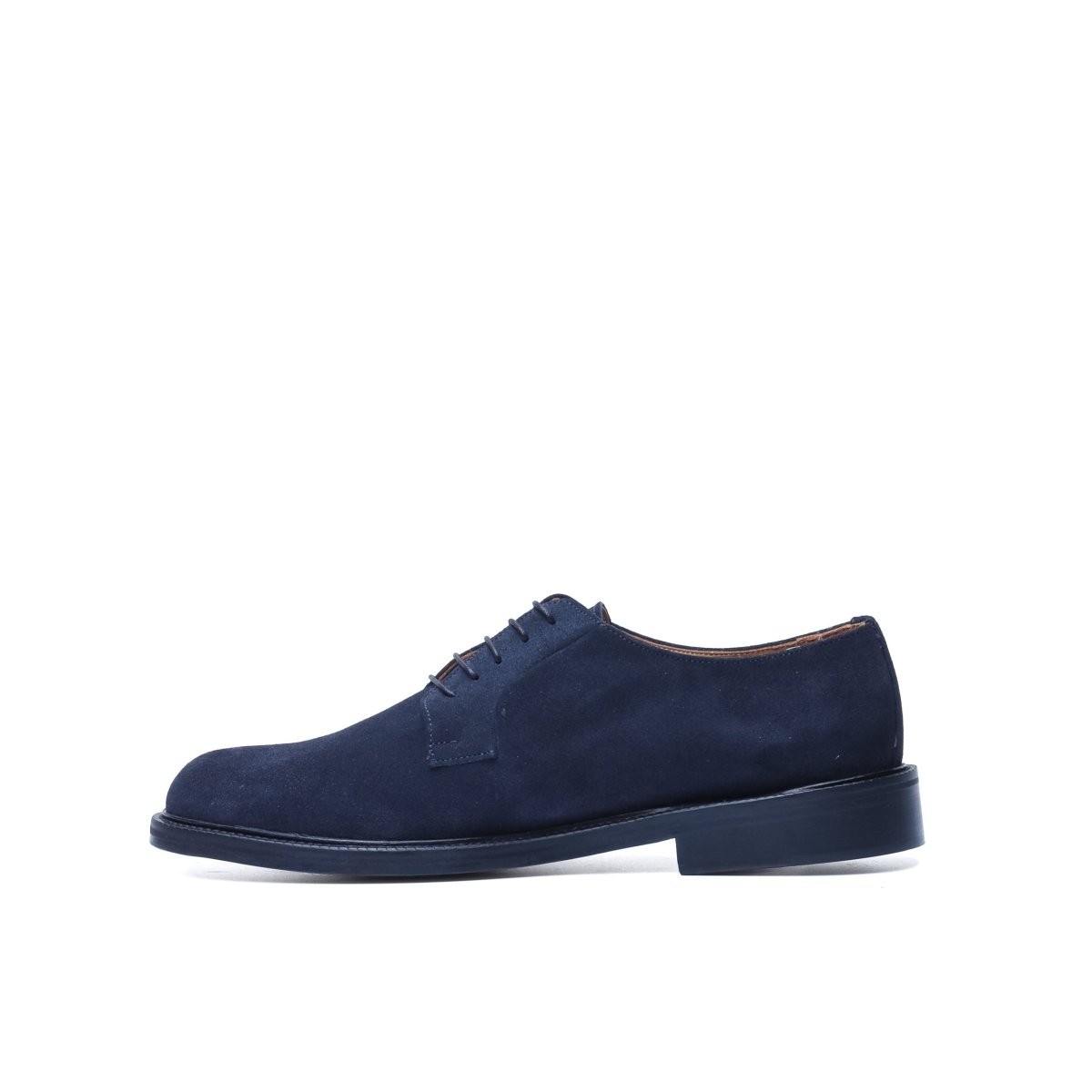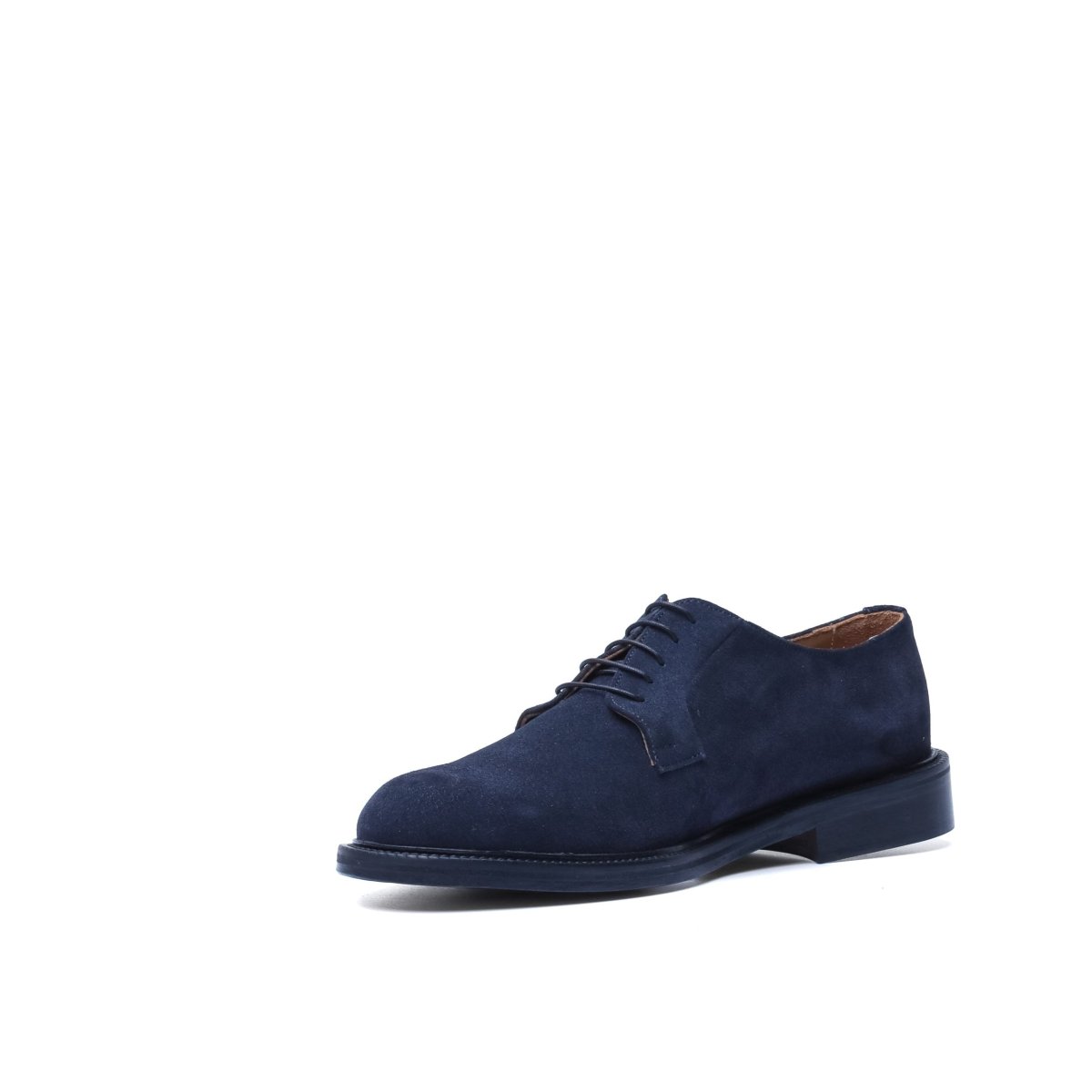 Calzatura artigianale made in Italy modello Derby stringata. Realizzata in pelle di vitello scamosciata tinta nel colore blu. Interno foderato in pelle nel colore beige con logo stampato nel colore oro. Suola in cuoio con lavorazione blake, tinta a mano nel colore beige e logo corsivo inciso. Adatta per un look elegante-casual per il tempo libero, occasioni informali o per andare in ufficio. Questa calzatura realizzata a mano unisce storia, eleganza, comfort e robustezza tipici dei prodotti Made in Italy con lo stile unico di Andrea Nobile.