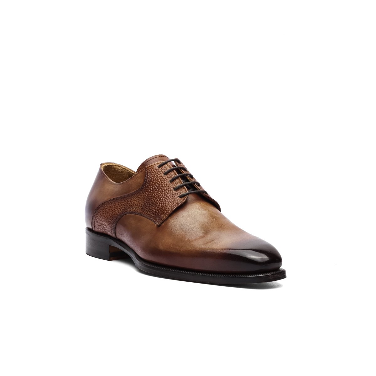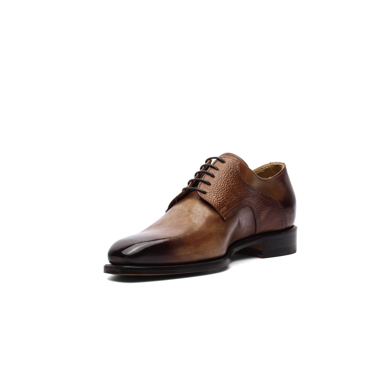 Calzature artigianali made in Italy modello Derby, caratterizzati dal dettaglio riportato sulla parte alta della tomaia
