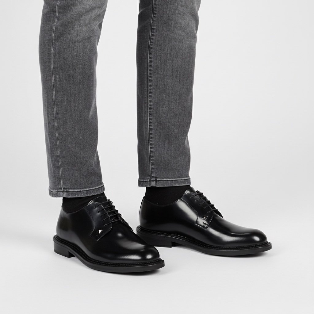 La finitura “a specchio” della pelle che rende questa scarpa unica è ottenuta con un lungo processo di spazzolatura effettuato da artigiani esperti.