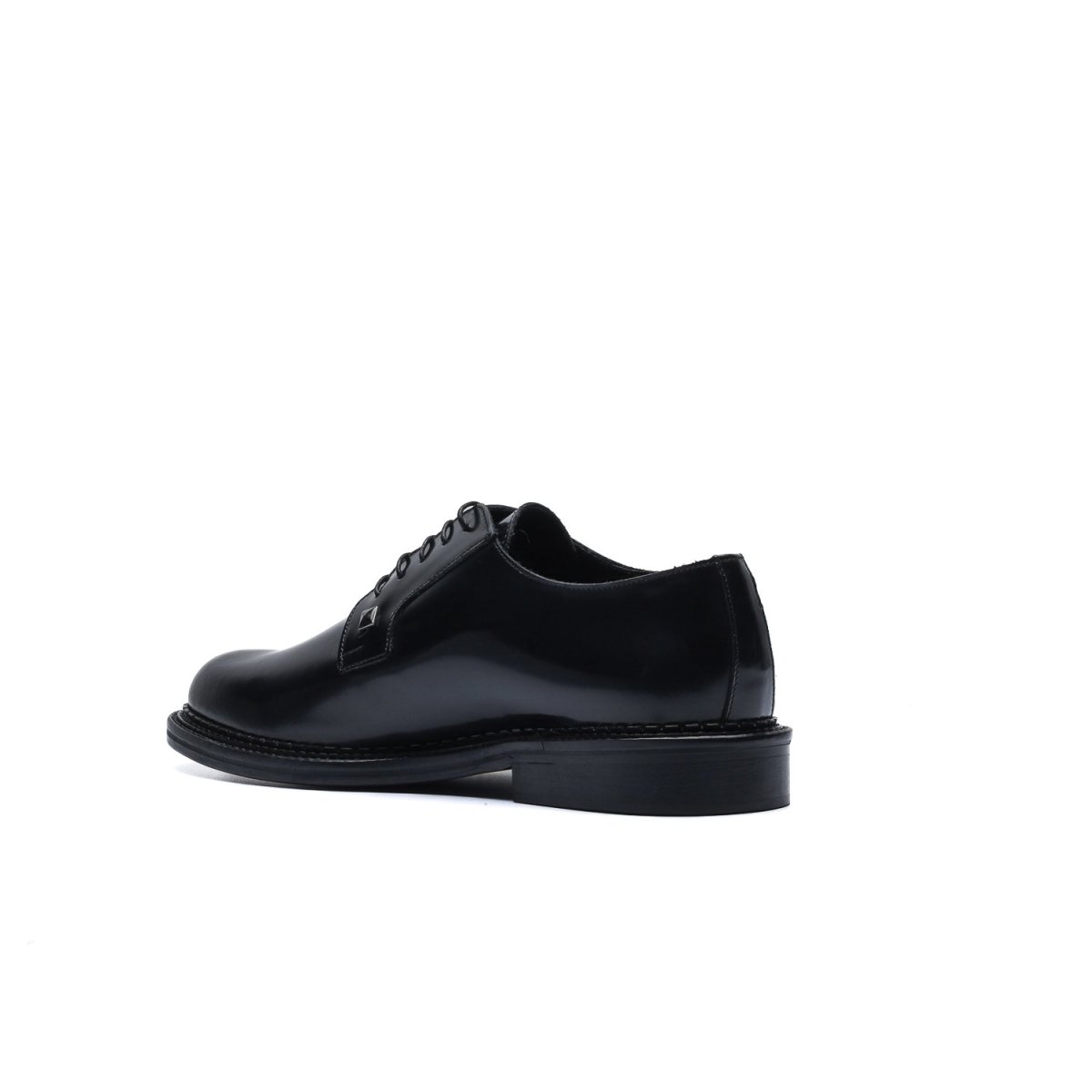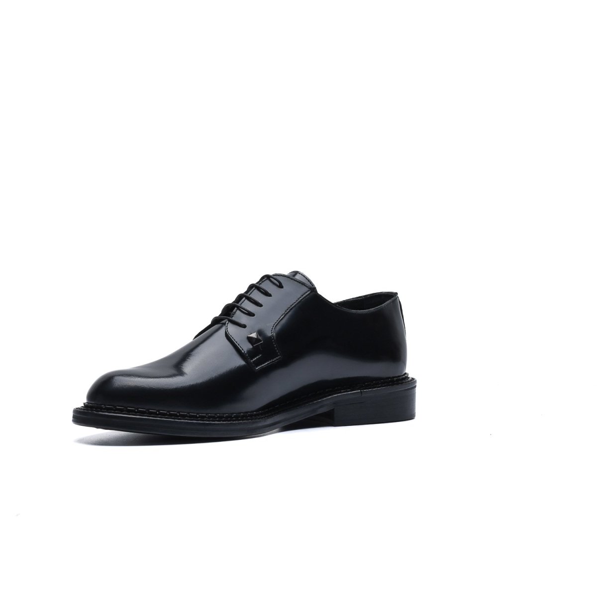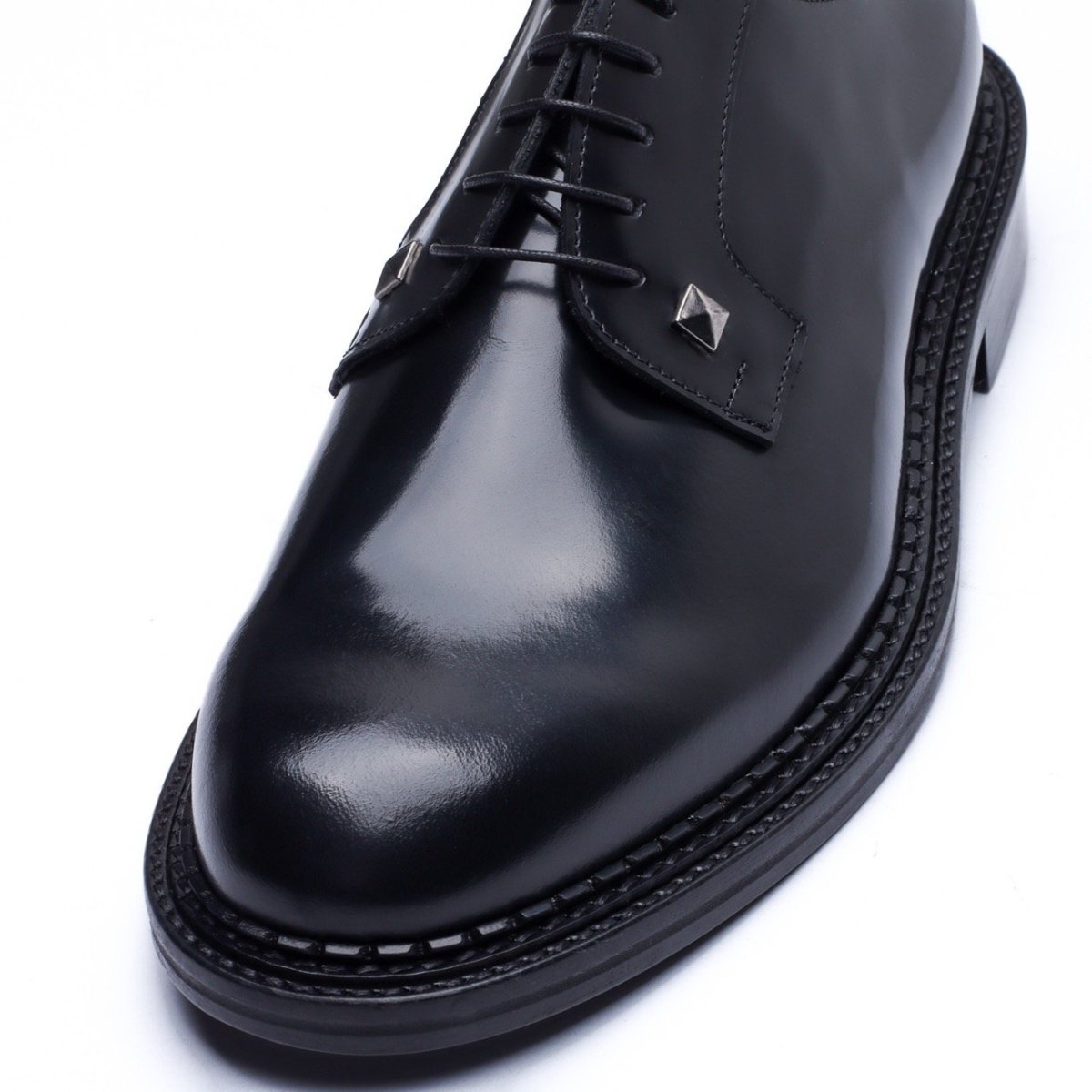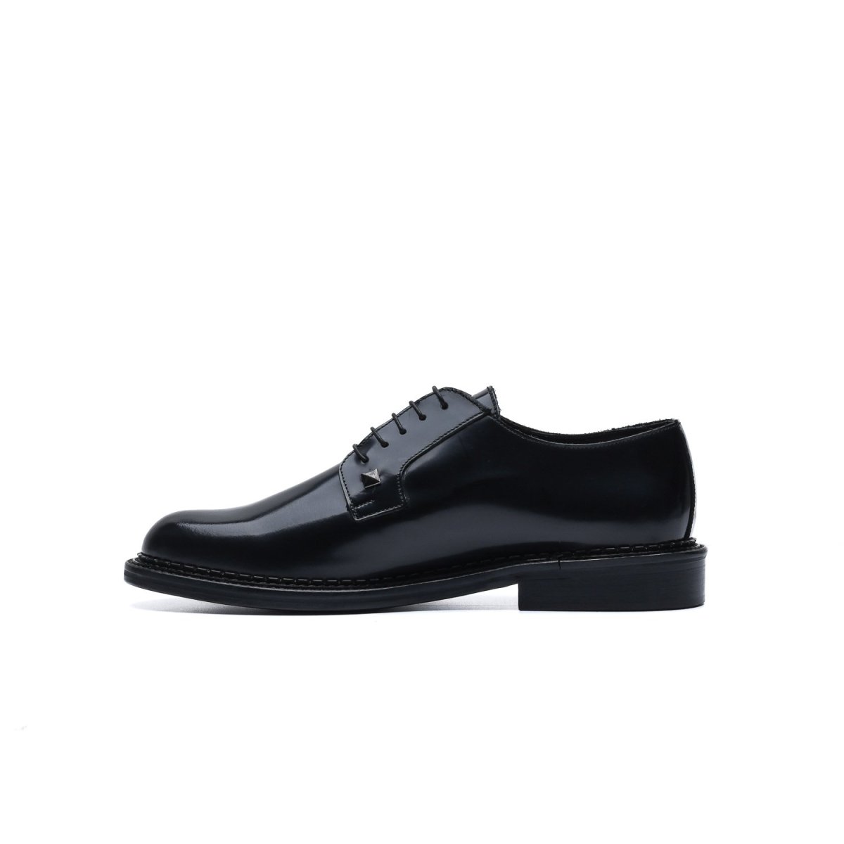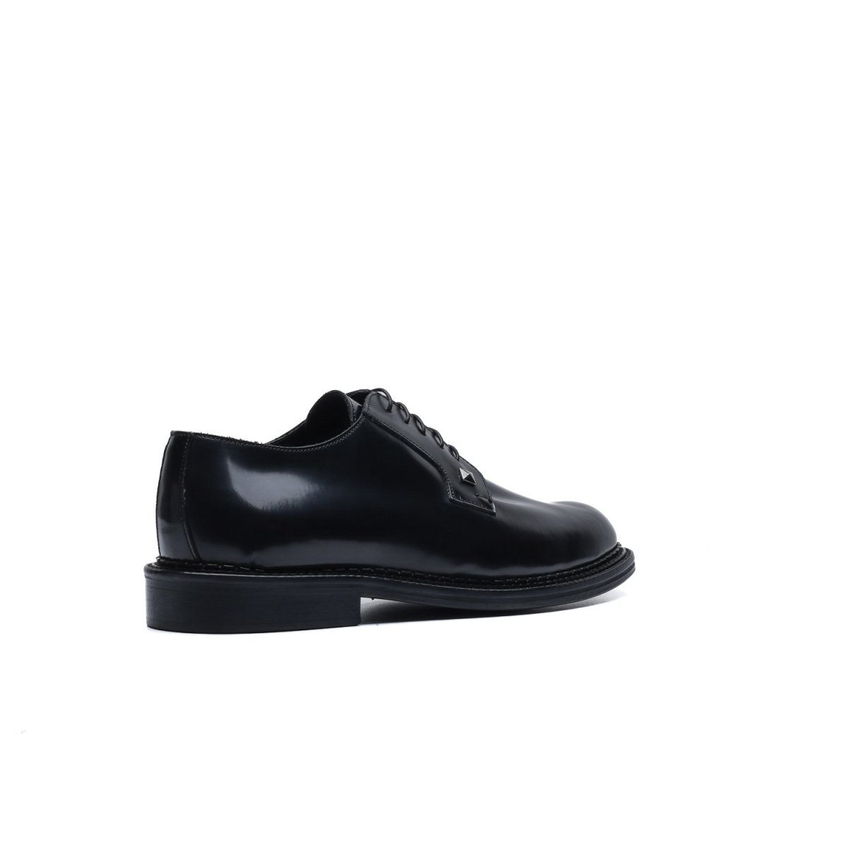 Calzatura artigianale made in Italy modello Derby stringata. Realizzata in pelle di vitello tinta a mano nel colore nero con applicazione di borchie a punta nelle giunture dell’allacciatura. La finitura “a specchio” della pelle che rende questa scarpa unica è ottenuta con un lungo processo di spazzolatura effettuato da artigiani esperti. Interno foderato in pelle nel colore nero con logo stampato nel colore oro. Suola in cuoio con lavorazione blake, guardolo dentato che crea una scanalatura dallo stile deciso, tinta a mano nel colore nero e logo corsivo inciso. Adatta per un look elegante-casual per il tempo libero, occasioni informali…