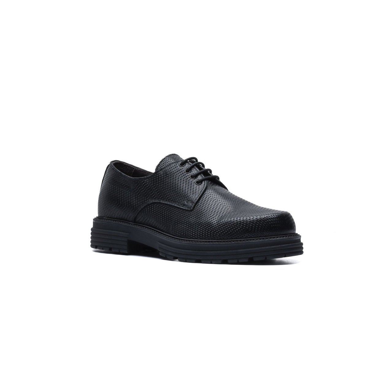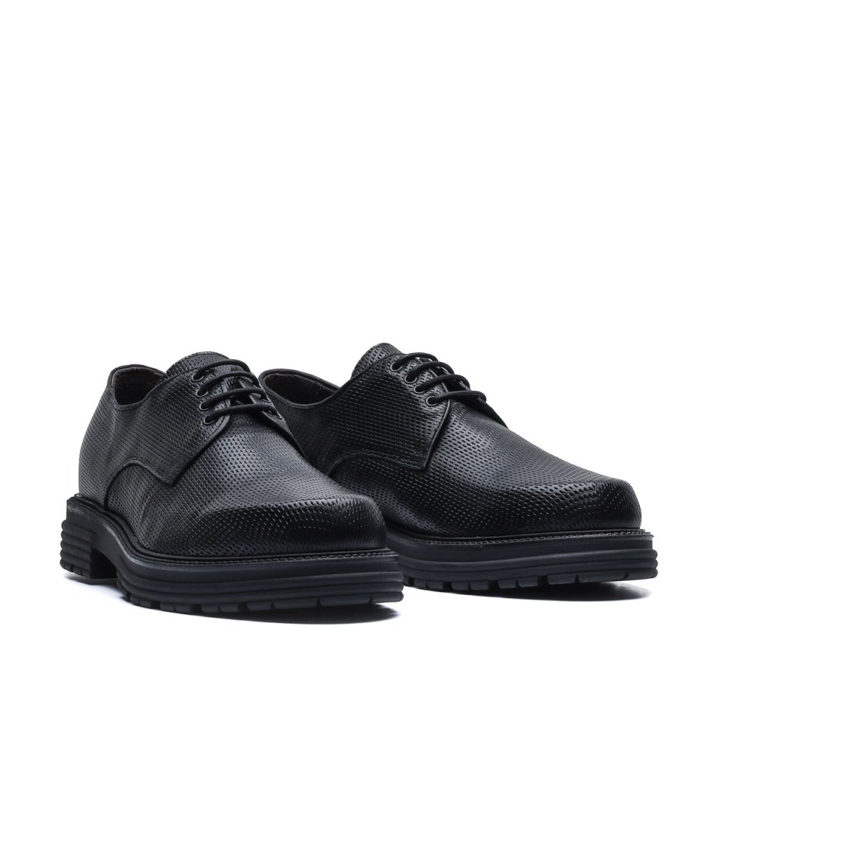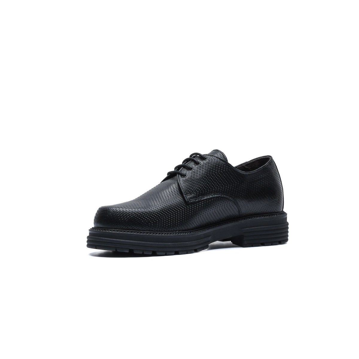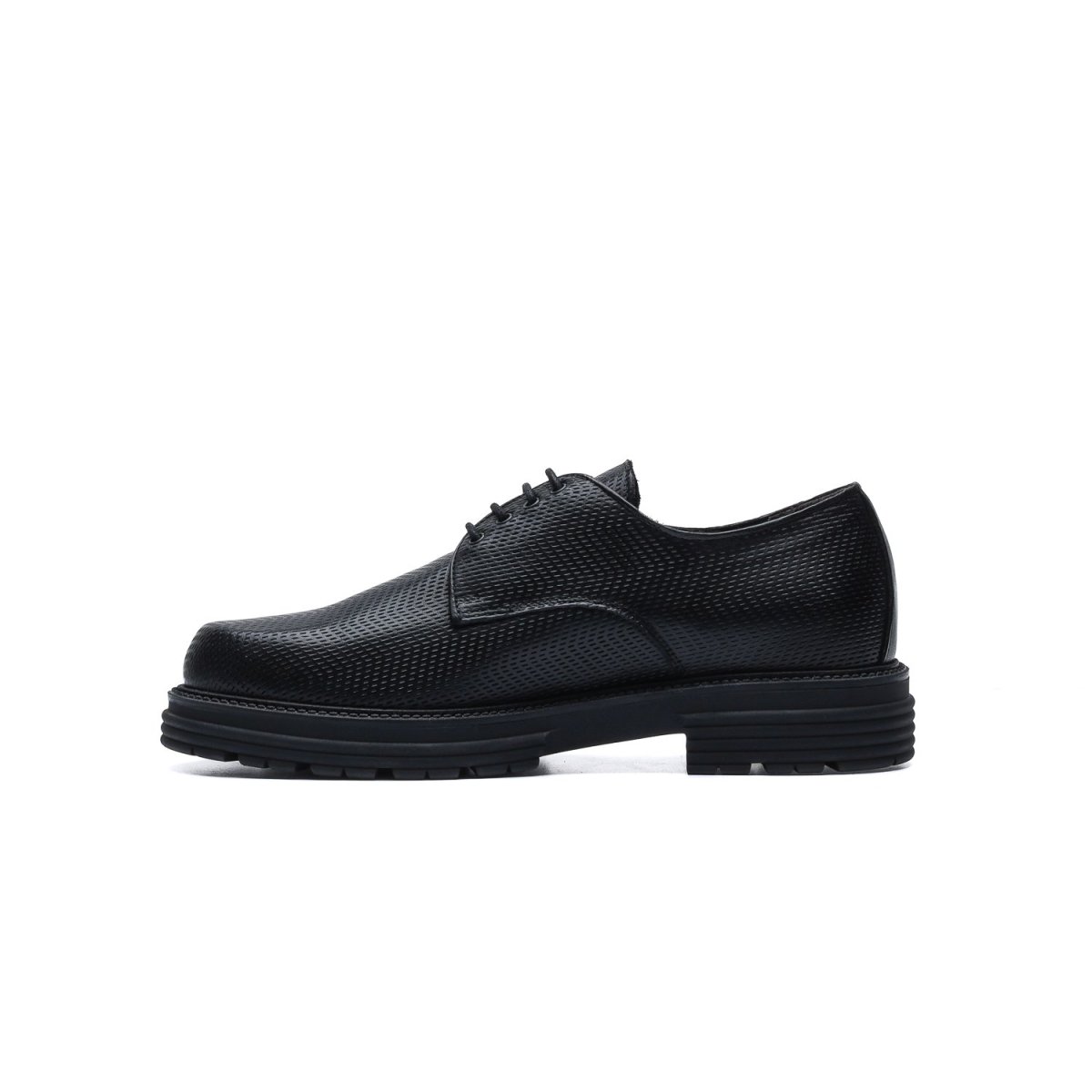 Derby in pelle di vitello stampata con texture ispirata all’accelerazione e tinta a mano con sfumature artigianali.