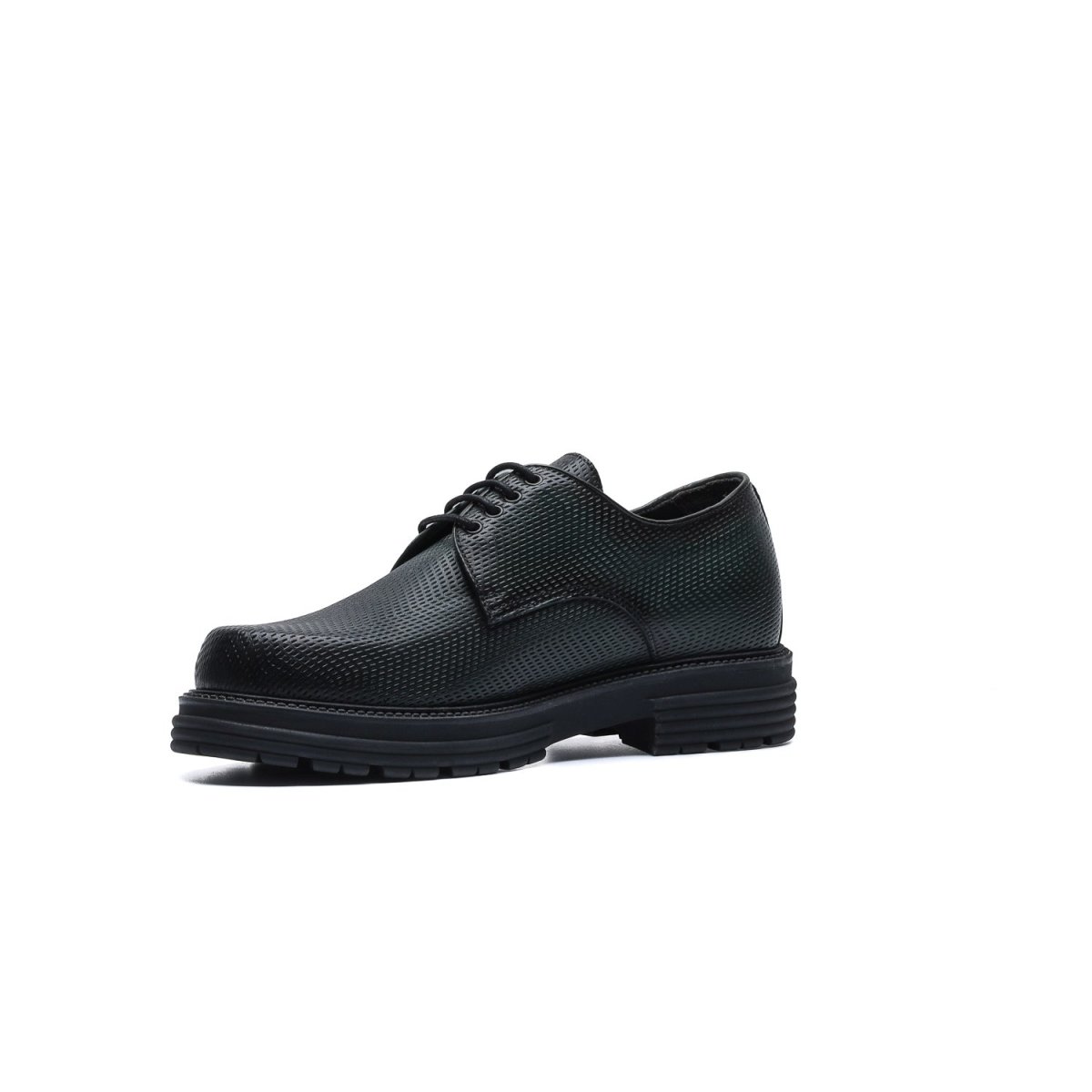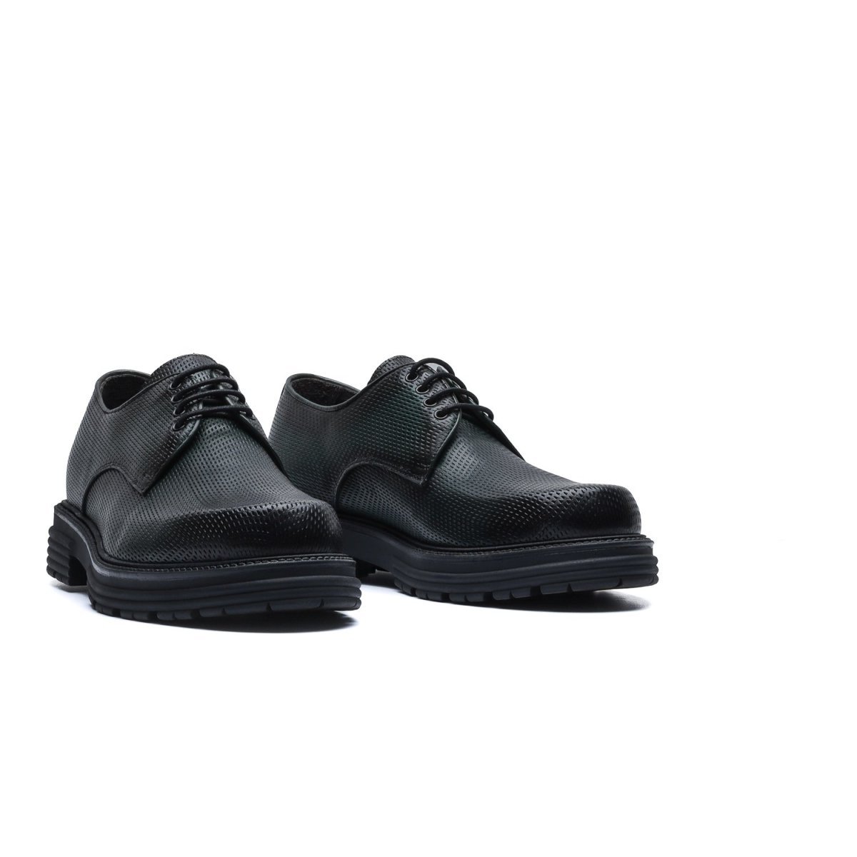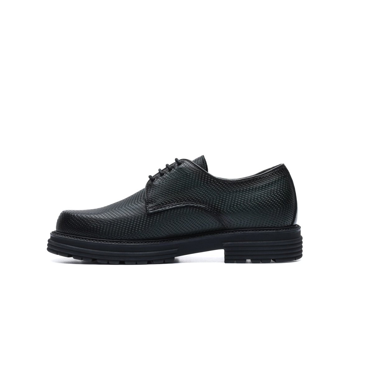 Derby in pelle di vitello stampata con texture ispirata all’accelerazione e tinta a mano con sfumature artigianali.
