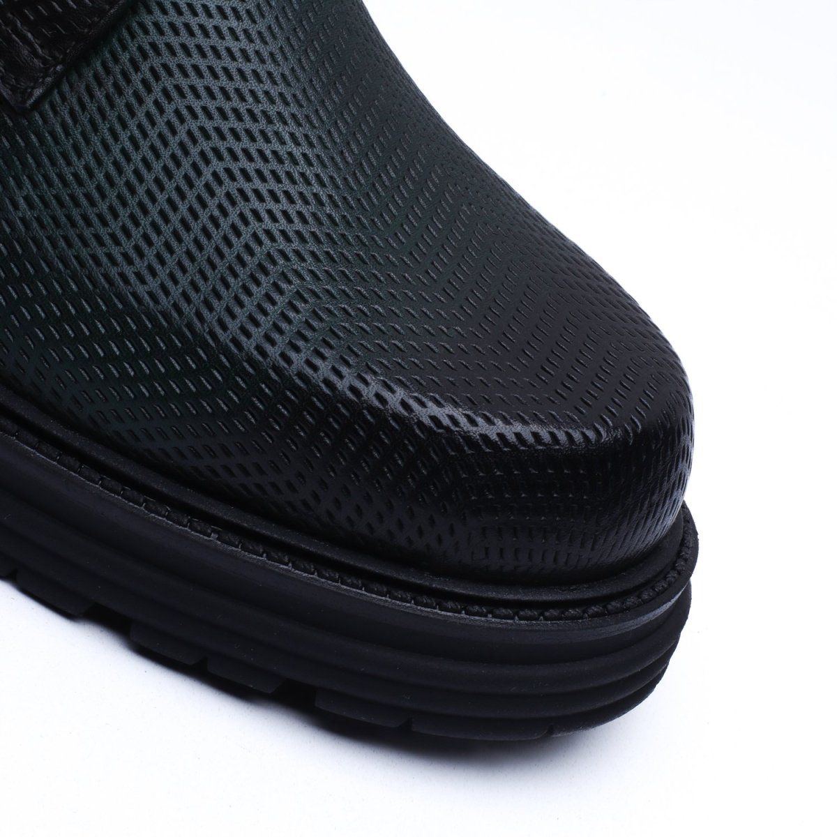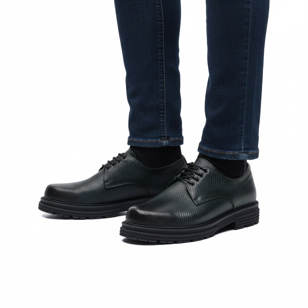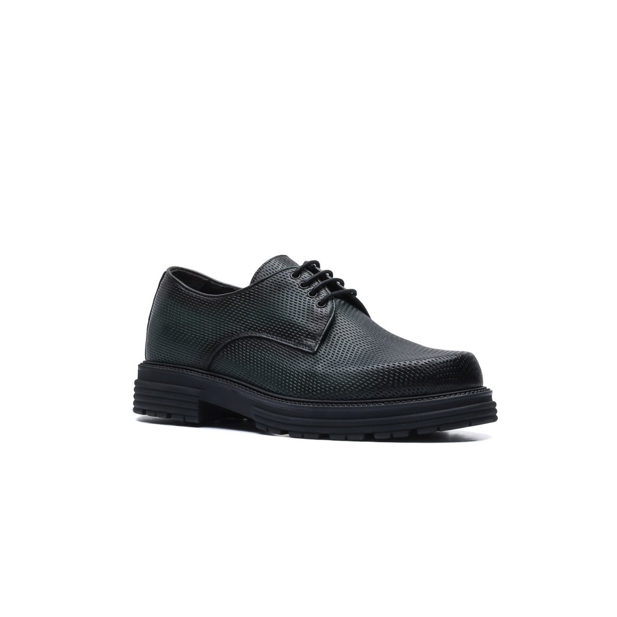 Derby in pelle di vitello stampata con texture ispirata all’accelerazione e tinta a mano con sfumature artigianali.