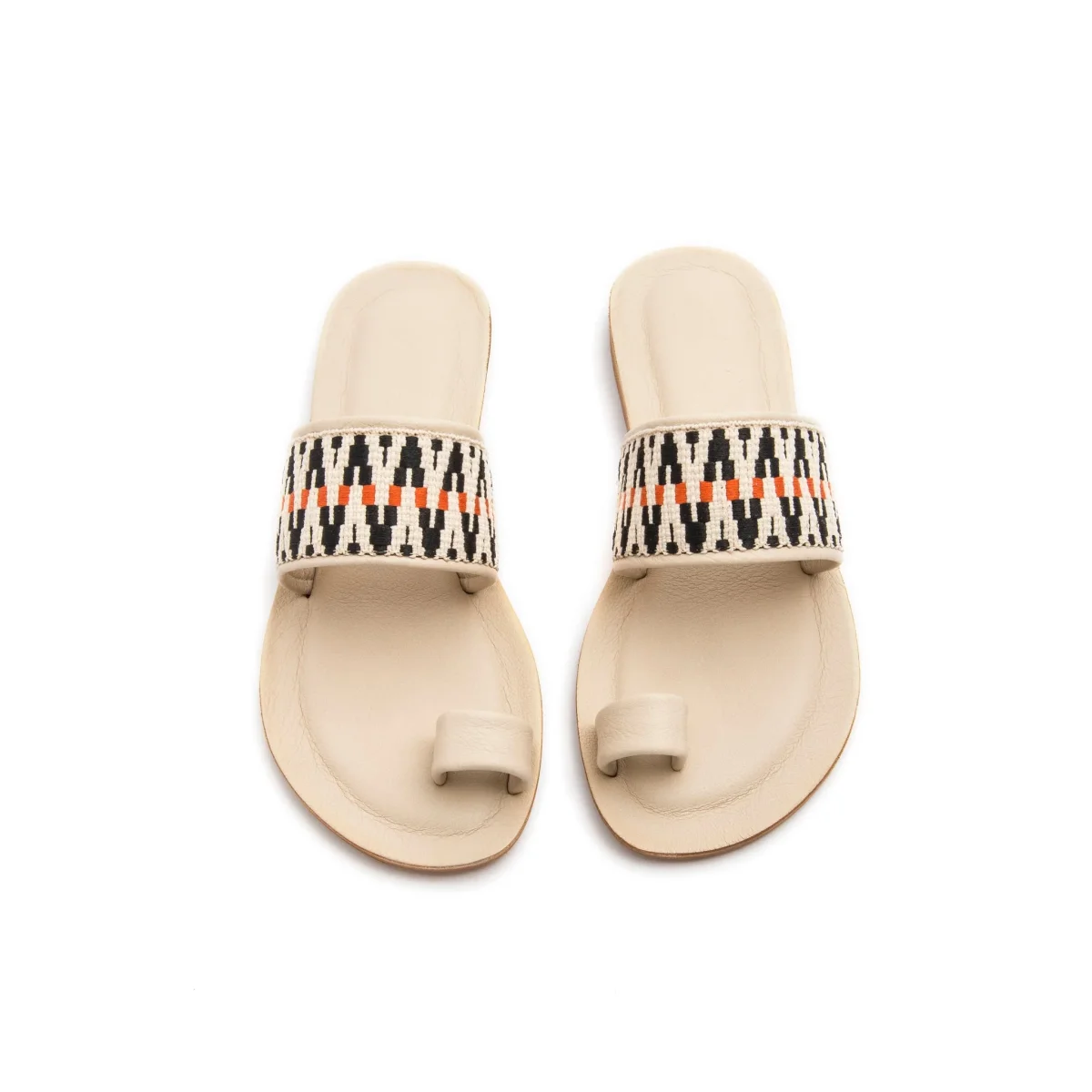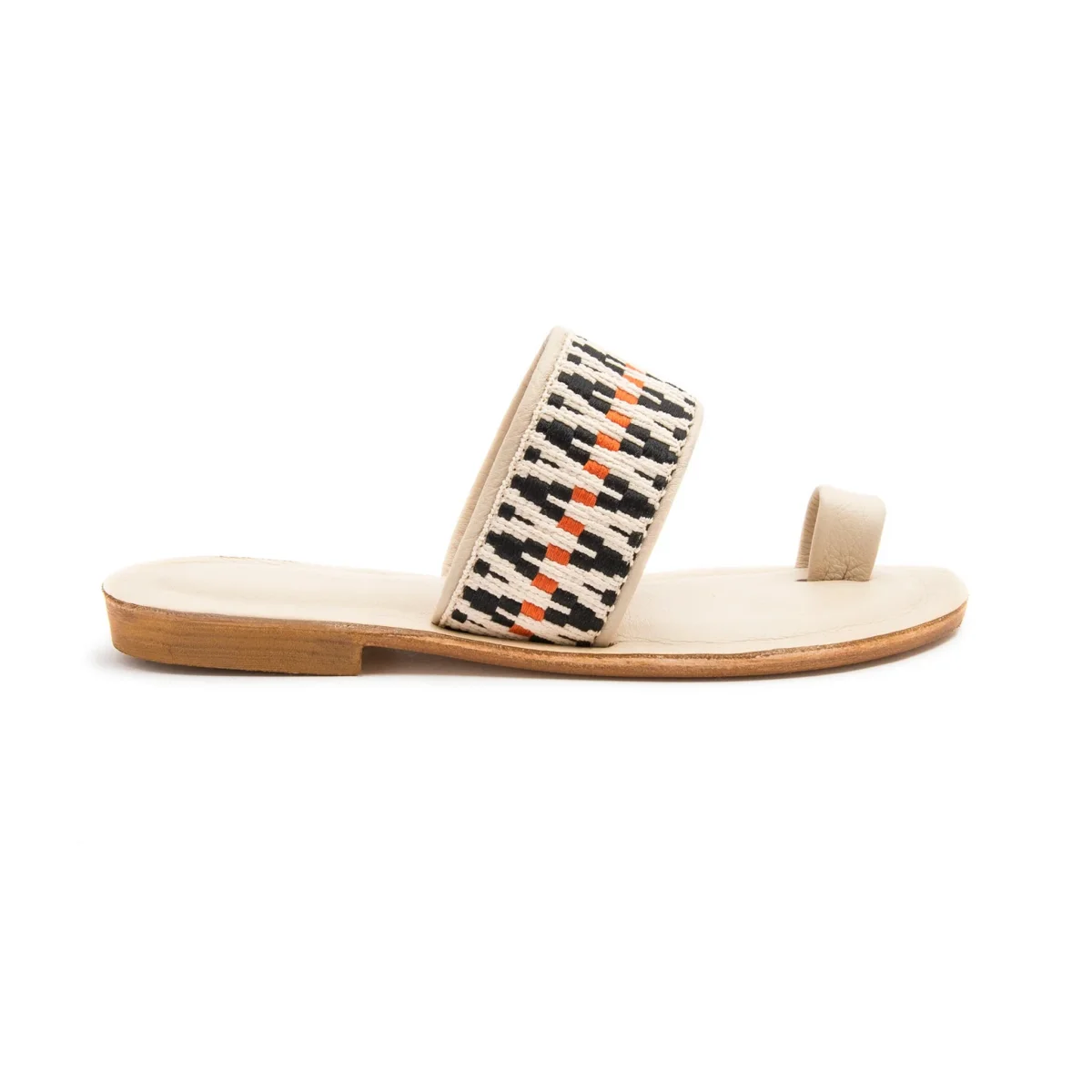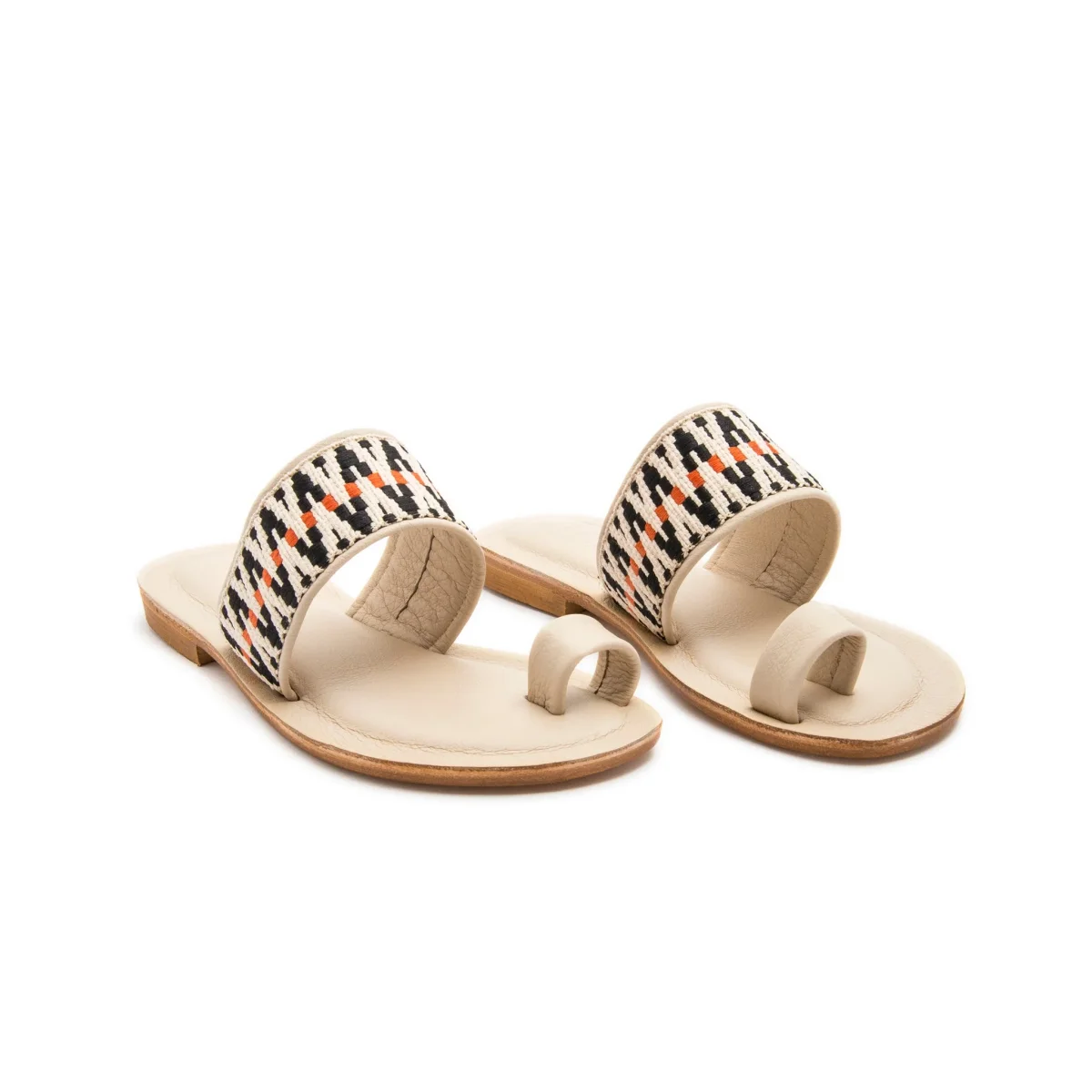 Sandalo infradito con fascia larga in nastro etnico cotoniero con motivo boho jaquard profilata in morbida pelle pieno fiore.