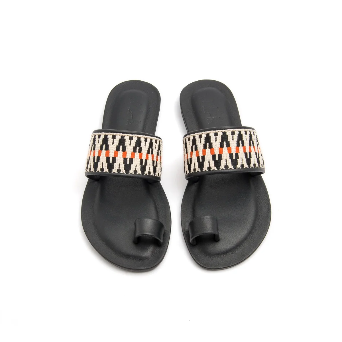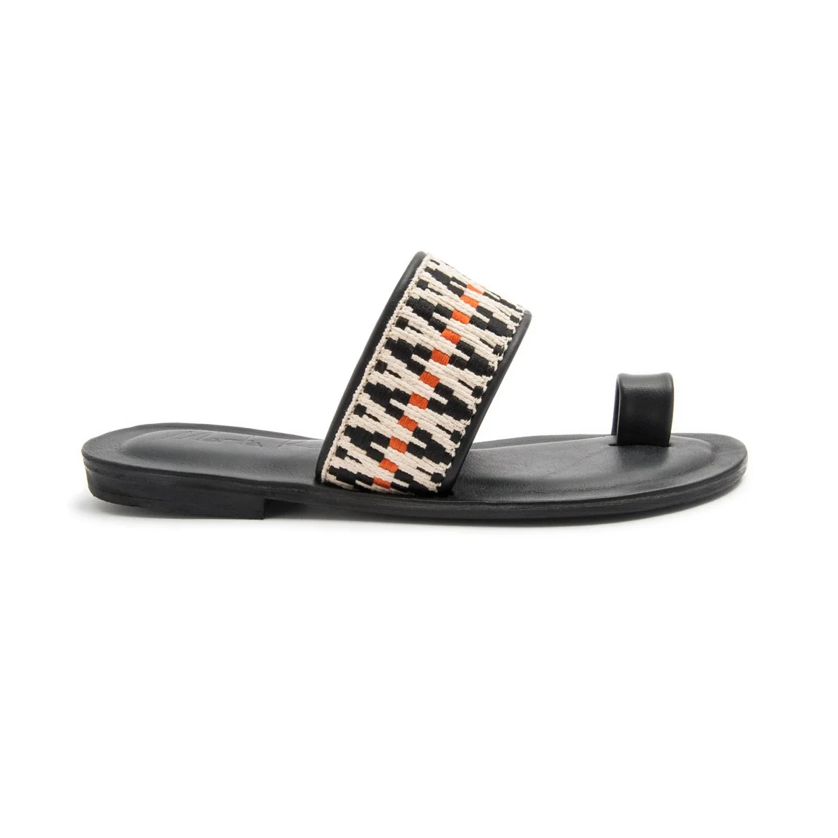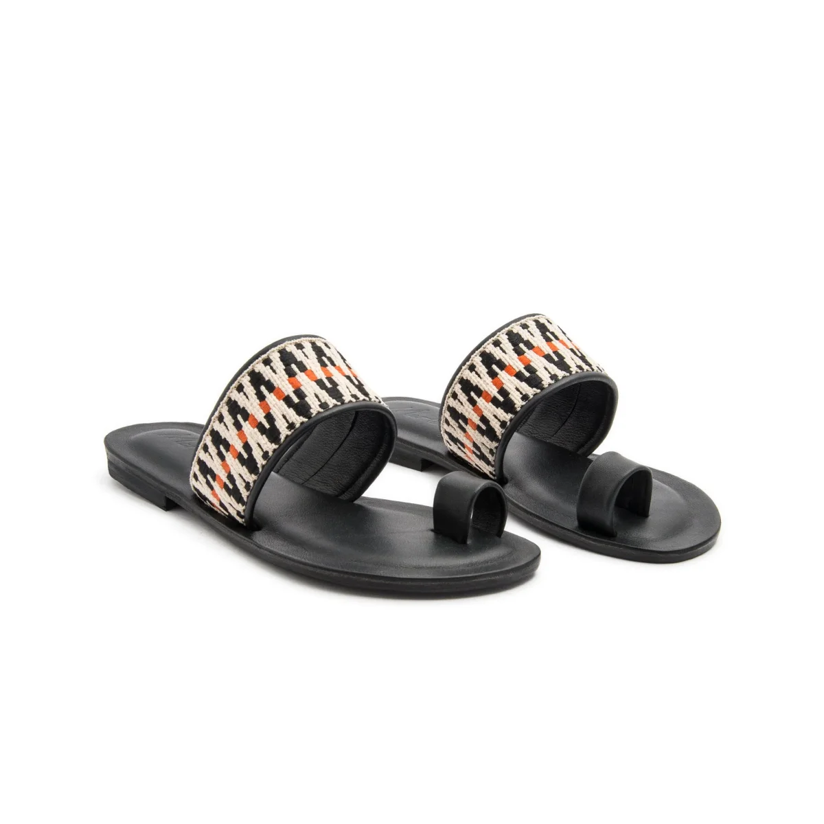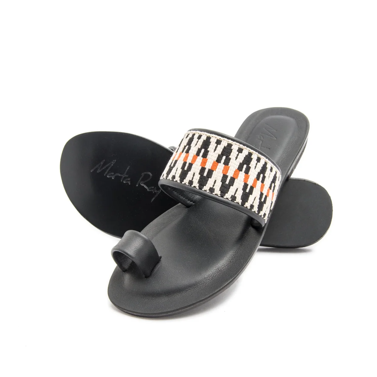 Sandalo infradito con fascia larga in nastro etnico cotoniero con motivo boho jaquard profilata in morbida pelle pieno fiore.