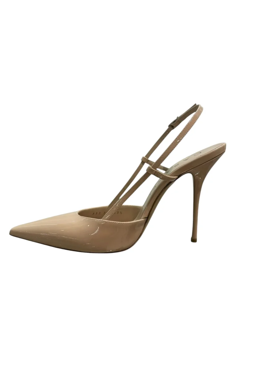 Décolleté chanel in vernice nude, fondo cuoio, altezza tacco 11cm