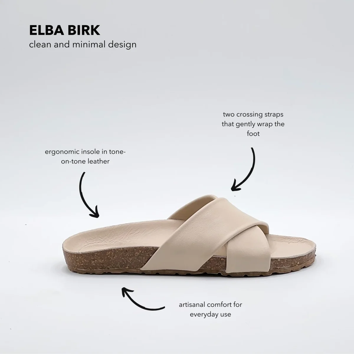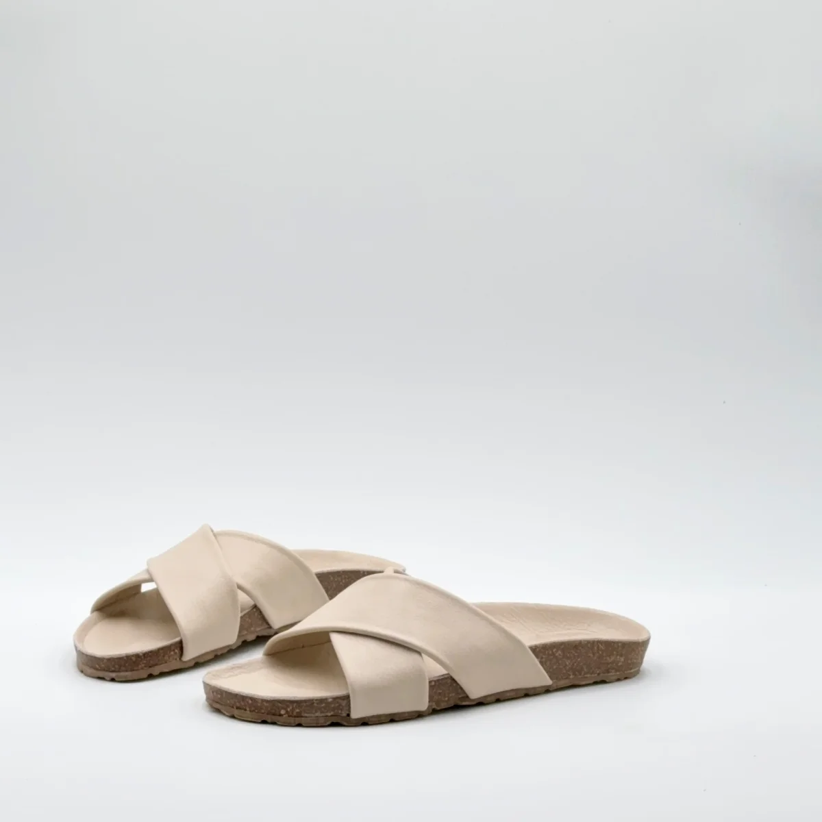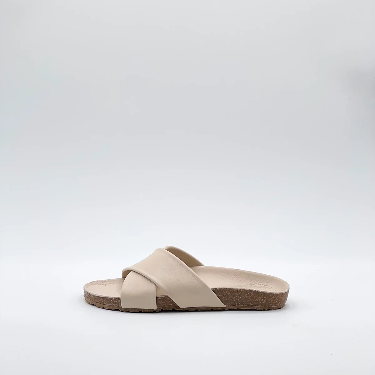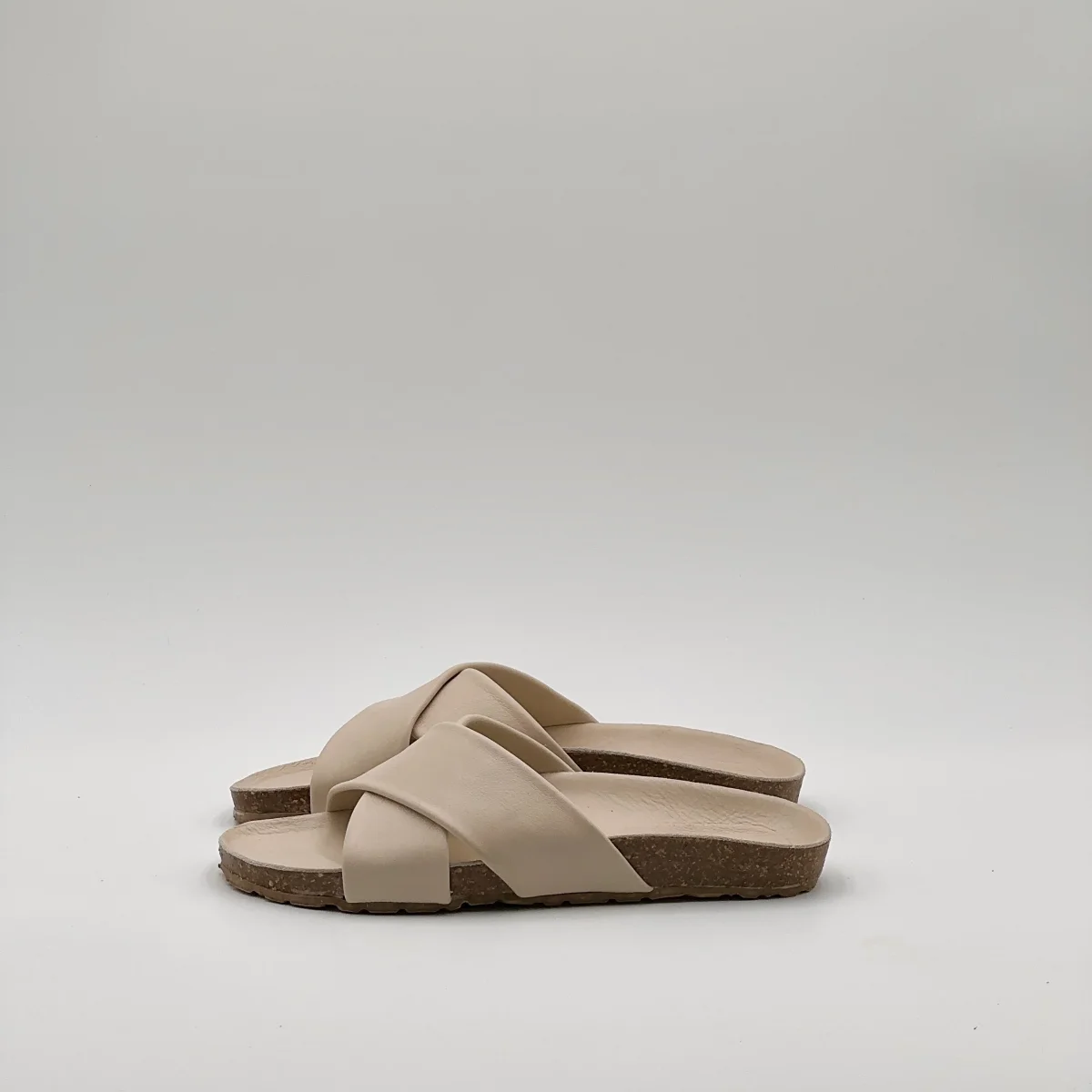 Sandalo flat in pelle Mousse color latte macchiato, con suola ergonomica rivestita nello stesso materiale. Due fasce incrociate accolgono il piede con morbidezza.Leggero, artigianale, perfetto per la stagione calda.