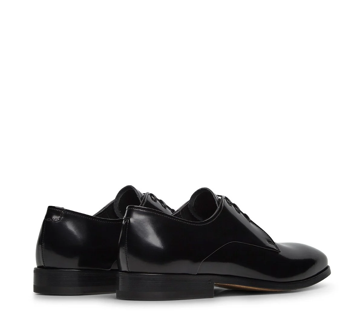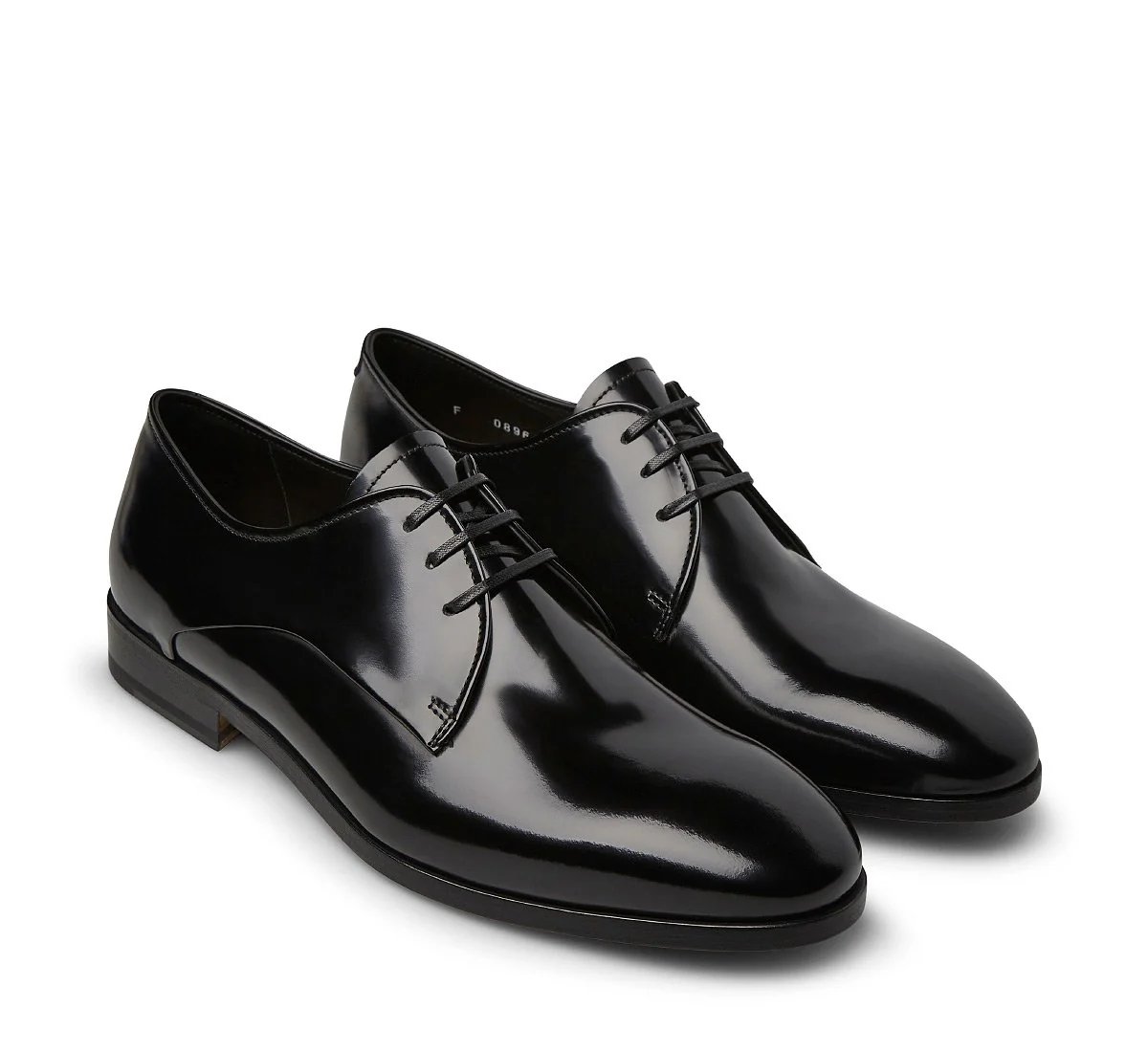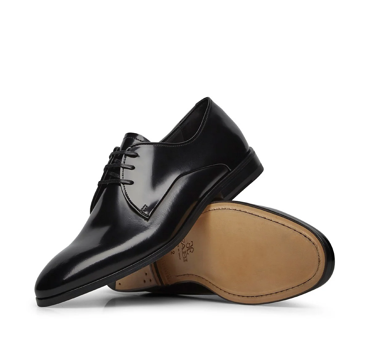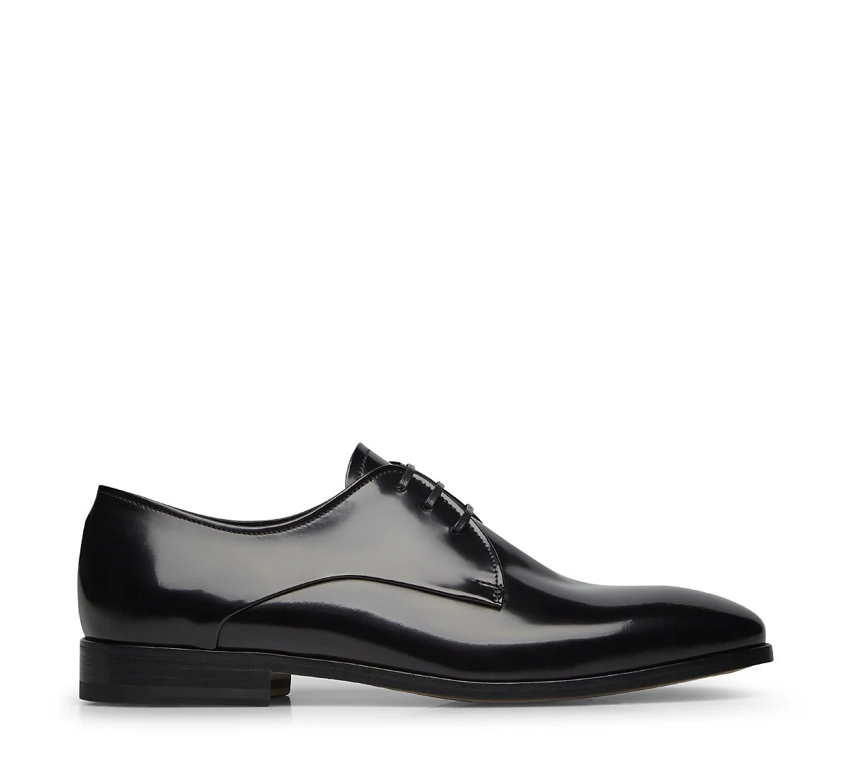 Derby liscio realizzato in pregiato vitello spazzolato e completato da un morbidissimo fondo in cuoio.