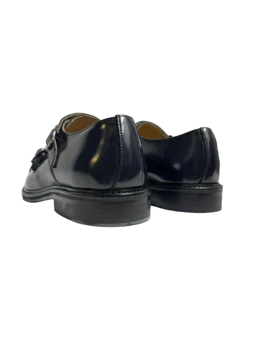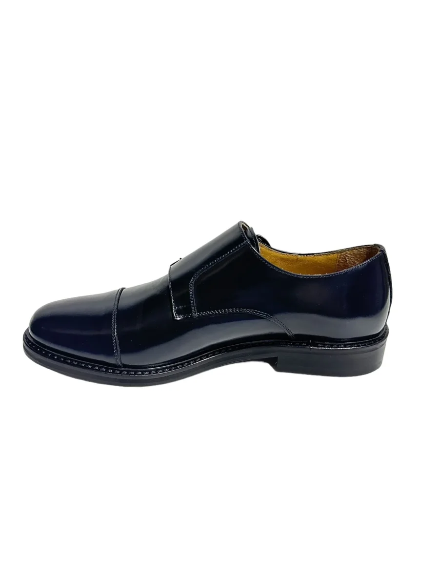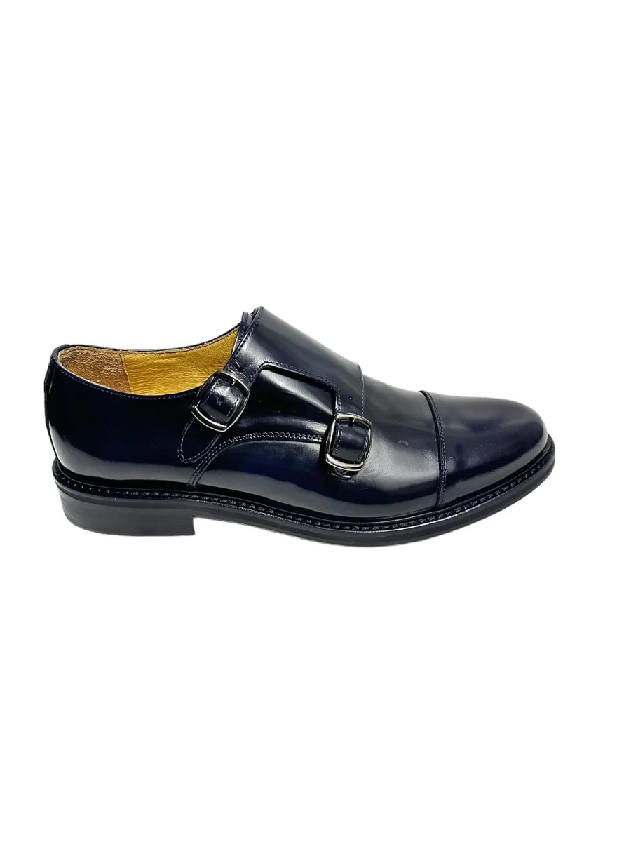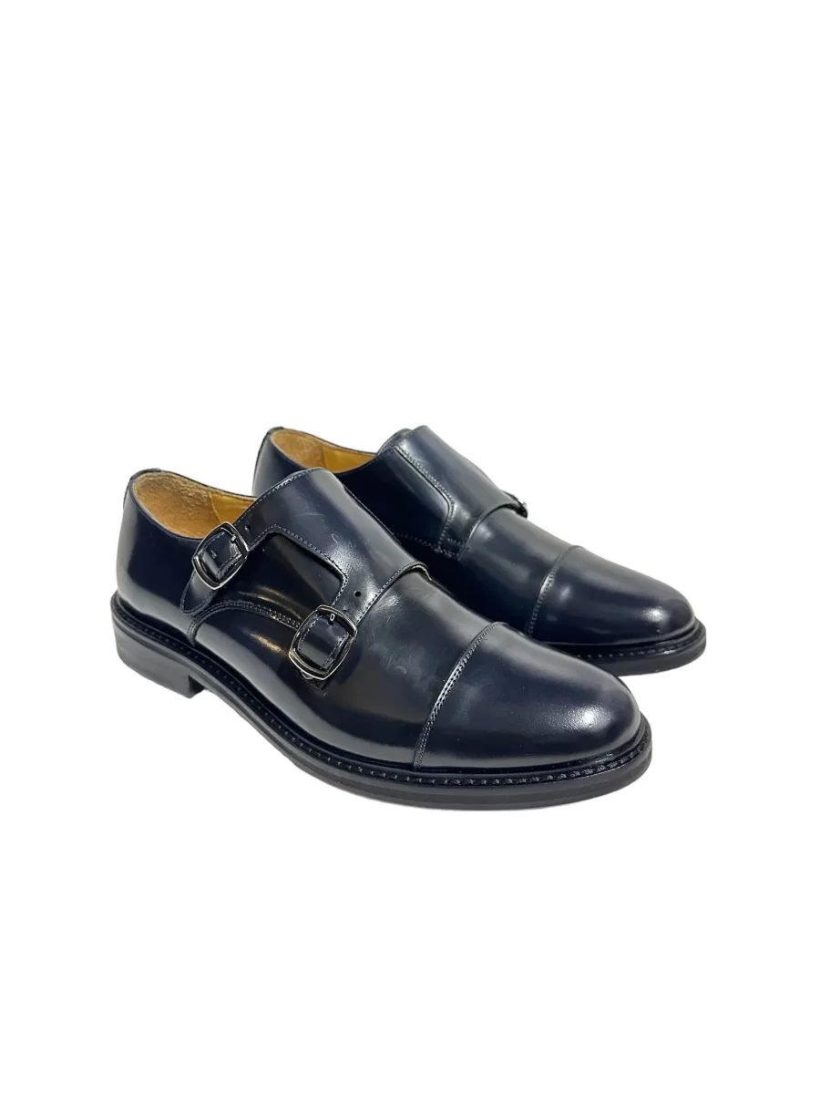 Mocassino abrasivato doppia fibbia in pelle blu con fondo cuoio antiscivolo