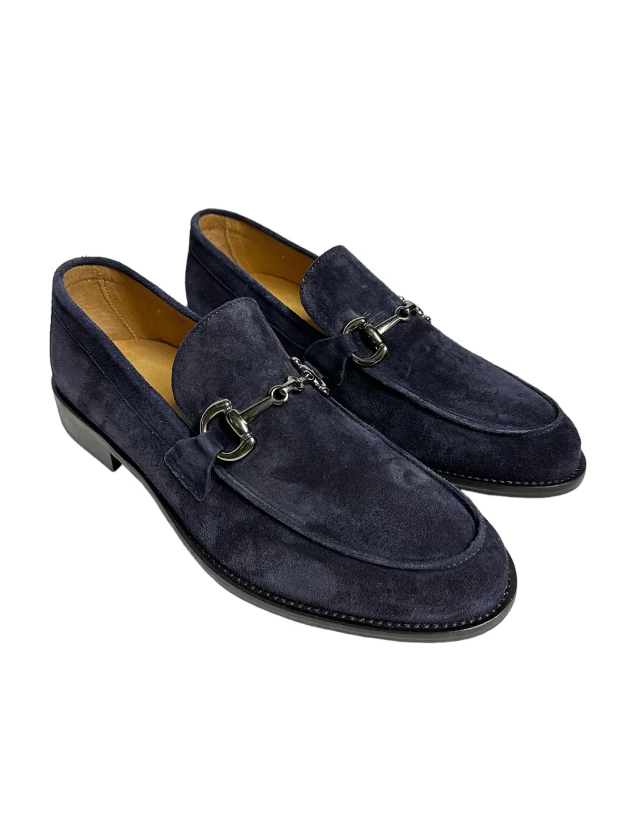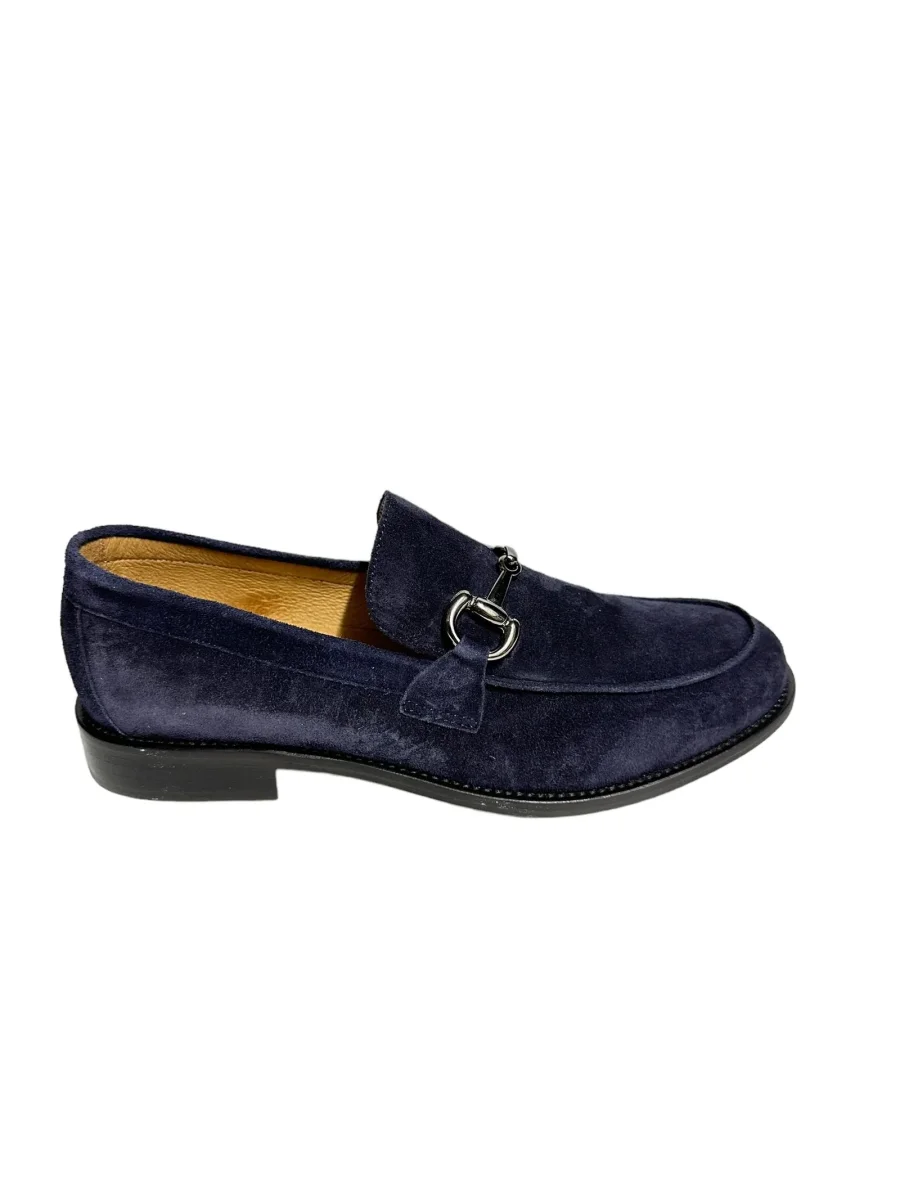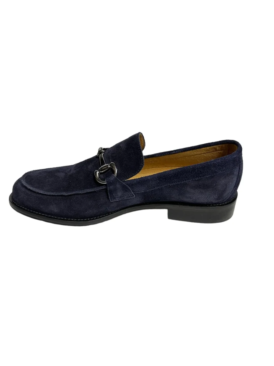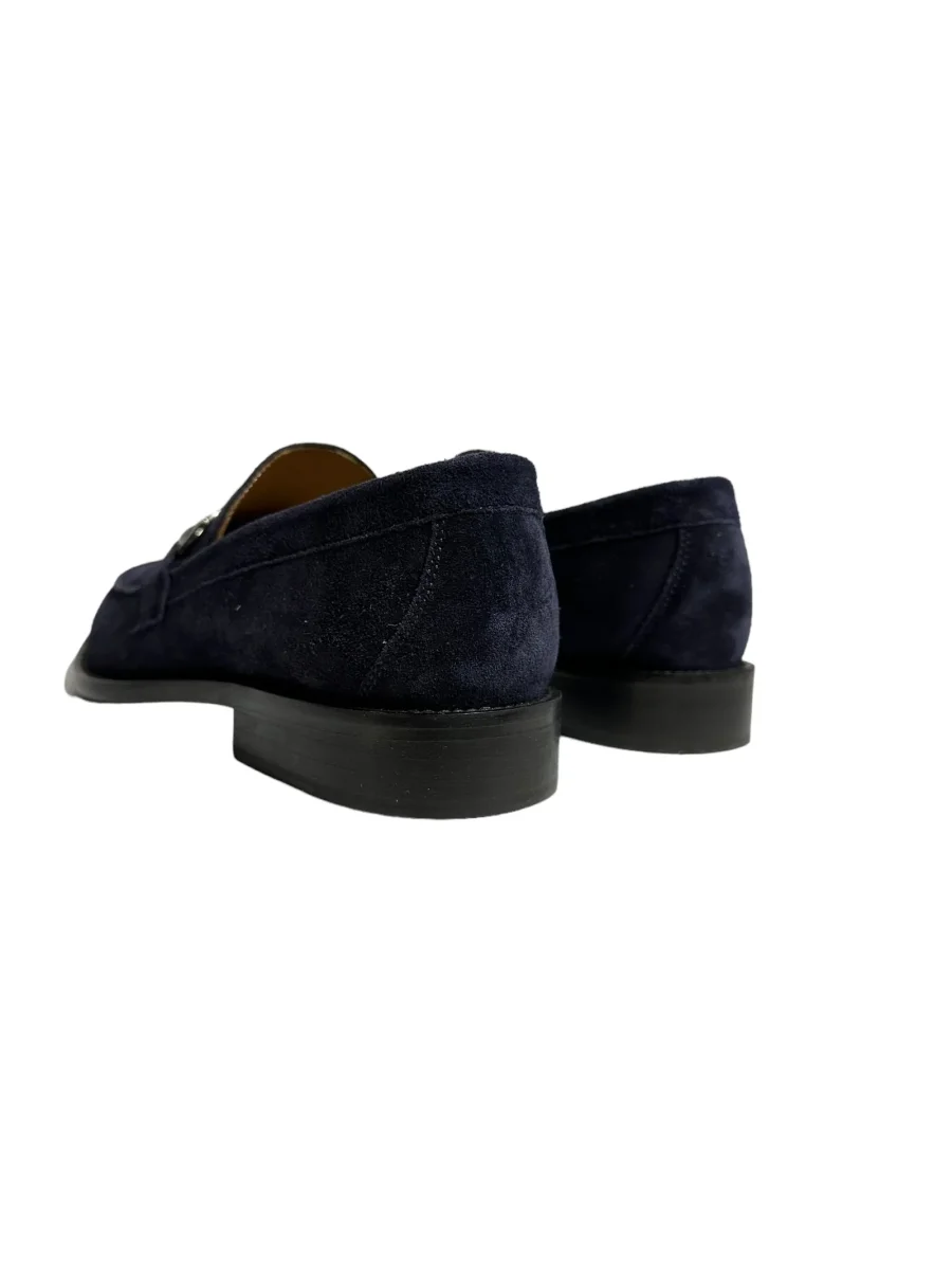 Mocassino in camoscio blu con accessorio, fondo in cuoio con ovalino
