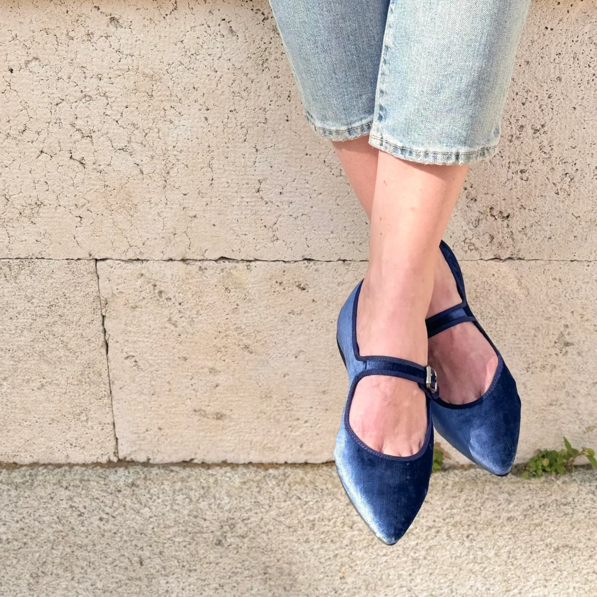 Comoda Scarpetta rialzata Mary Jane in velluto perlato mosso.