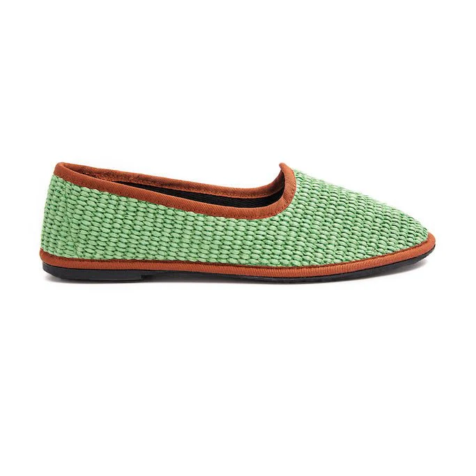 Friulana a punta tonda. Realizzata in rafia intrecciata stuoia, bordata in contrasto di colore. Lavorazione a sacchetto con sottopiede in pelle. Fondo in gomma antiscivolo. Facili da indossare e da interpretare, ti stupirai quanto questa comoda ciabattina potrà essere un versatile accessorio.