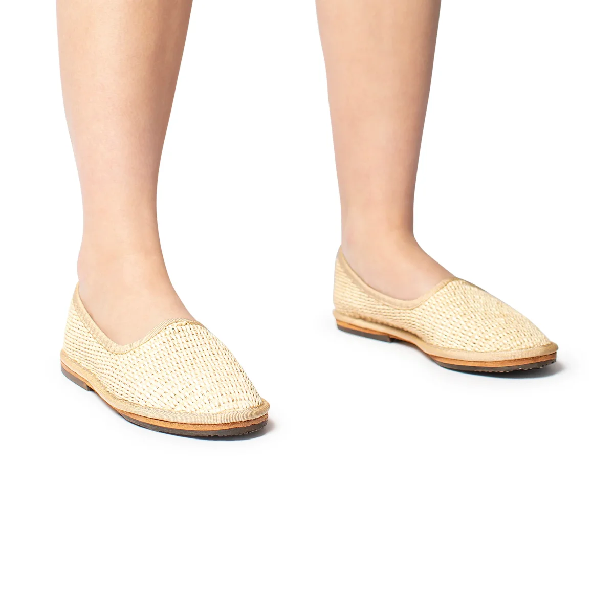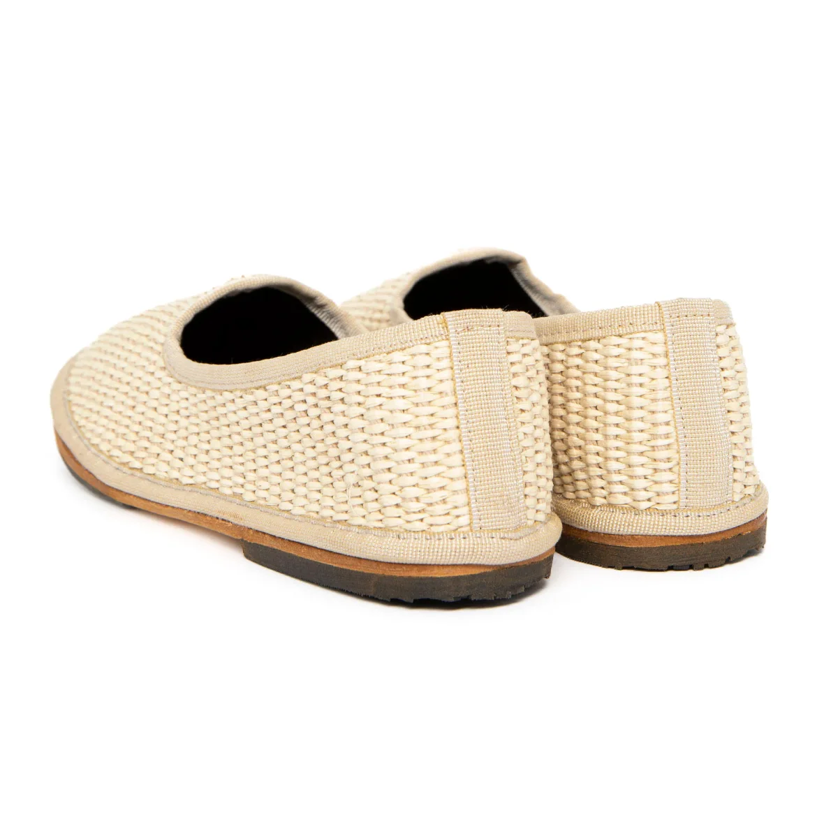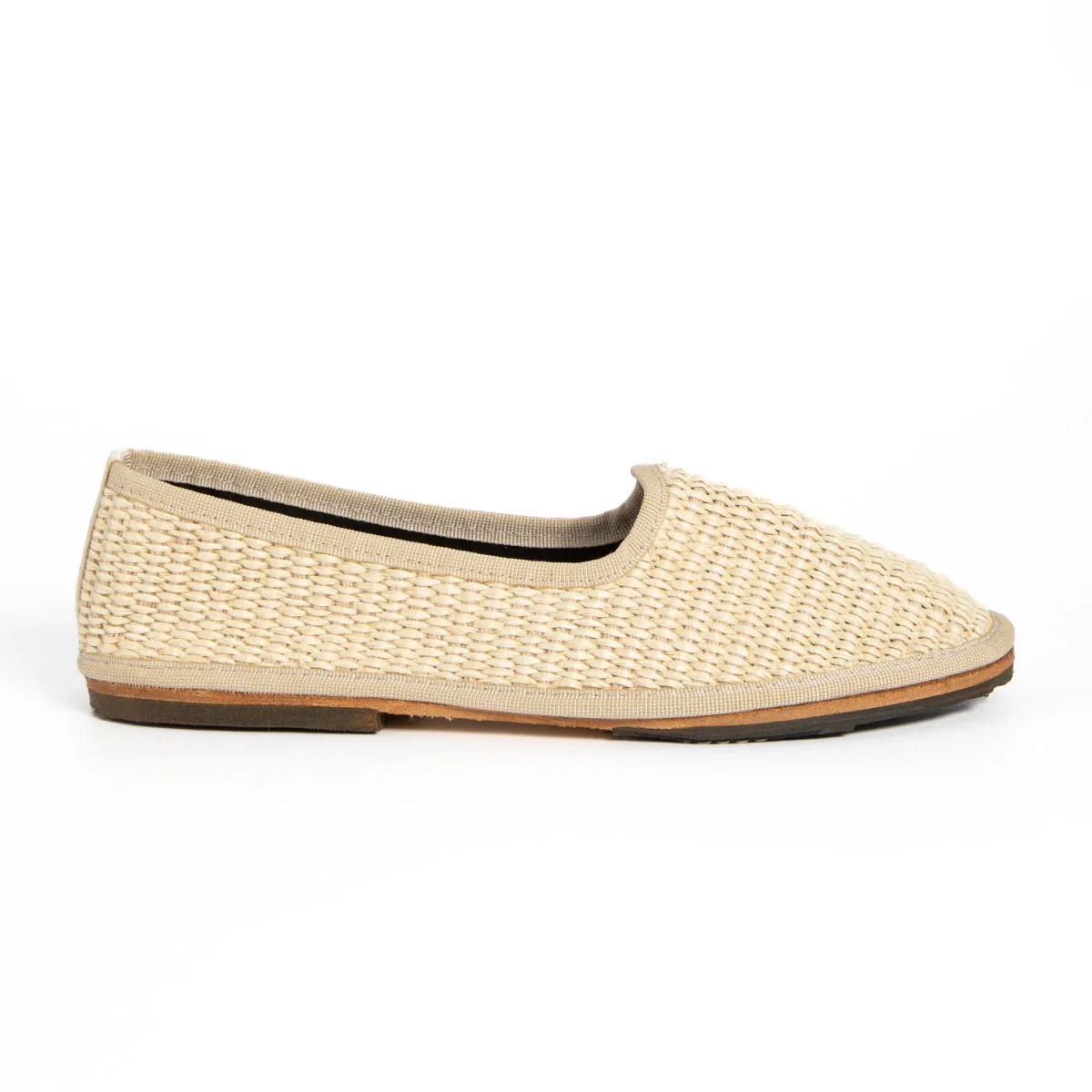 Friulana by Marta Ray “made in tuscany” a punta tonda. Realizzata in rafia. Lavorazione a sacchetto con sottopiede leggermente imbottito in pelle. Fondo originale in cuoio combinato con rinforzi in gomma antiscivolo cuciti.