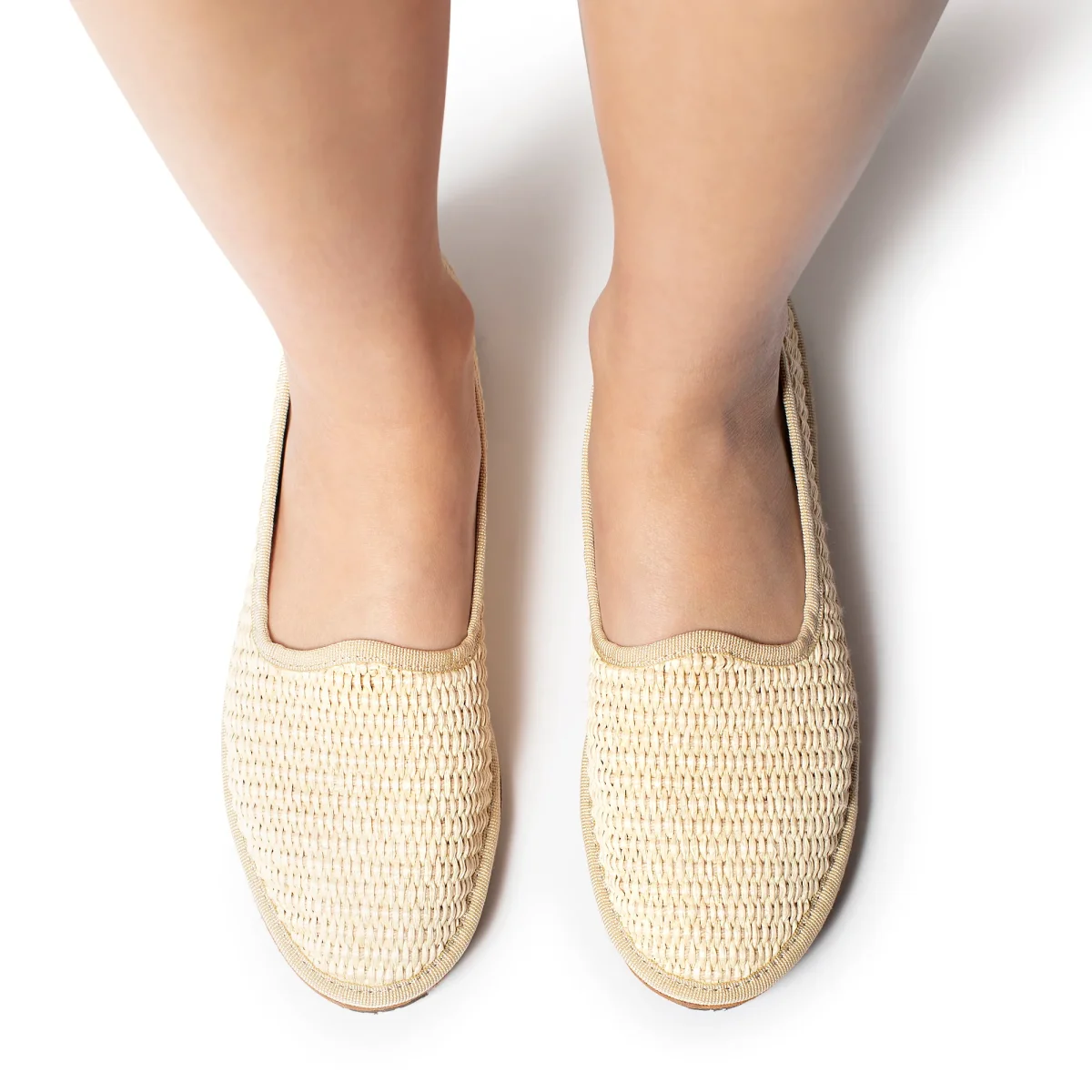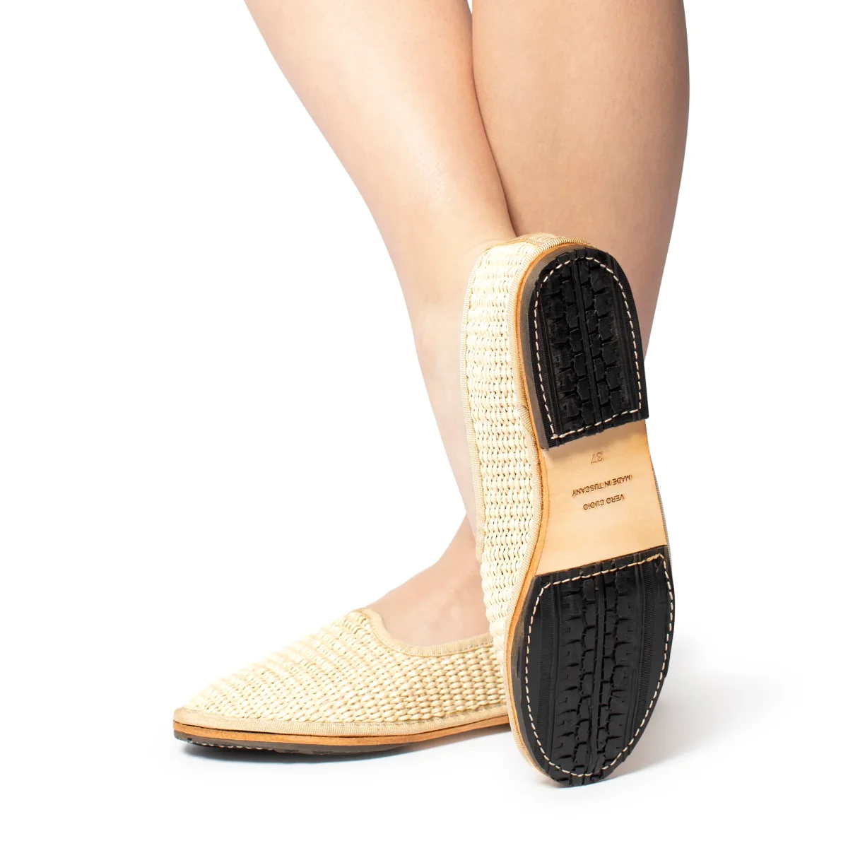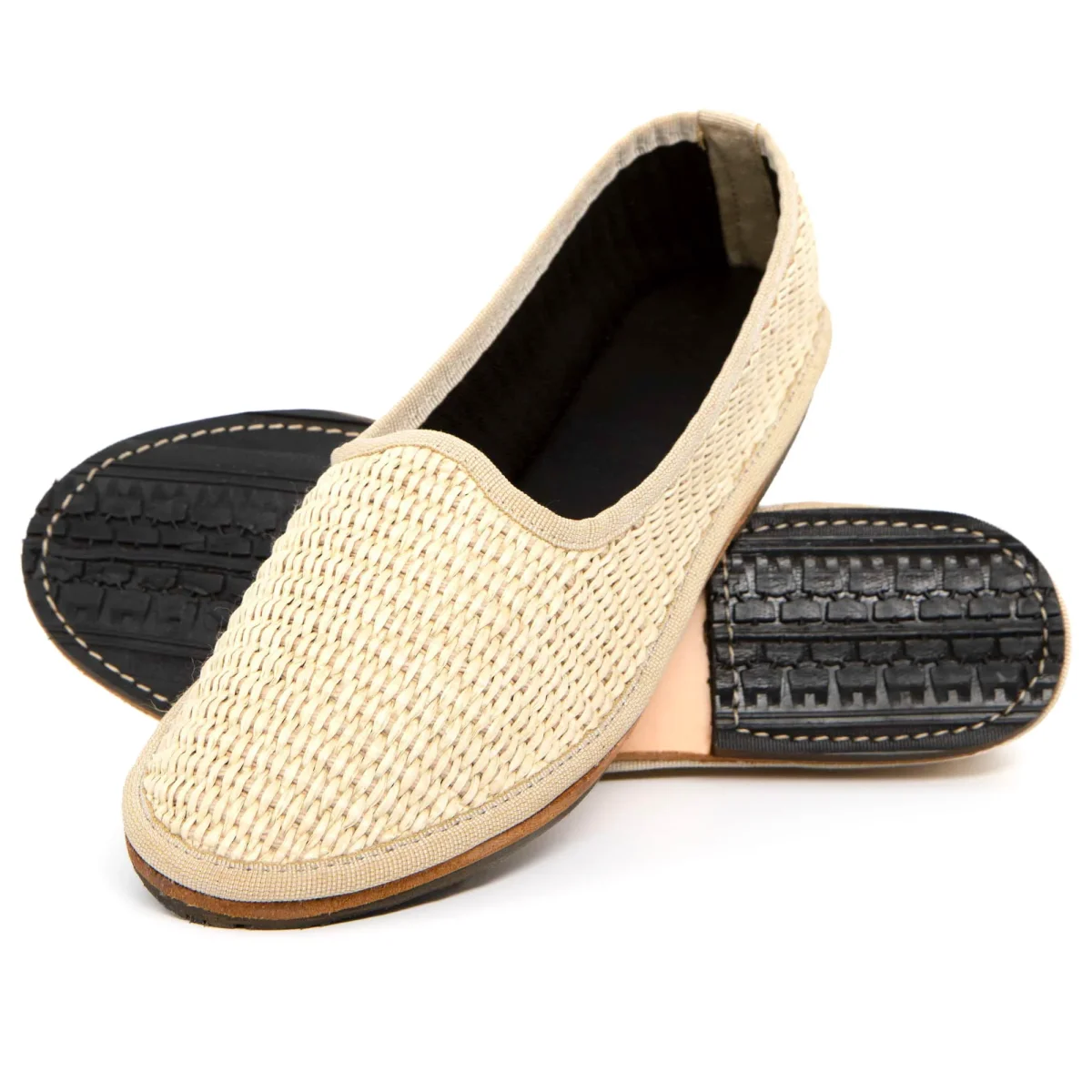 Friulana by Marta Ray “made in tuscany” a punta tonda. Realizzata in rafia. Lavorazione a sacchetto con sottopiede leggermente imbottito in pelle. Fondo originale in cuoio combinato con rinforzi in gomma antiscivolo cuciti.
