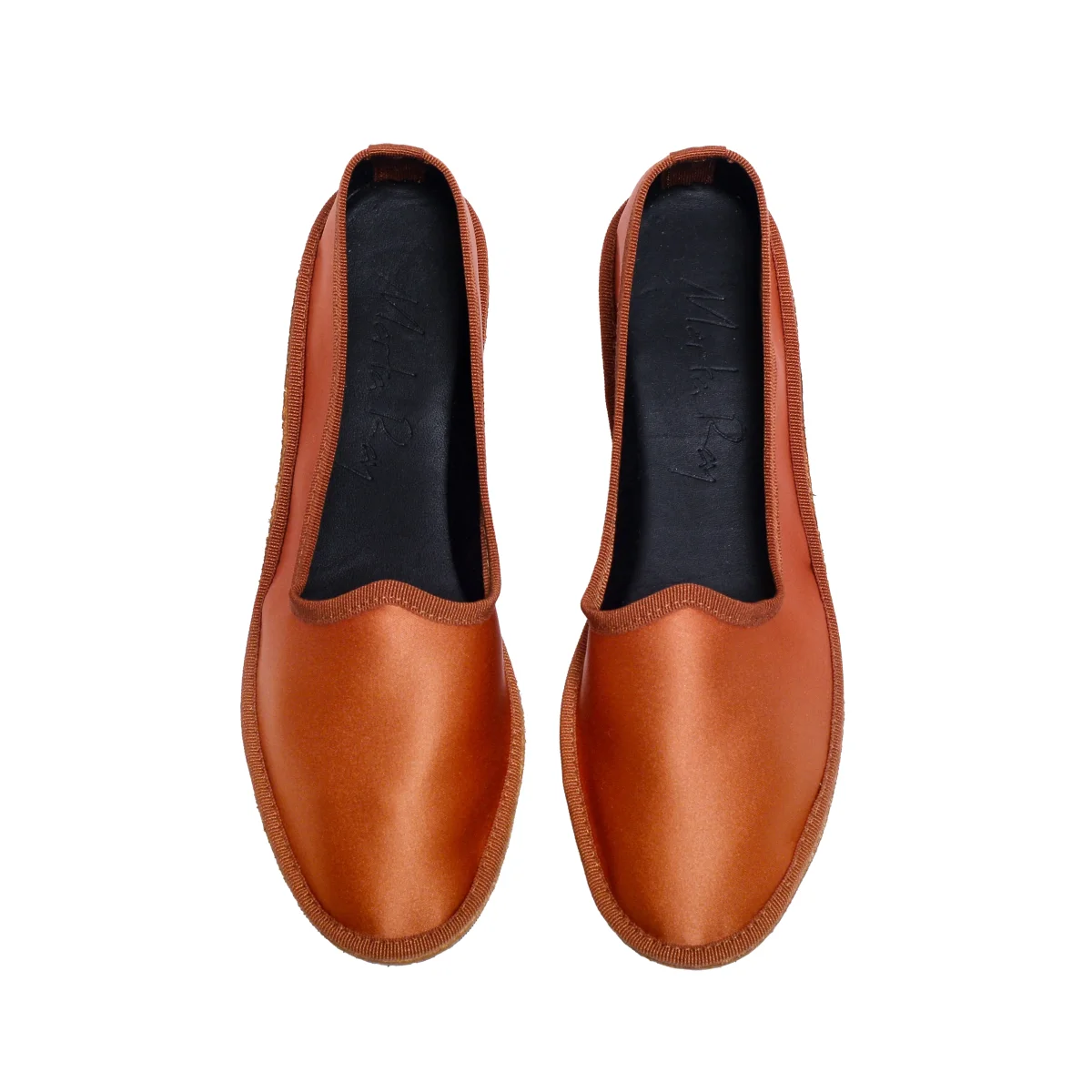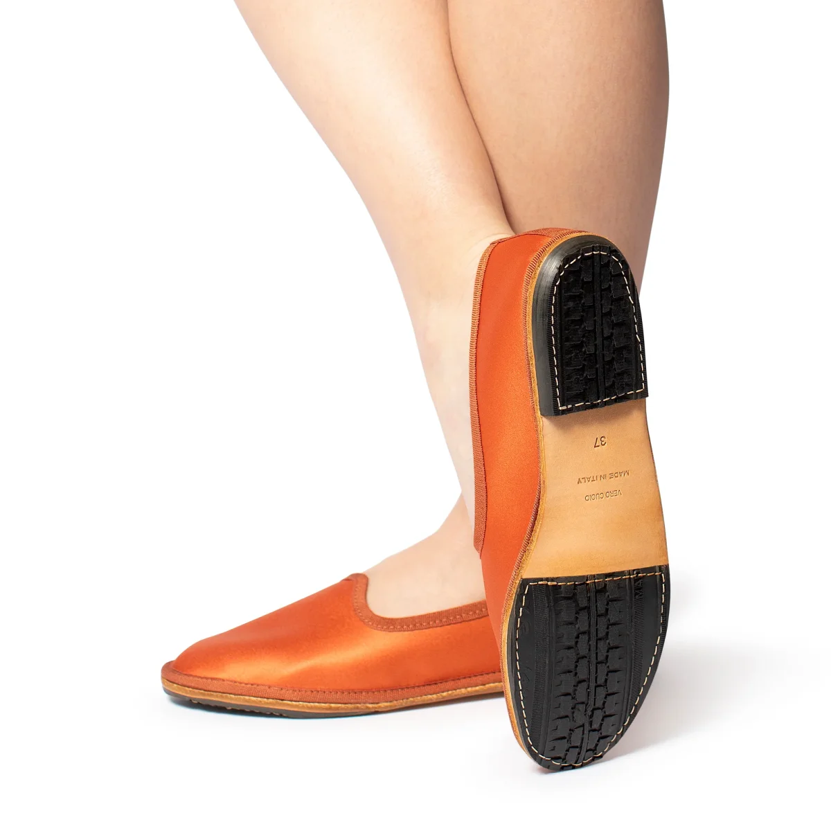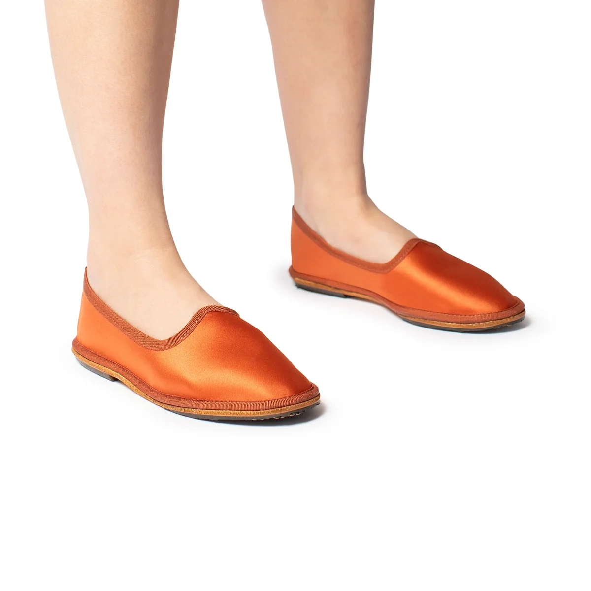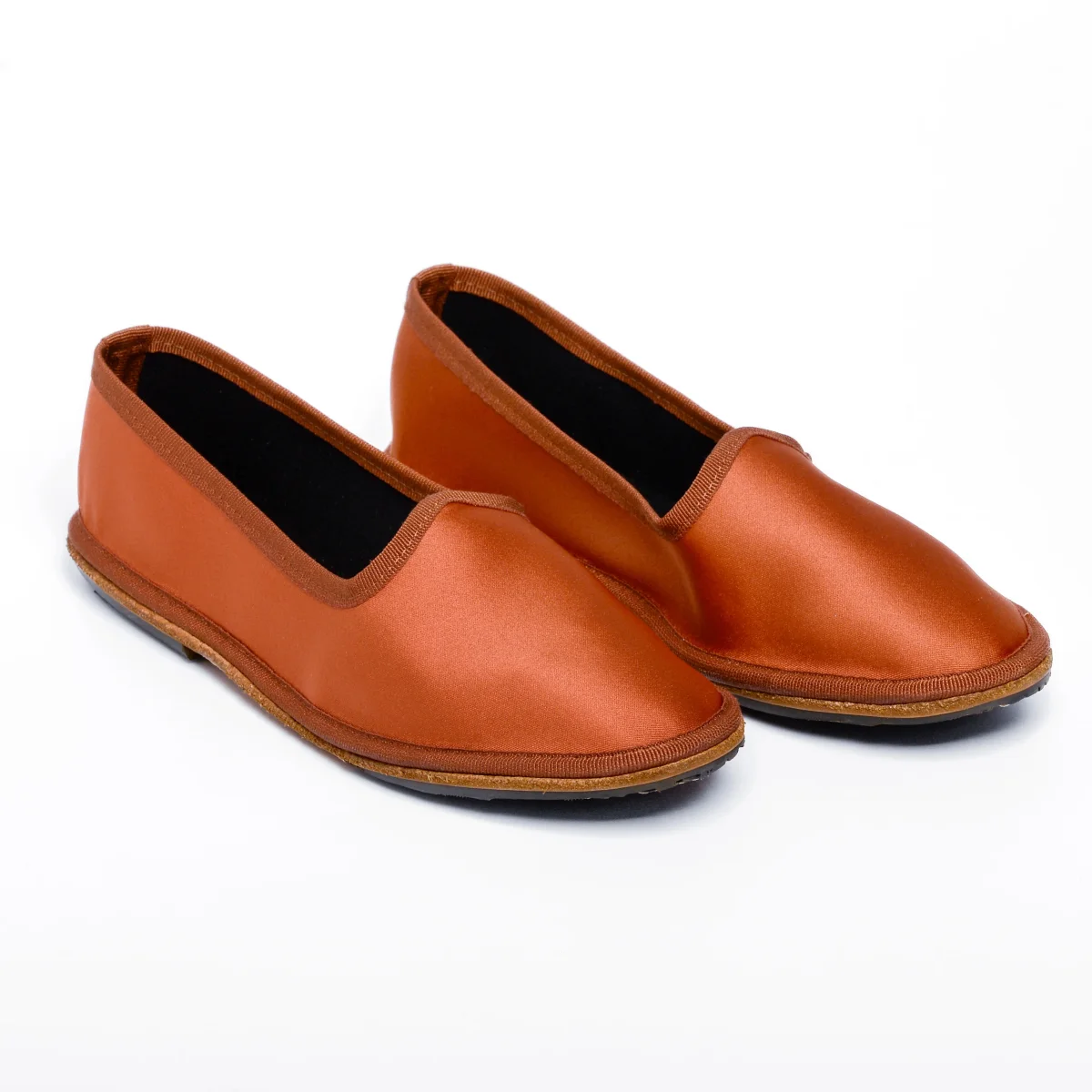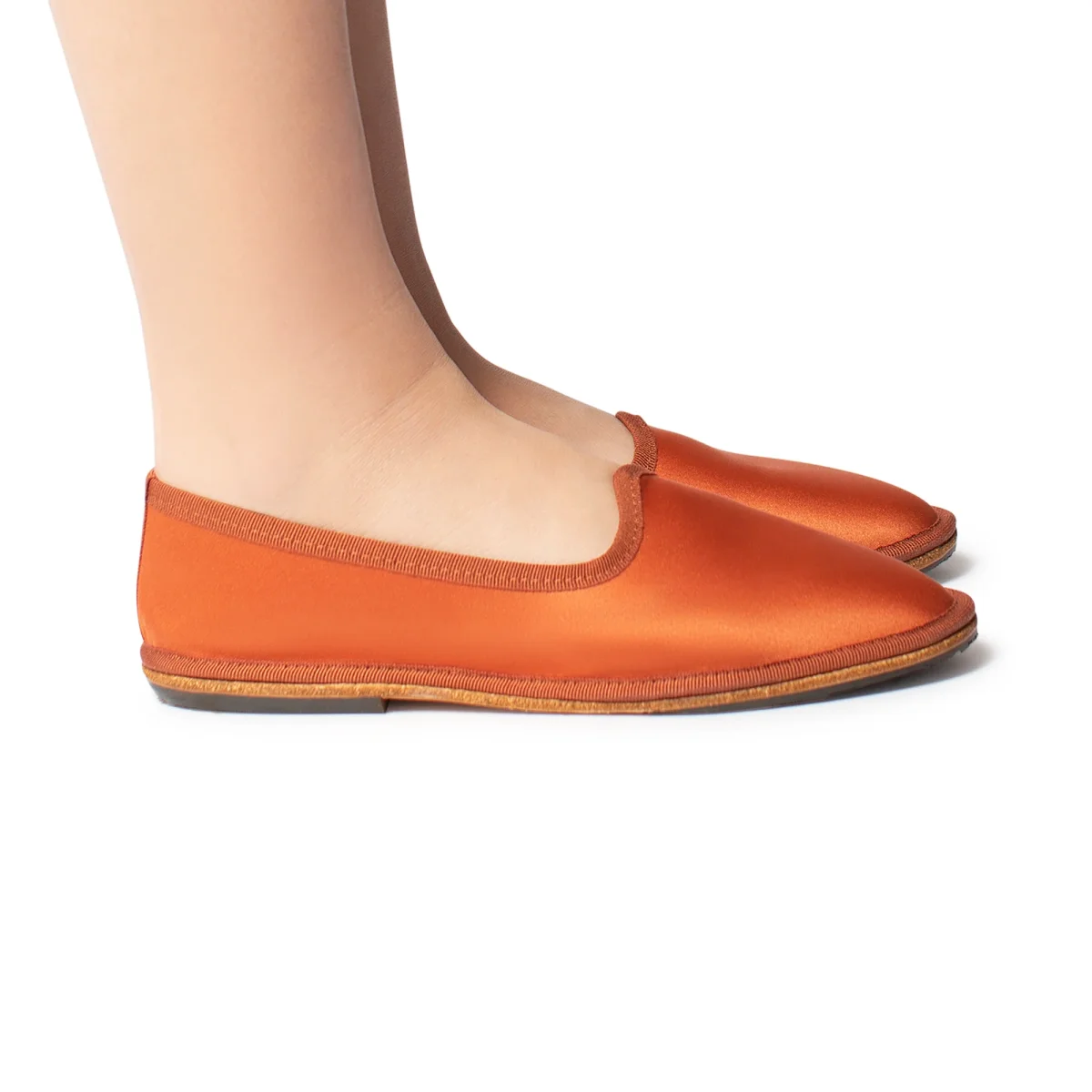 Friulana by Marta Ray “made in tuscany” a punta tonda. Realizzata in raso. Lavorazione a sacchetto con sottopiede leggermente imbottito in pelle. Fondo originale in cuoio combinato con rinforzi in gomma antiscivolo cuciti.