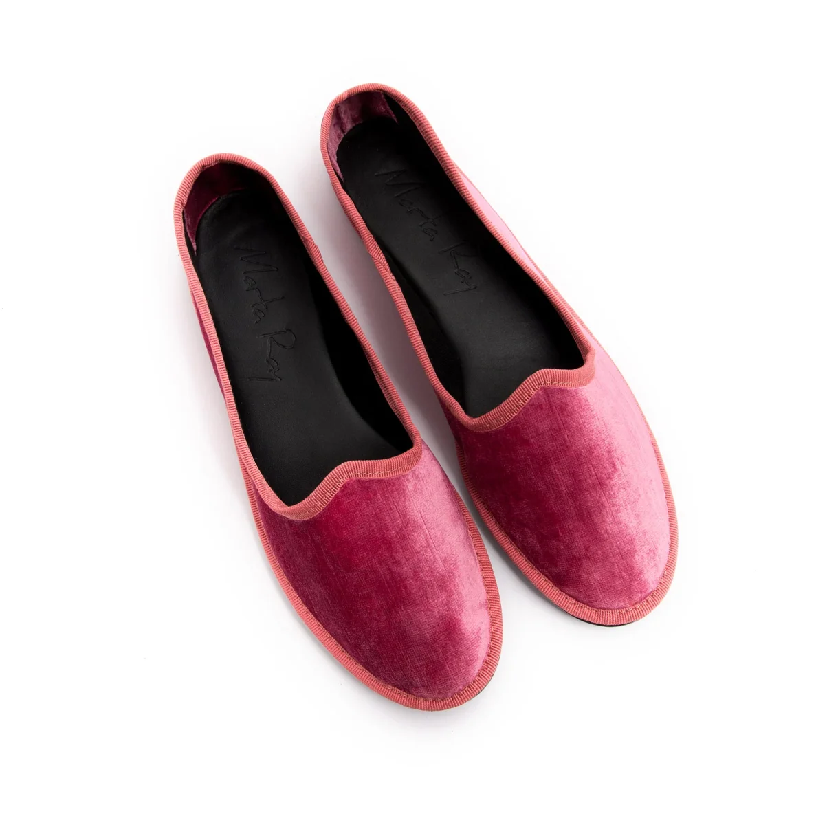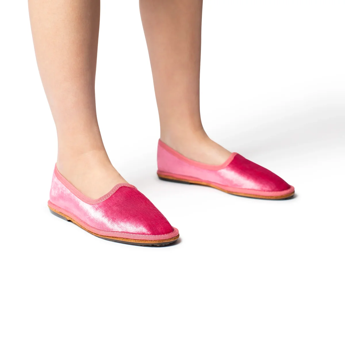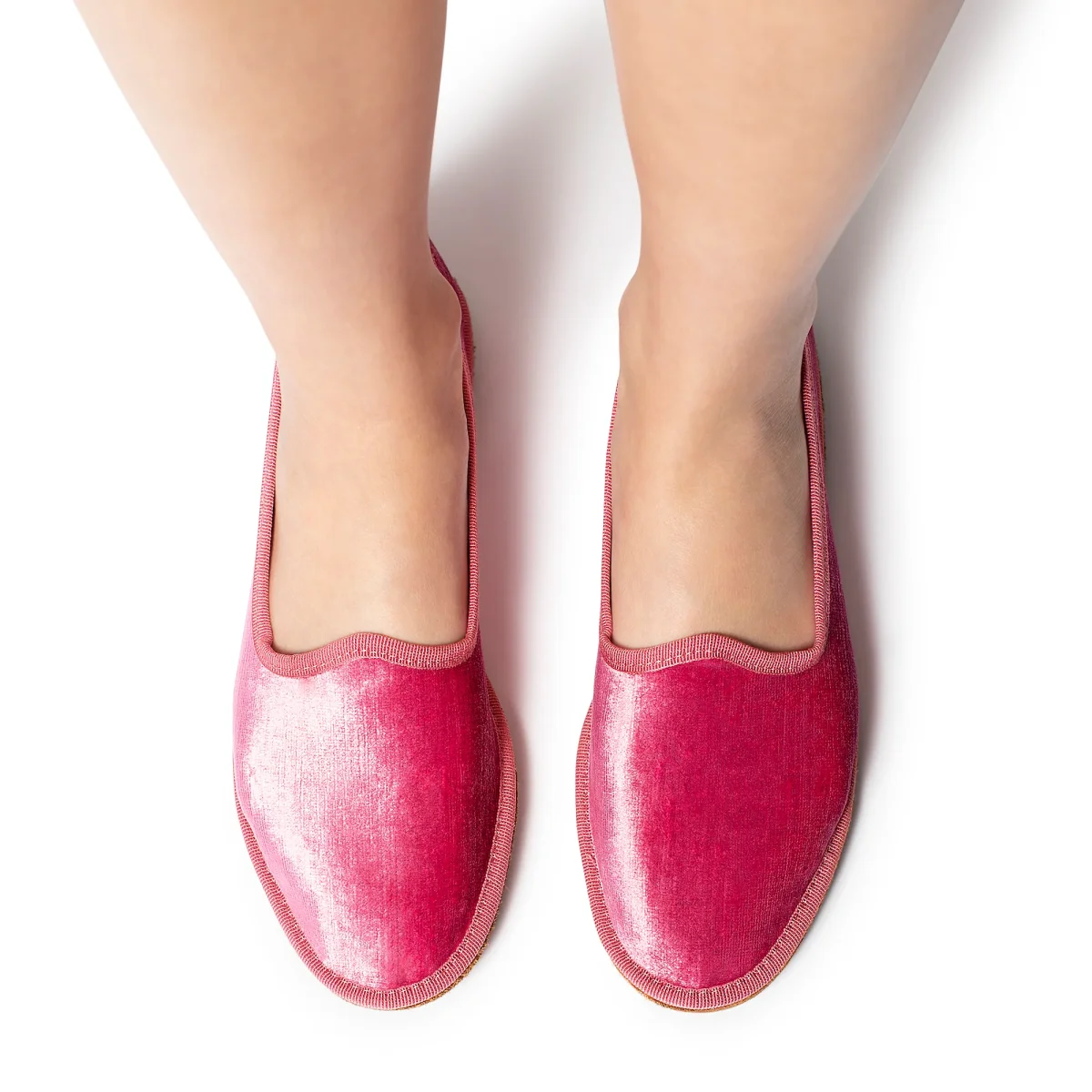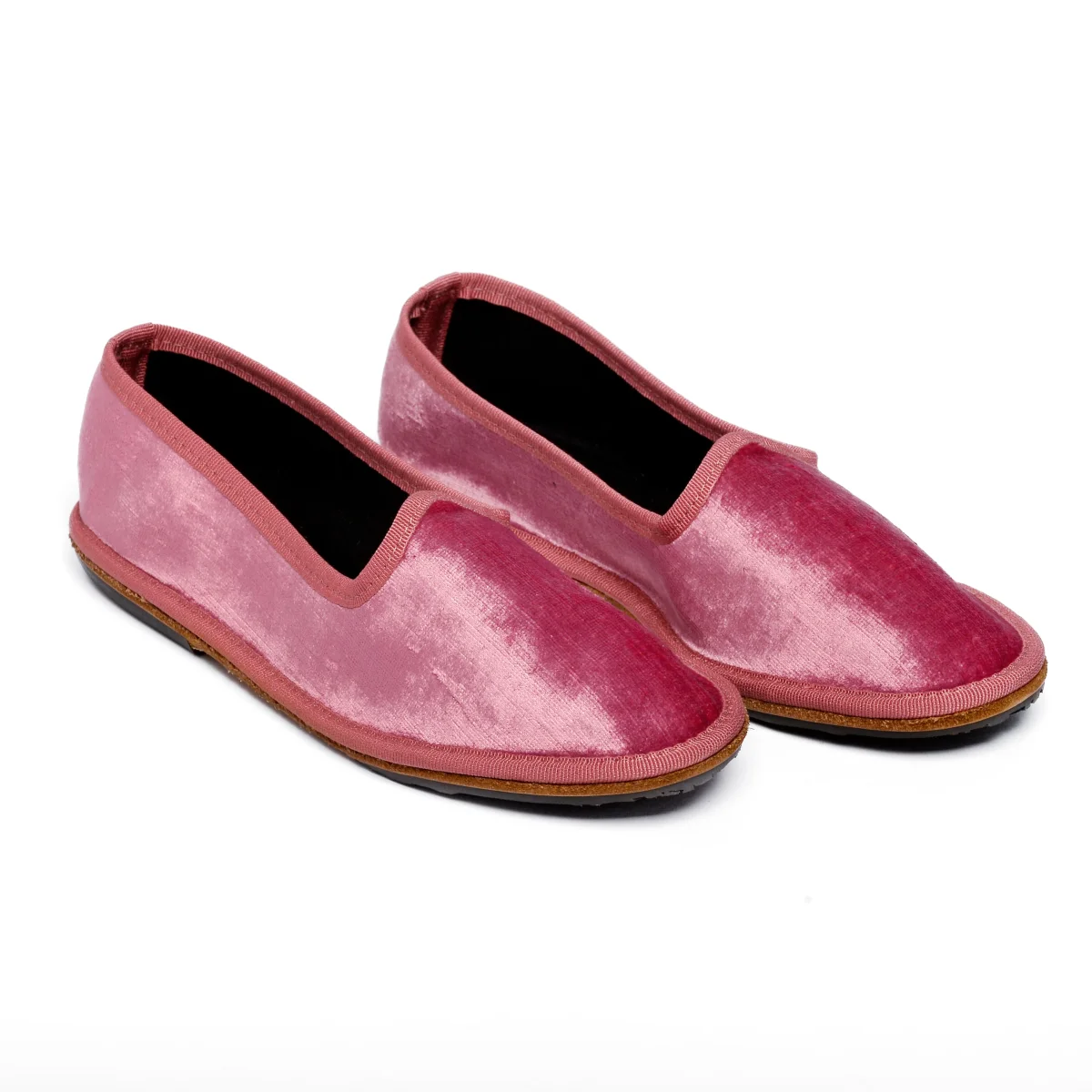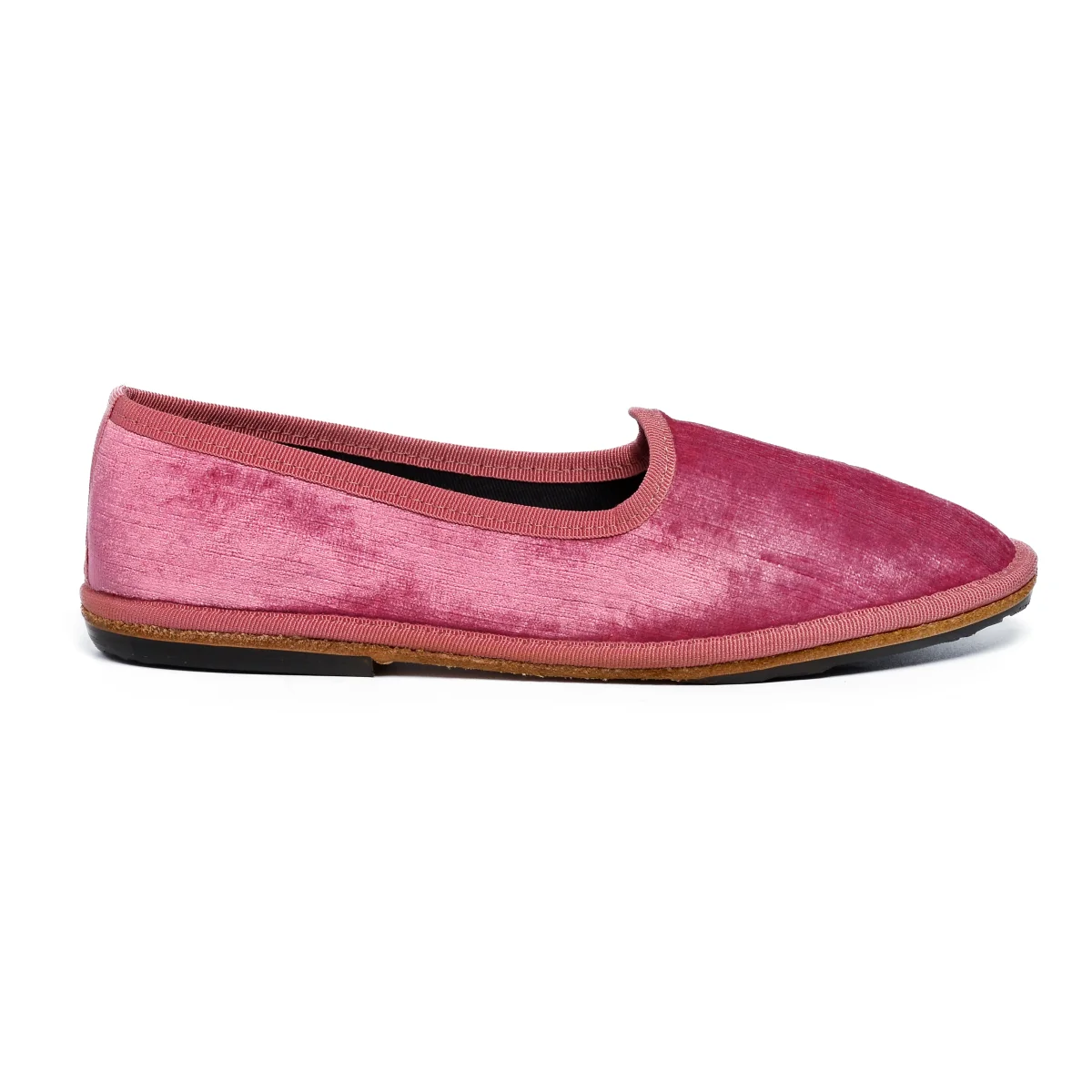 Friulana by Marta Ray “made in tuscany” a punta tonda. Realizzata in velluto perlato. Lavorazione a sacchetto con sottopiede leggermente imbottito in pelle. Fondo originale in cuoio combinato con rinforzi in gomma antiscivolo cuciti.