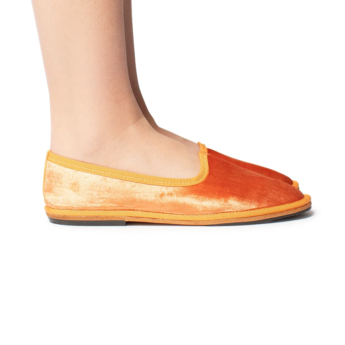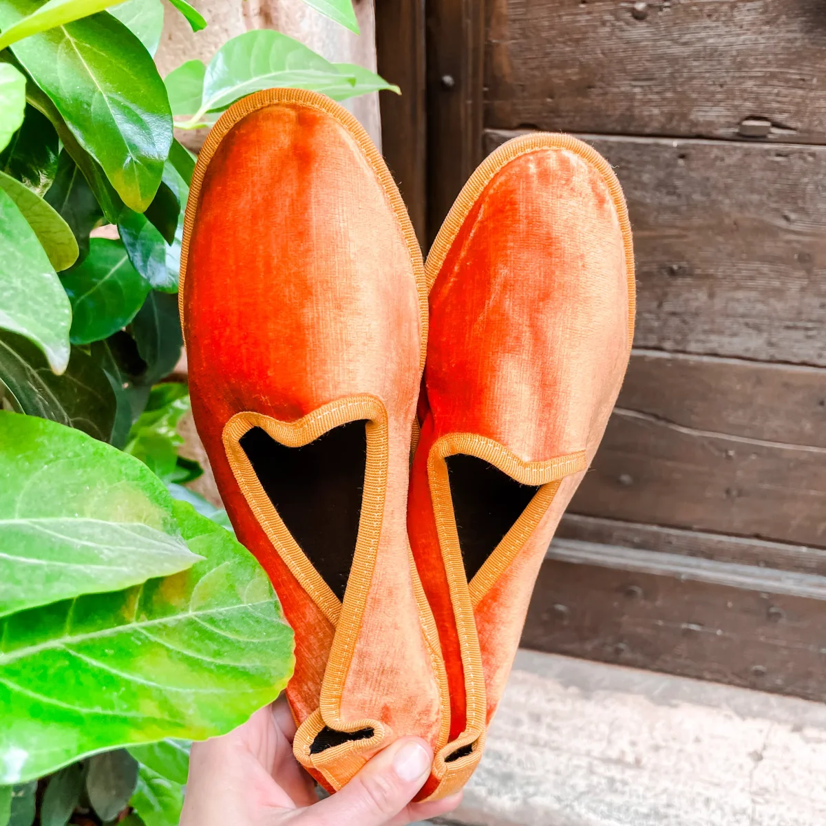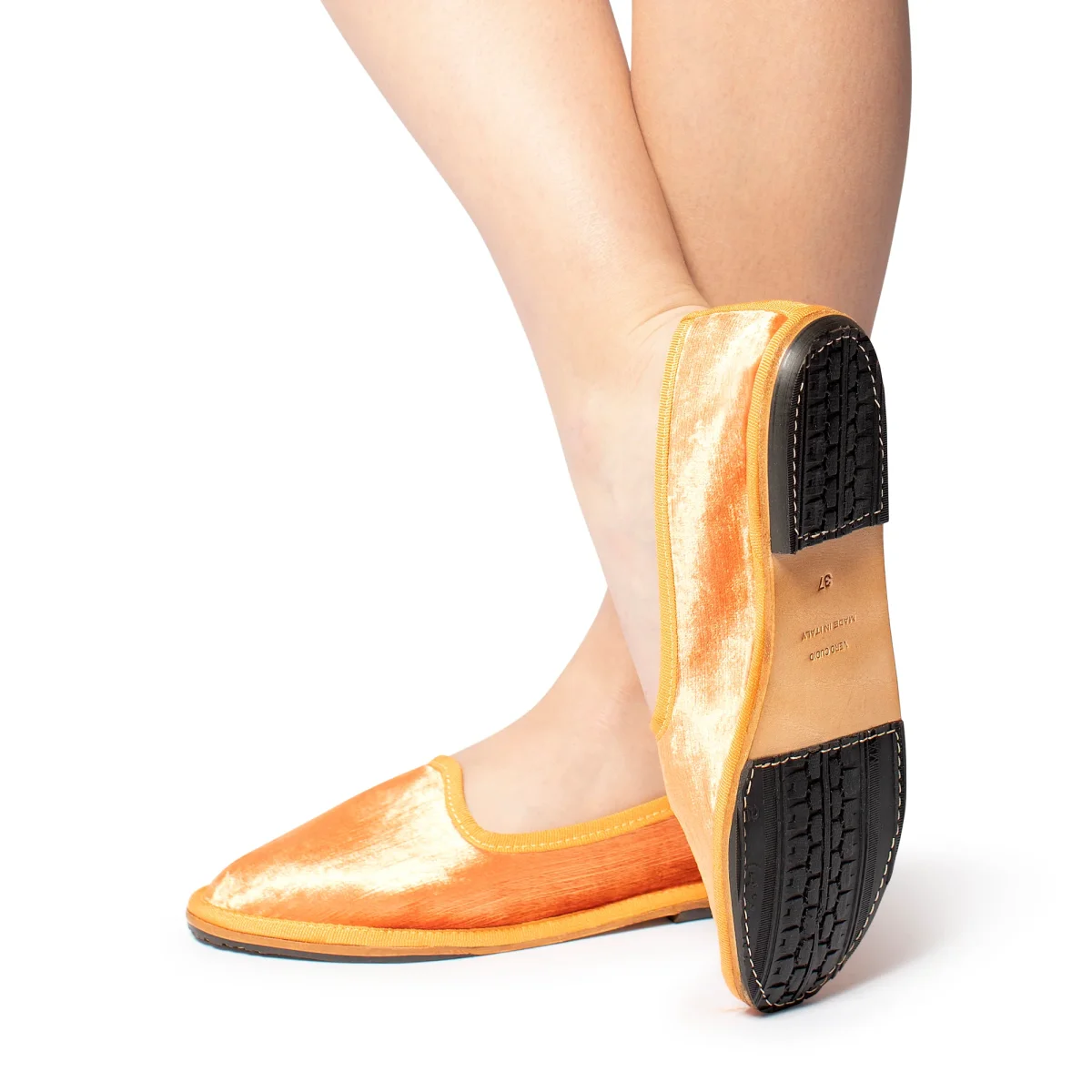 Friulana by Marta Ray “made in tuscany” a punta tonda. Realizzata in velluto perlato. Lavorazione a sacchetto con sottopiede leggermente imbottito in pelle. Fondo originale in cuoio combinato con rinforzi in gomma antiscivolo cuciti.