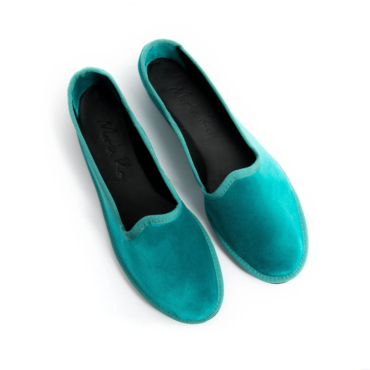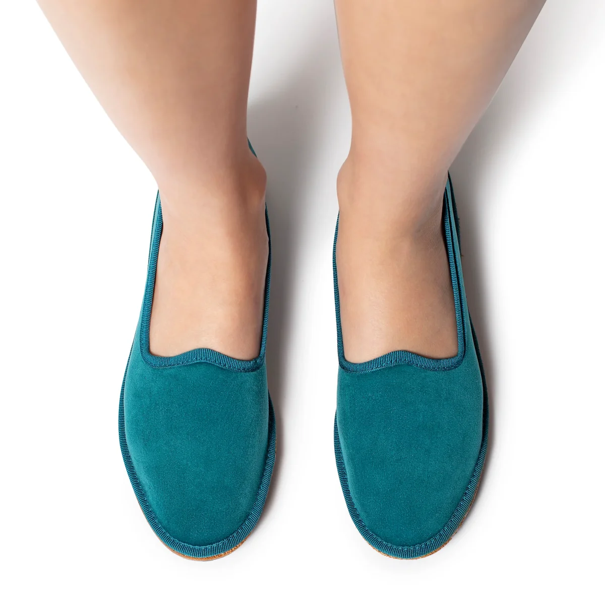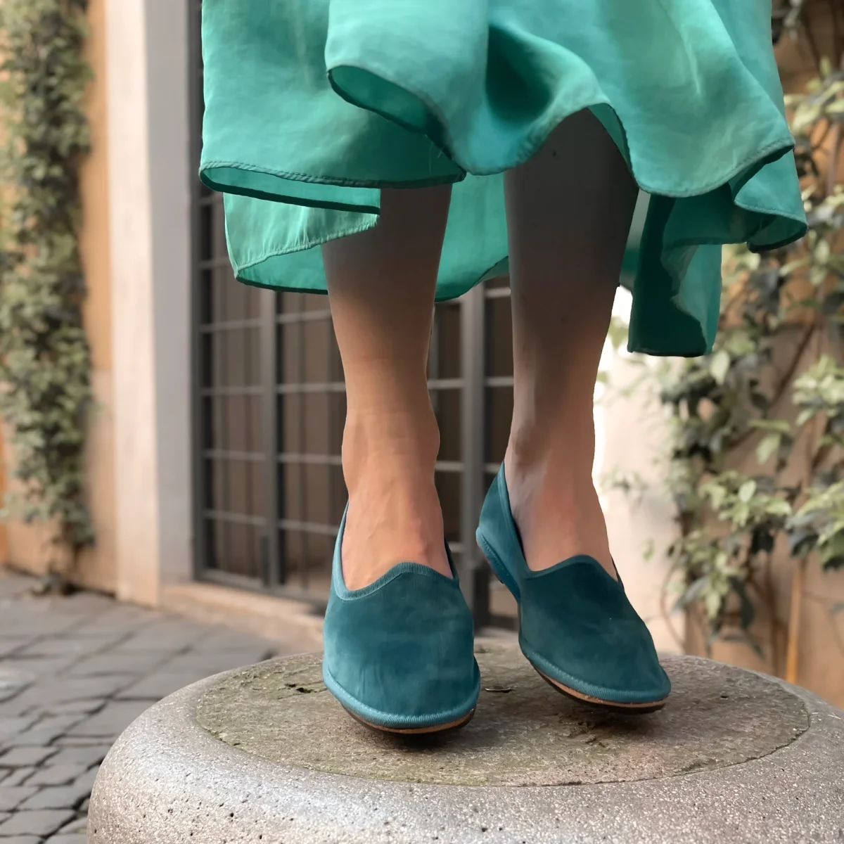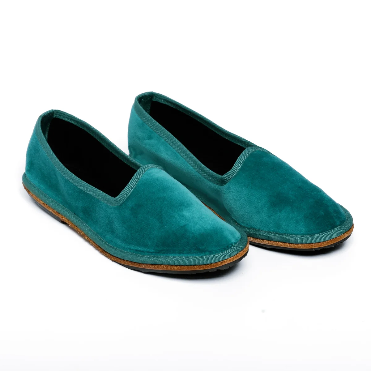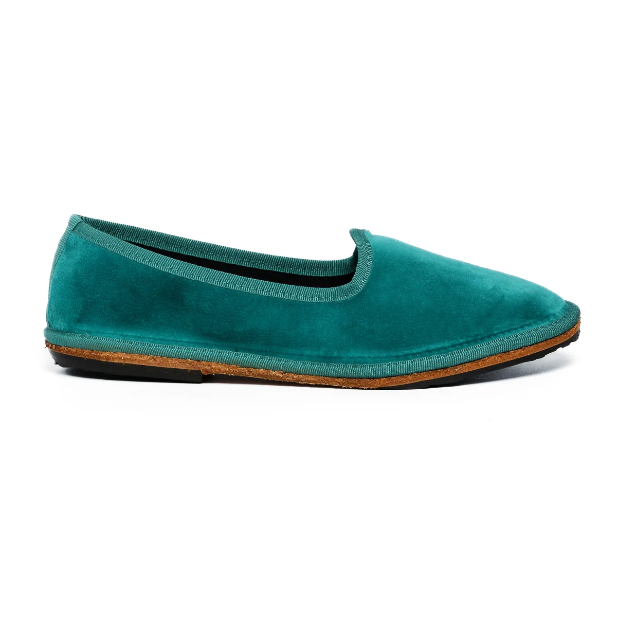 Friulana by Marta Ray “made in tuscany” a punta tonda. Realizzata in velluto. Lavorazione a sacchetto con sottopiede leggermente imbottito in pelle. Fondo originale in cuoio combinato con rinforzi in gomma antiscivolo cuciti.