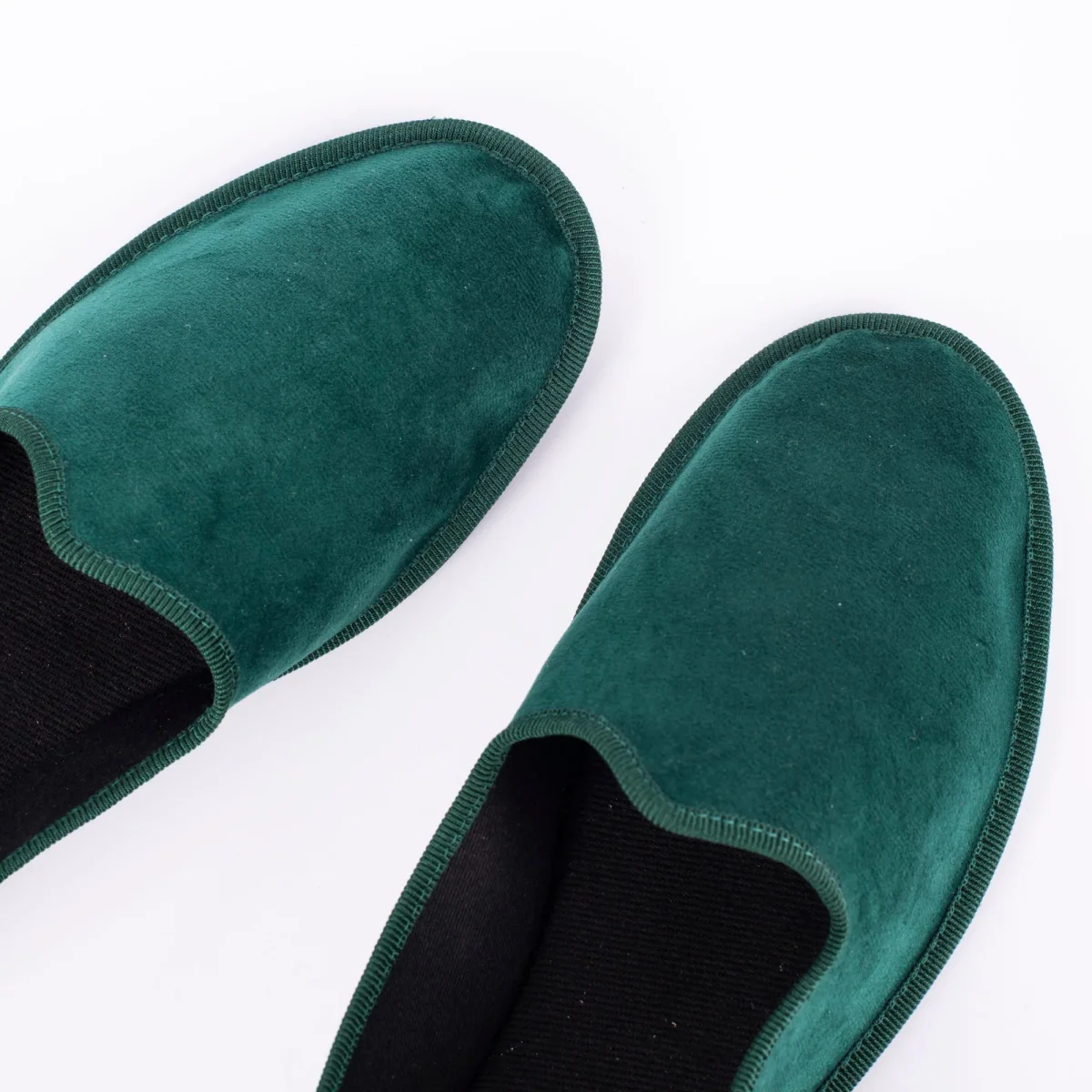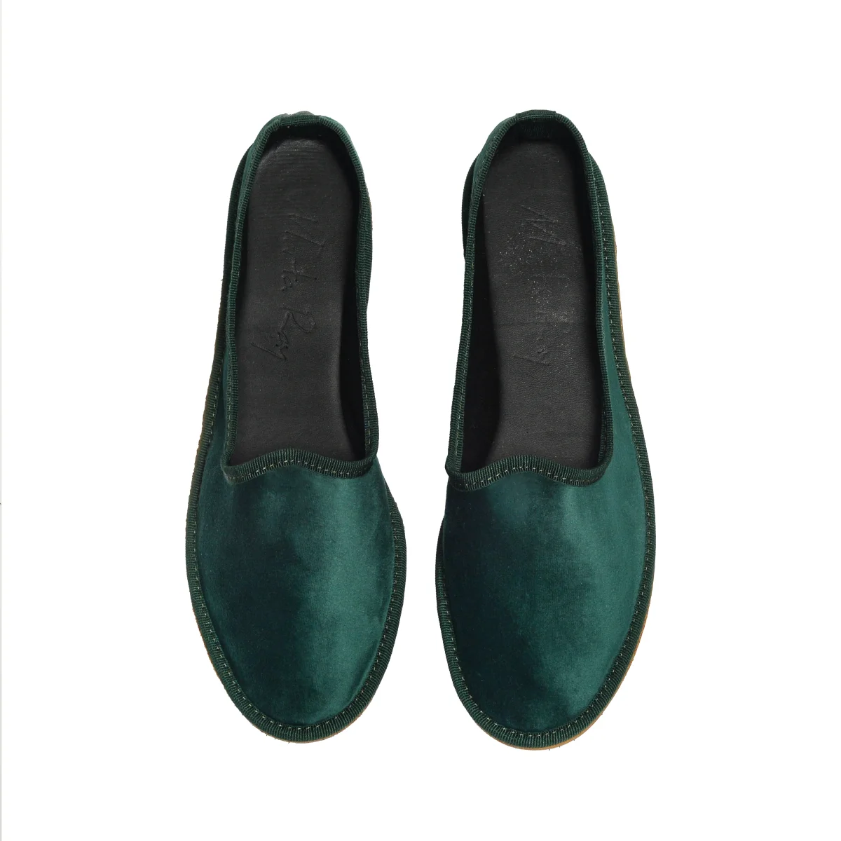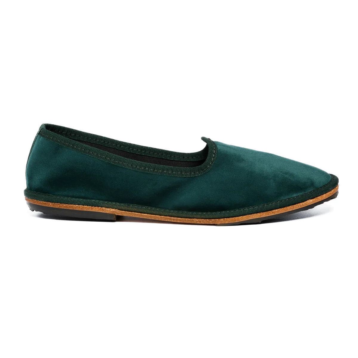 Friulana by Marta Ray “made in tuscany” a punta tonda. Realizzata in velluto. Lavorazione a sacchetto con sottopiede leggermente imbottito in pelle. Fondo originale in cuoio combinato con rinforzi in gomma antiscivolo cuciti.