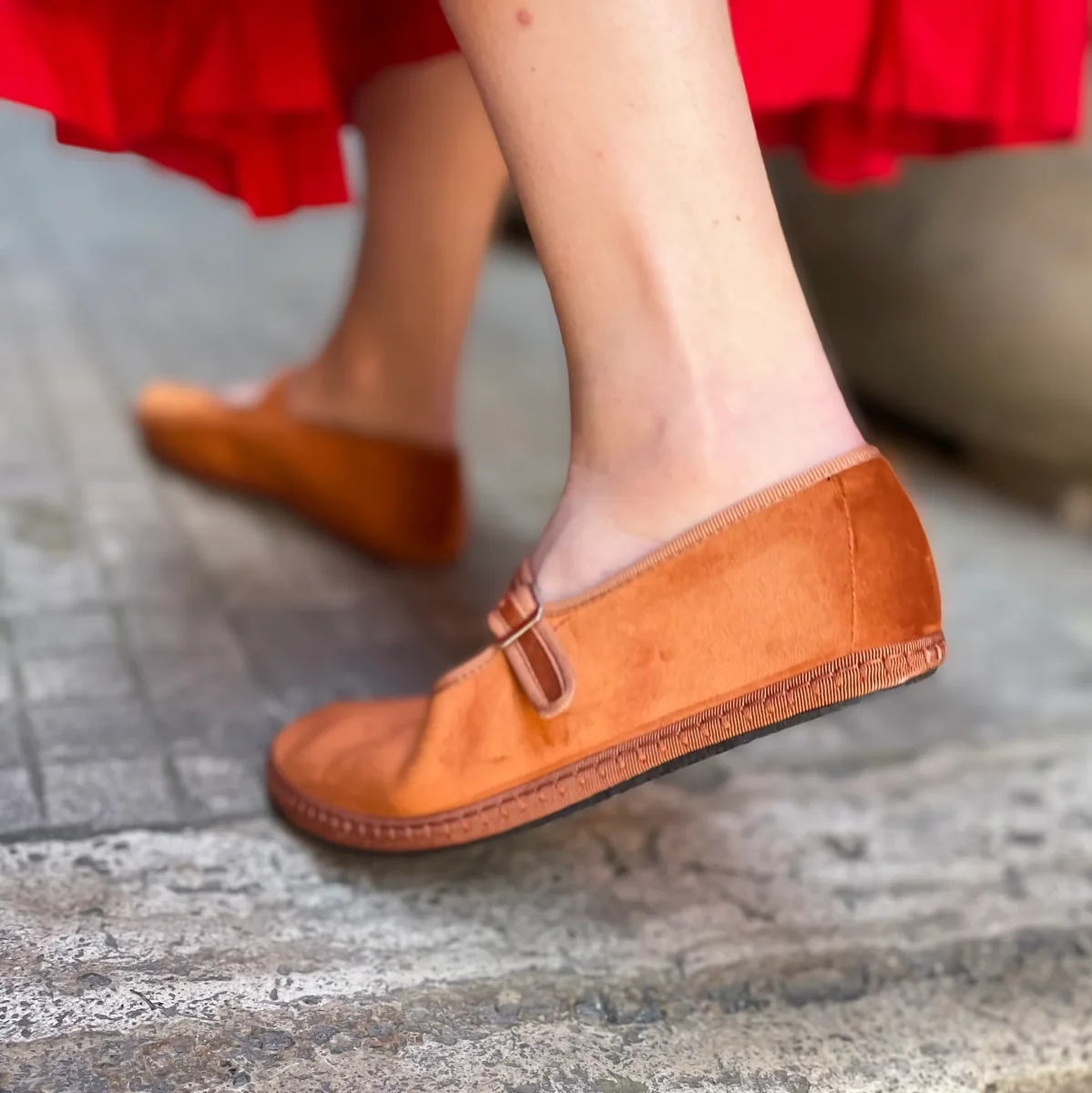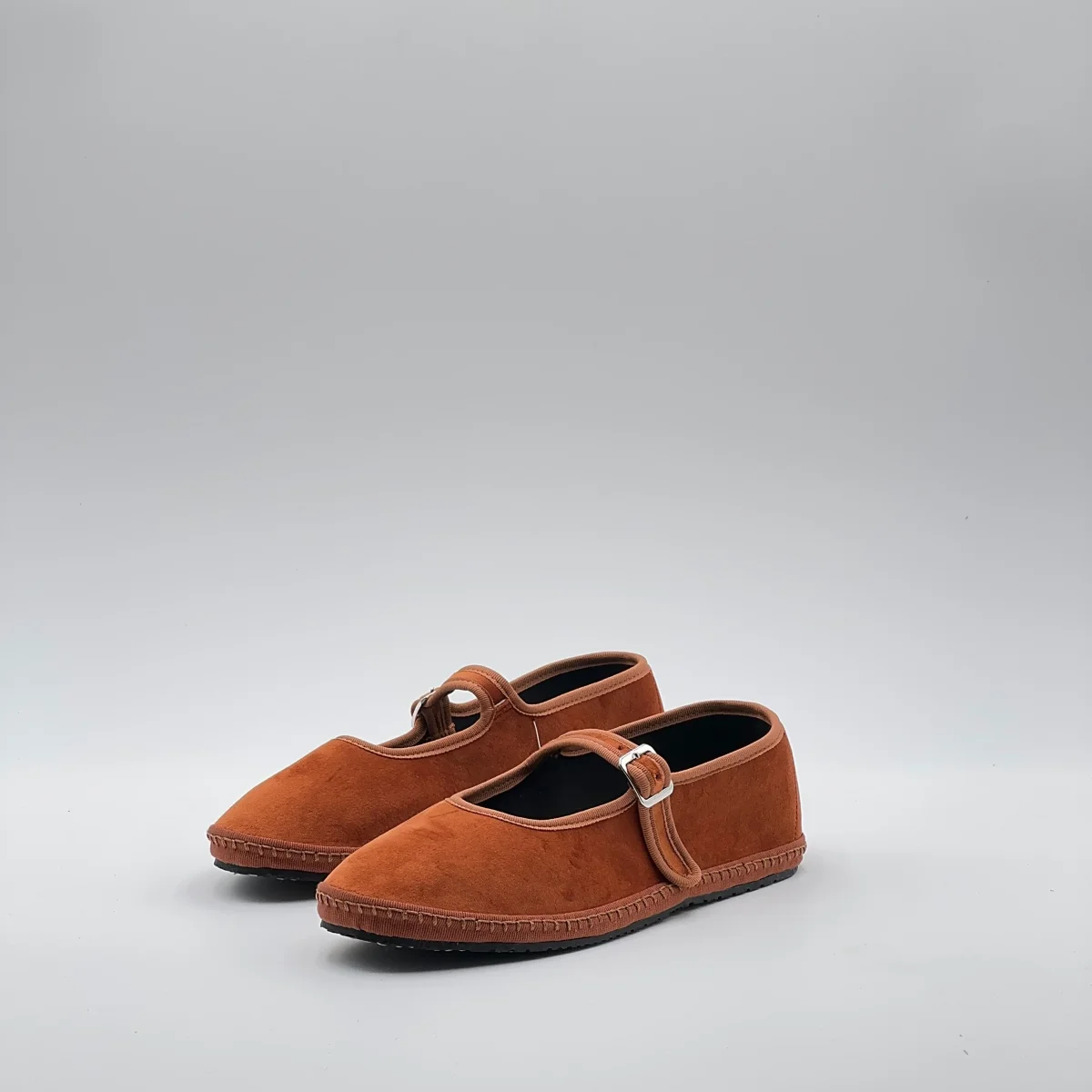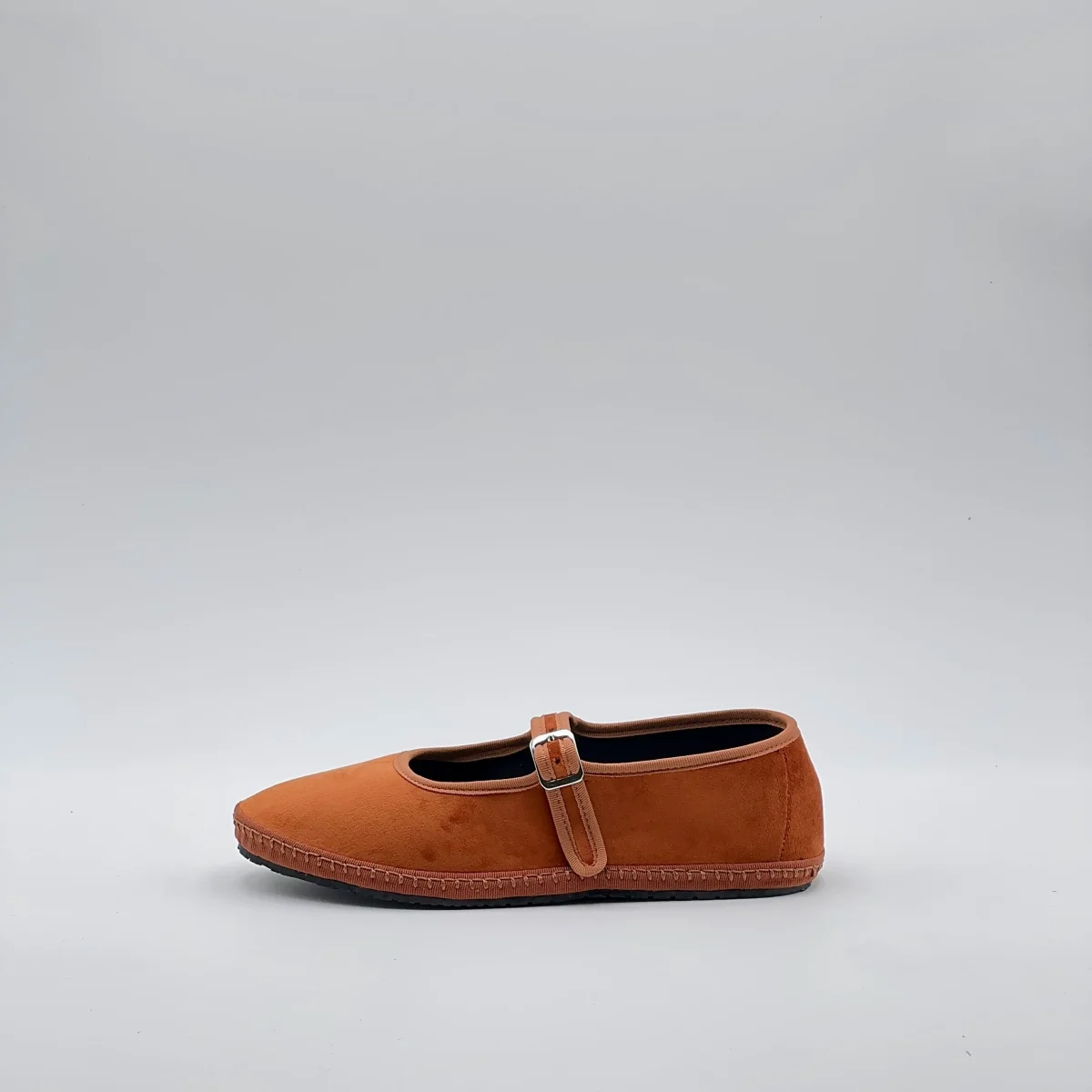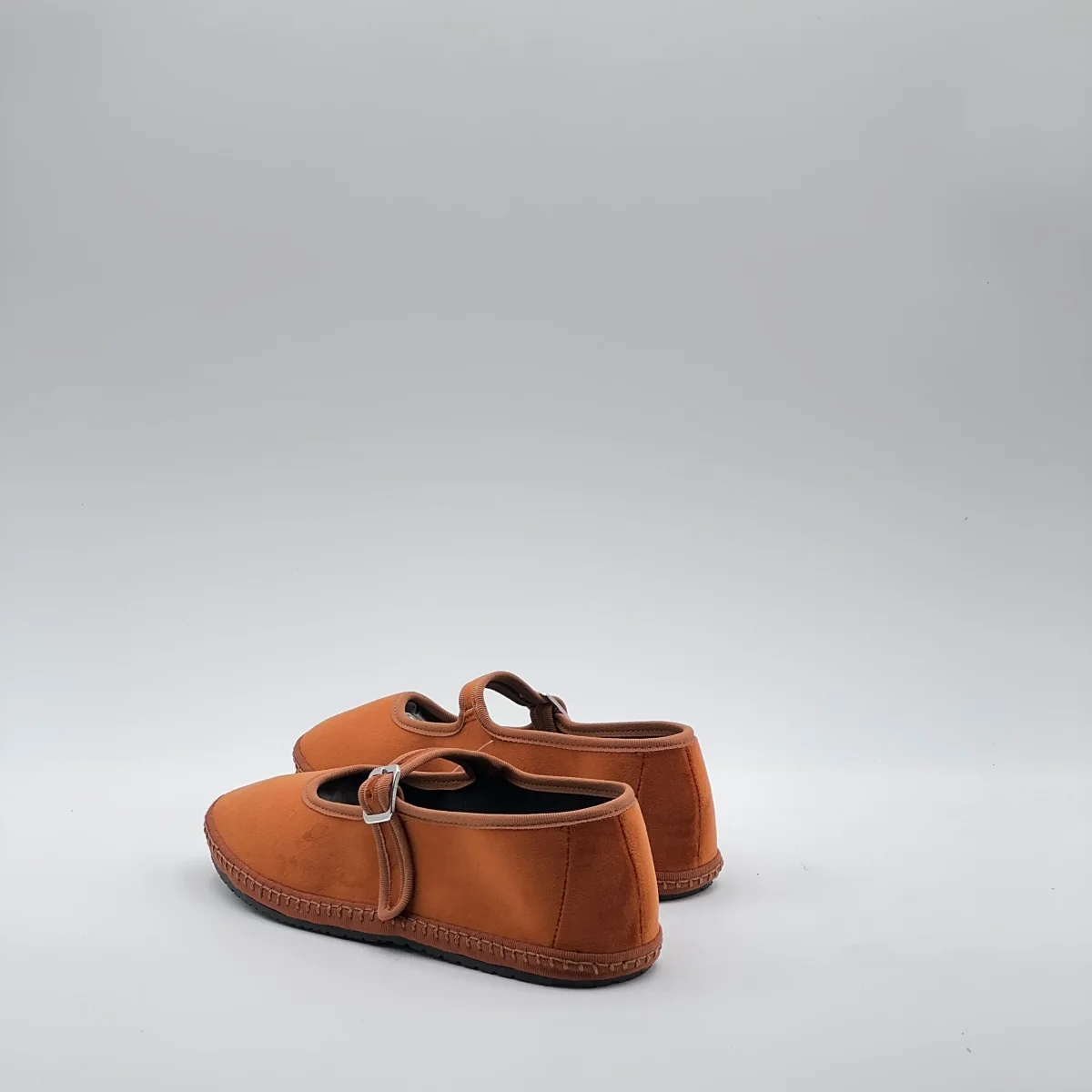 Friulana Mary Jane in velluto arancio, con interno in cotone nero e sottopiede in pelle. Chiusura con fibbia regolabile e suola in gomma cucita.Realizzata a mano secondo la tradizione friulana.