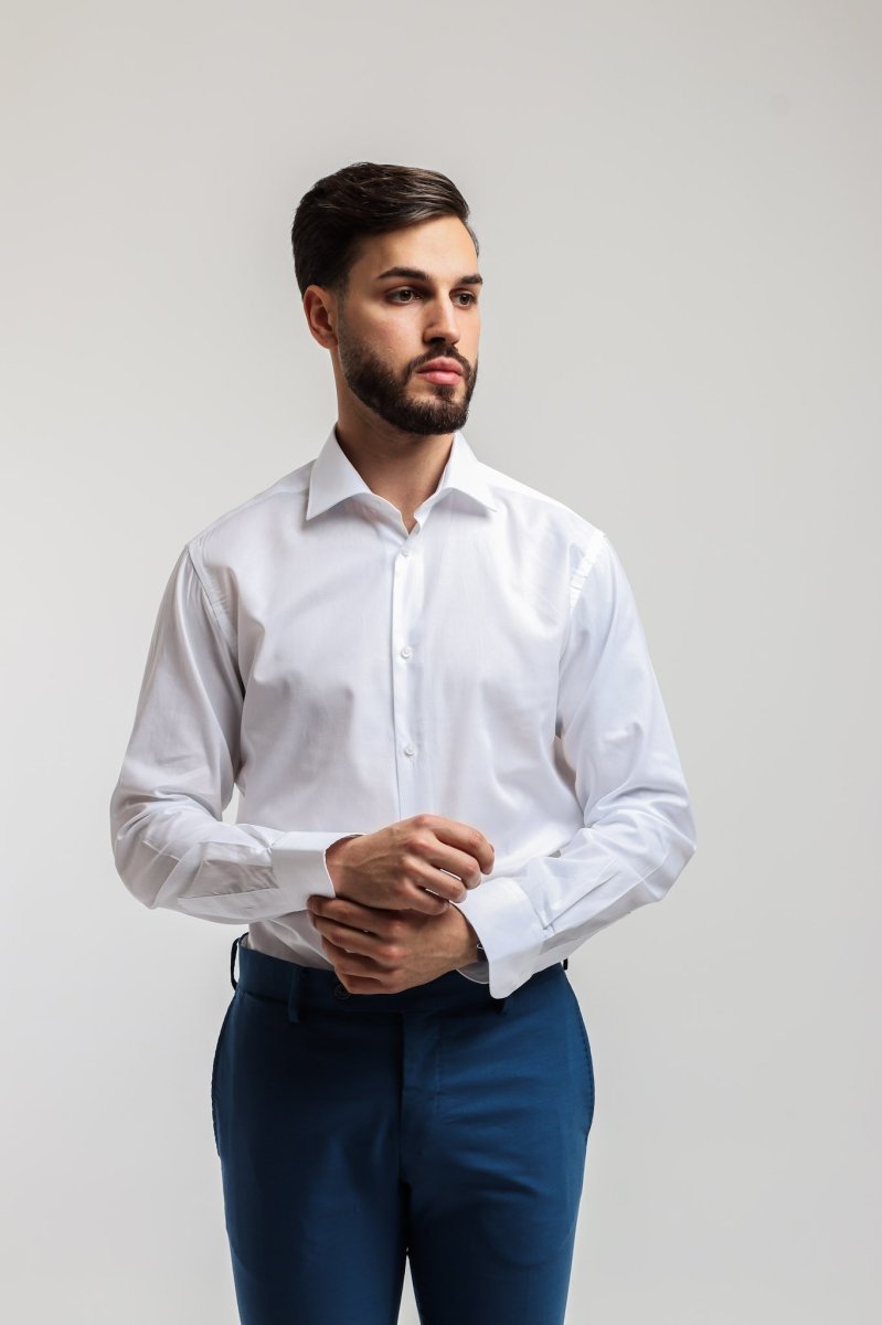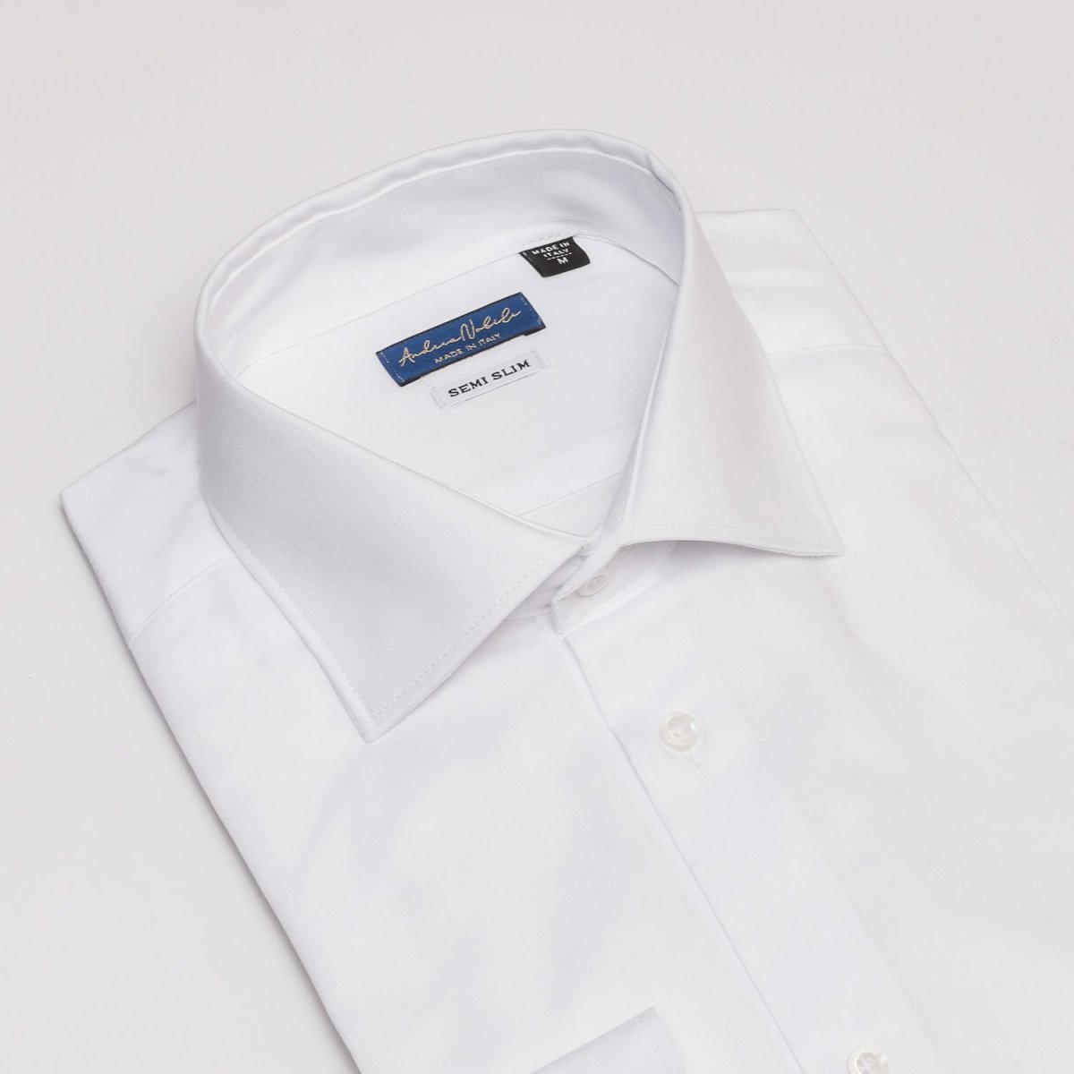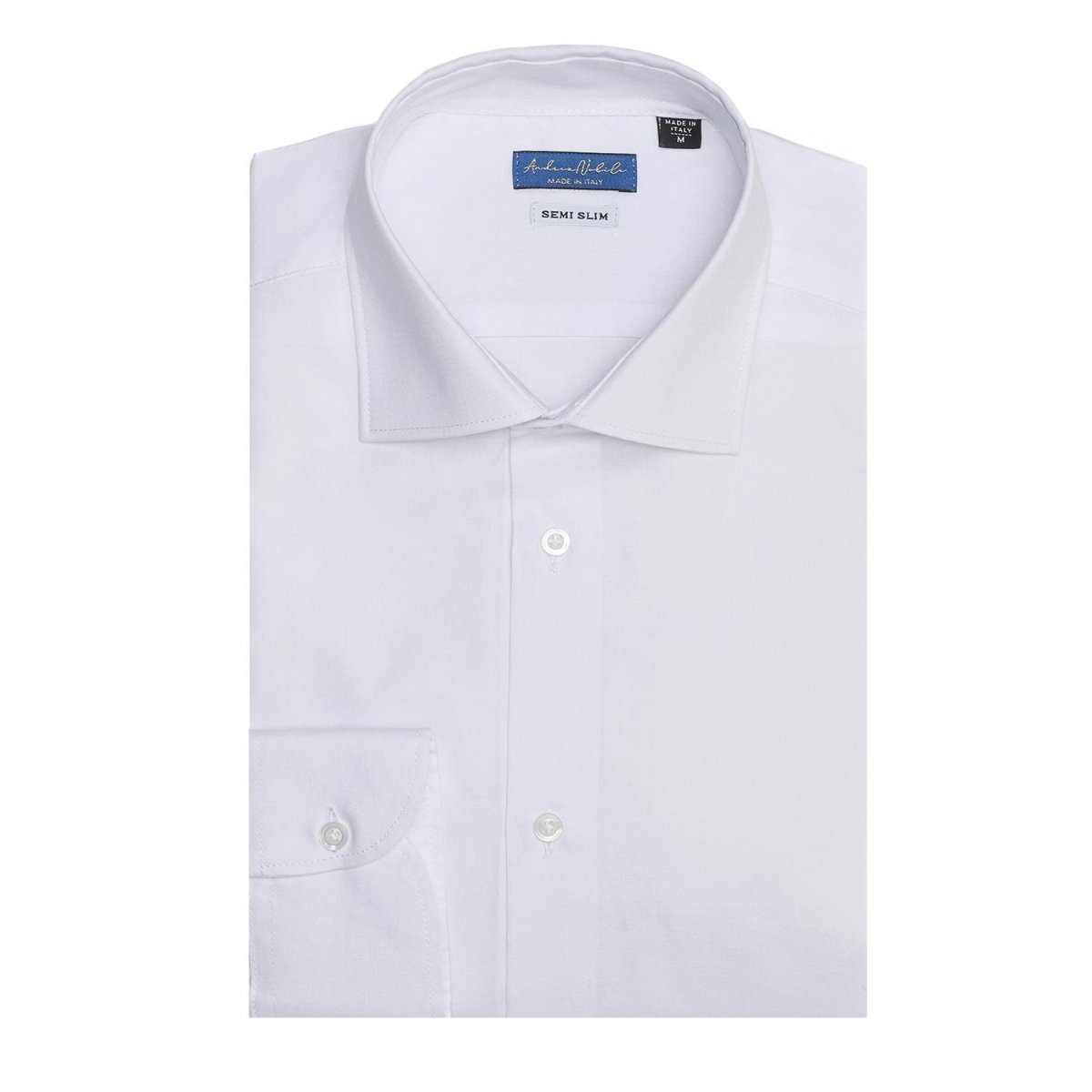 Camicia made in Italy nel colore bianca, collo mezzo francese con polsini con angoli arrotondati e un bottone.