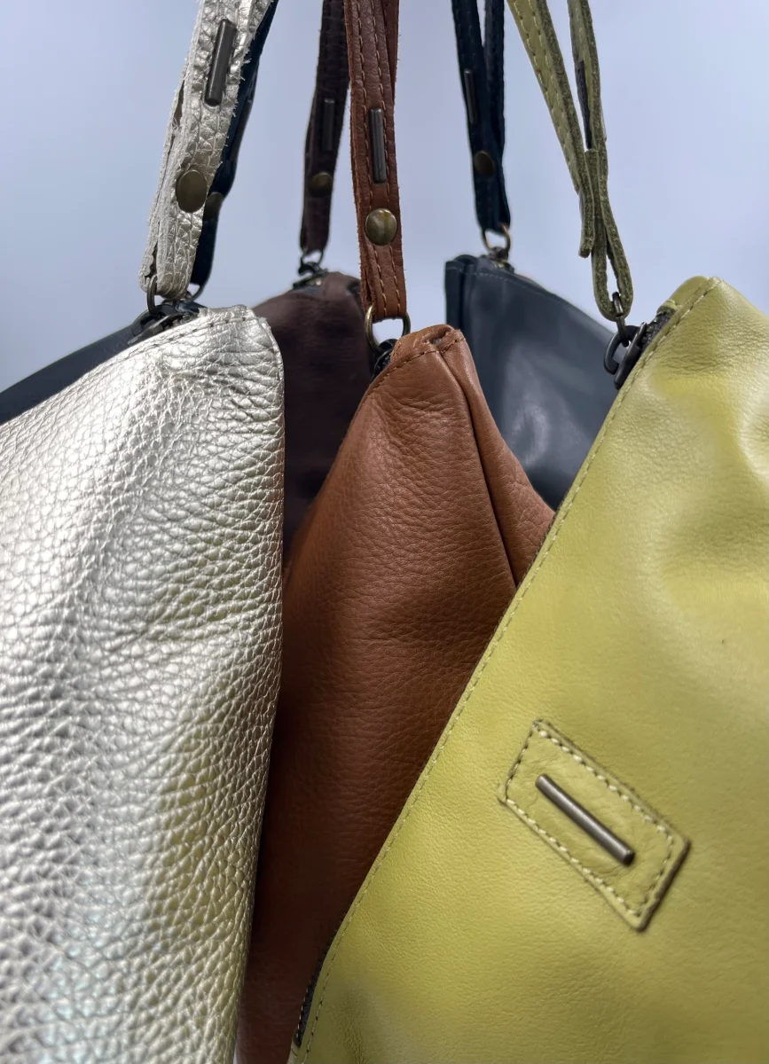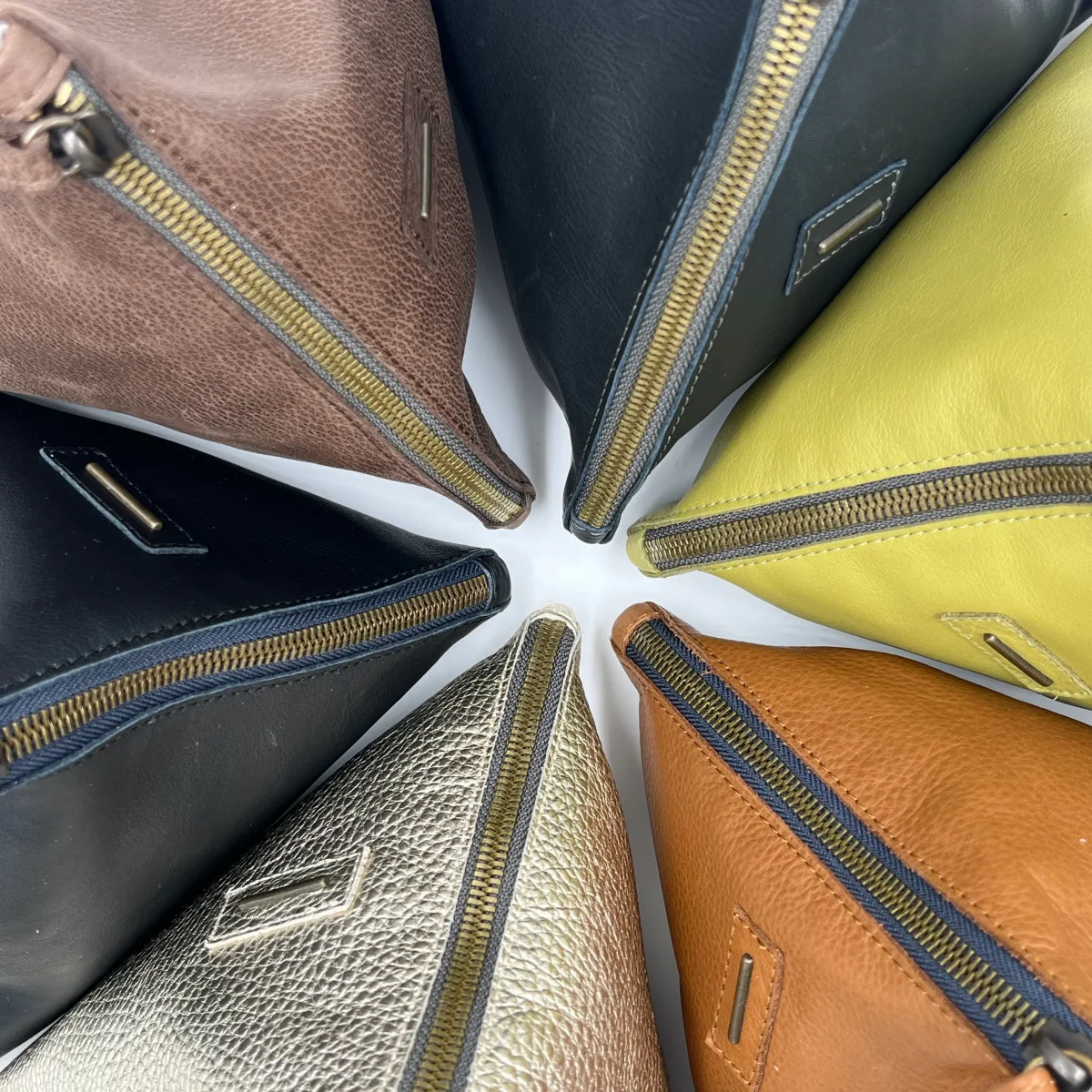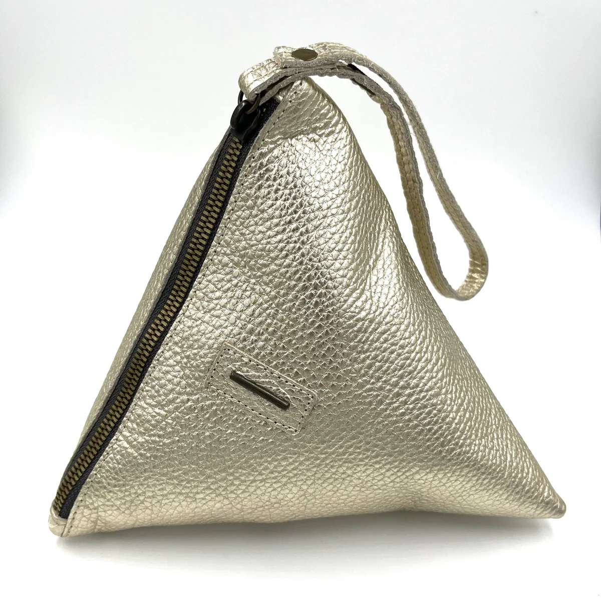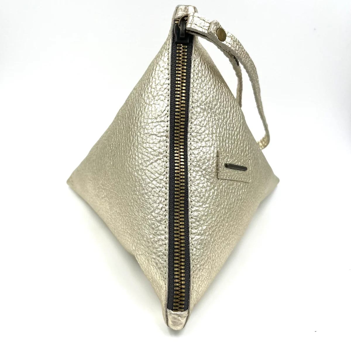 Borsellino Small. Gigi è un accessorio dalla forma triangolare asimmetrica, contiene il necessario nella sua forma originale. Foderato e con la chiusura a zip, si porta comodamente al polso.