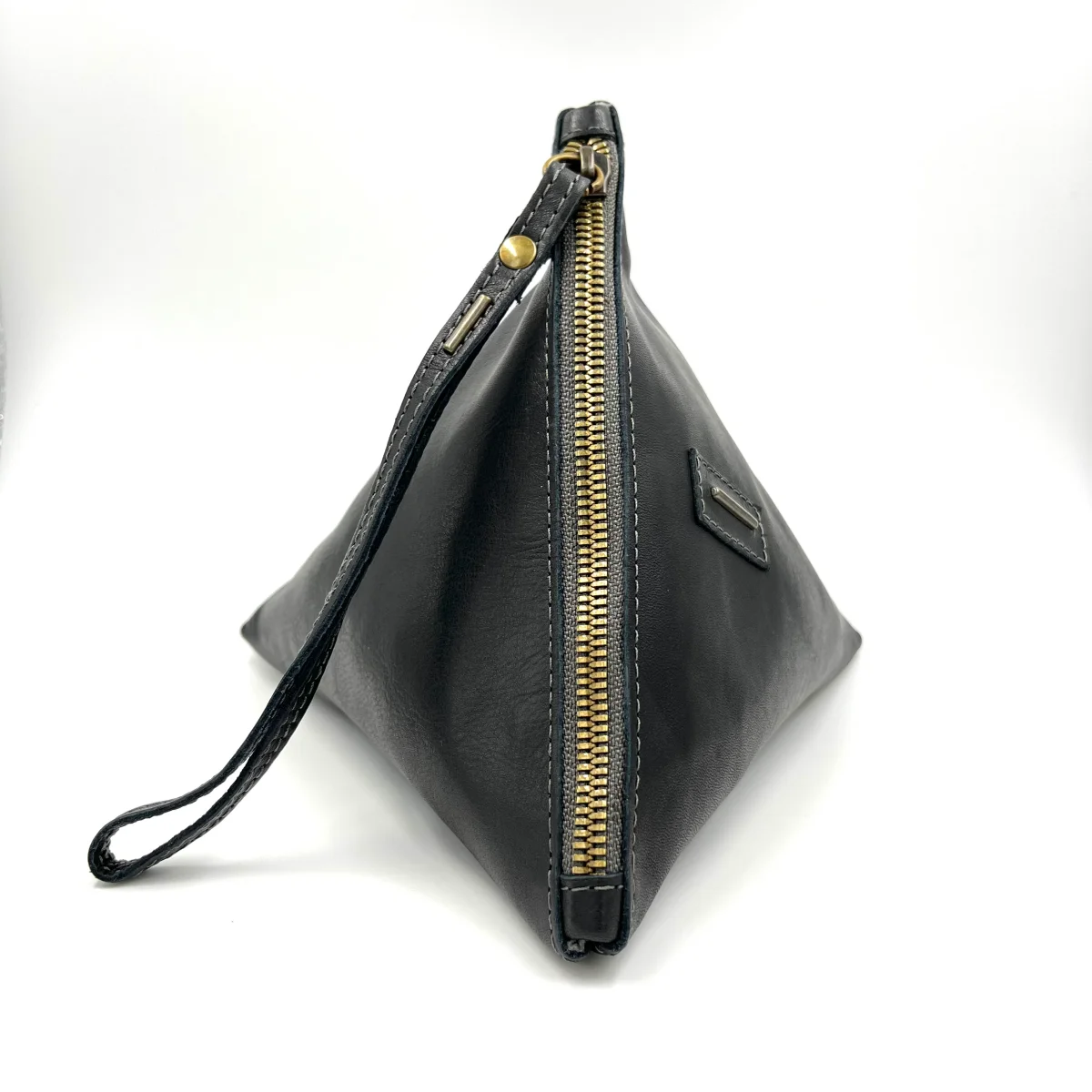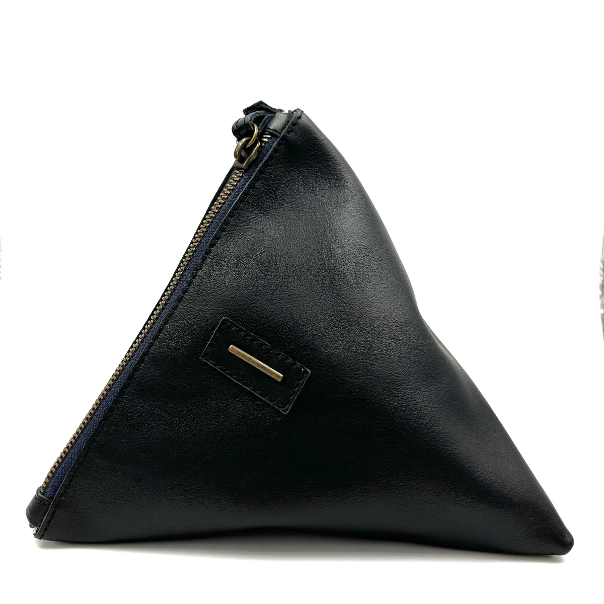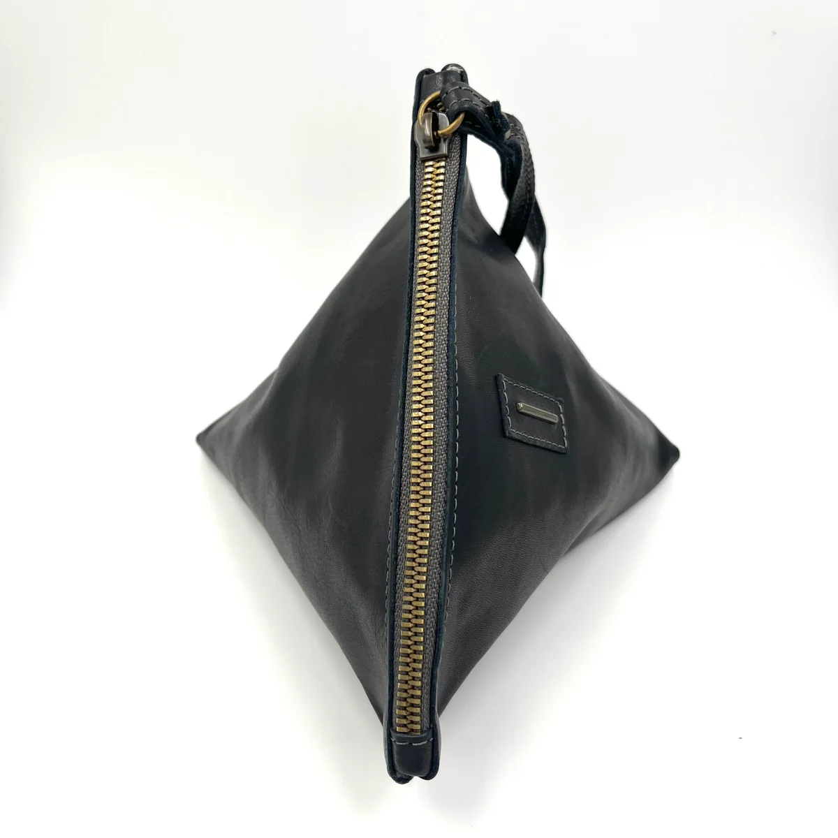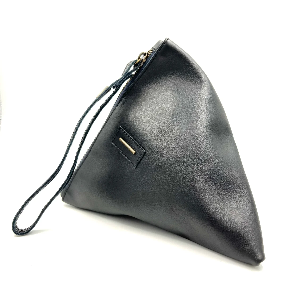 Borsellino Small. Gigi è un accessorio dalla forma triangolare asimmetrica, contiene il necessario nella sua forma originale. Foderato e con la chiusura a zip, si porta comodamente al polso.
