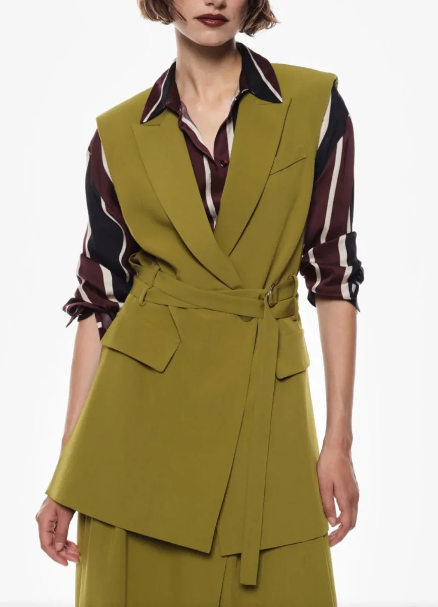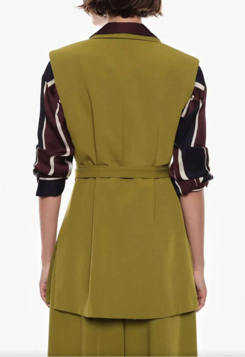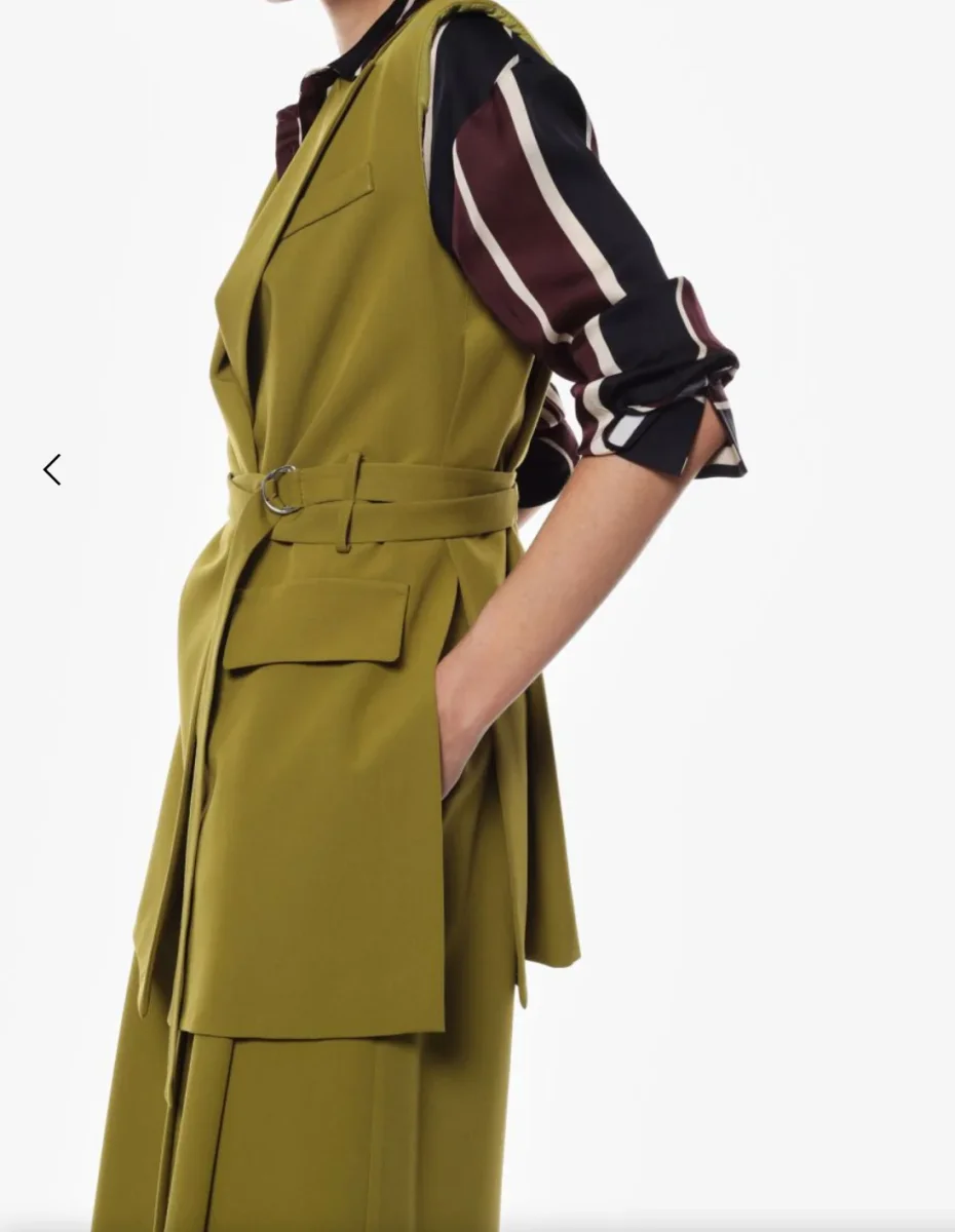 Un gilet lungo che conquista per la sua linea essenziale ma sofisticata. Dotato di una cintura che valorizza la silhouette, si presenta con tasche pratiche e dettagli curati.