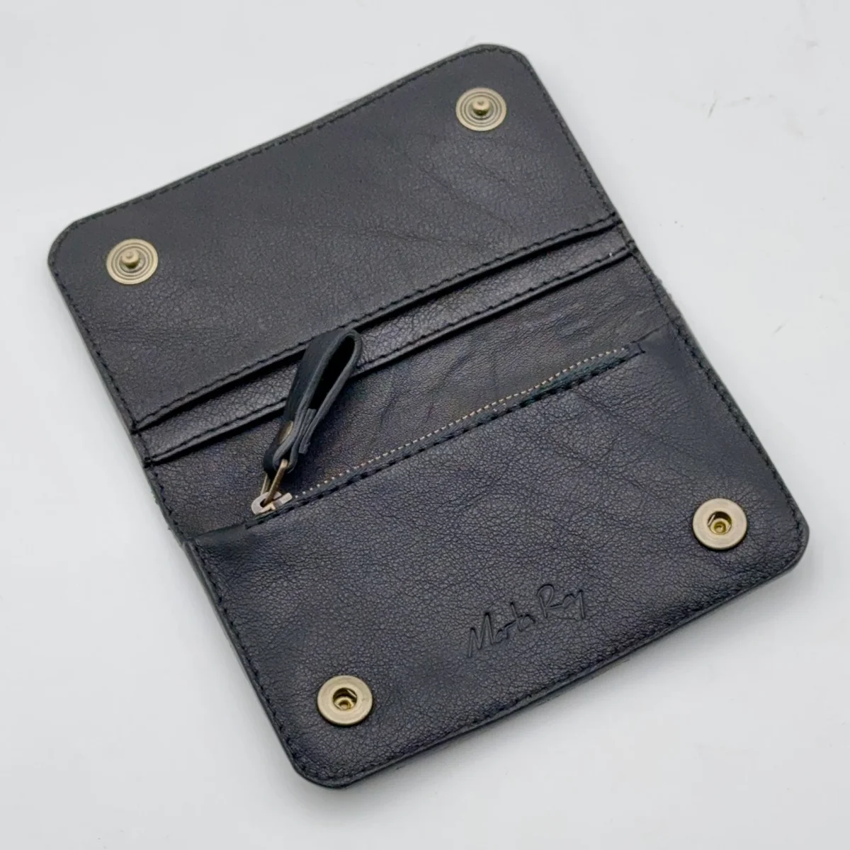 Portafoglio in pelle con i bordi rifiti con la tintura a mano. Due capienti scomparti per le carte da un lato, da altro la tasca con la zip, sotto la tasca principale troverai uno spazio dedicato per carte di credito e/o contanti.