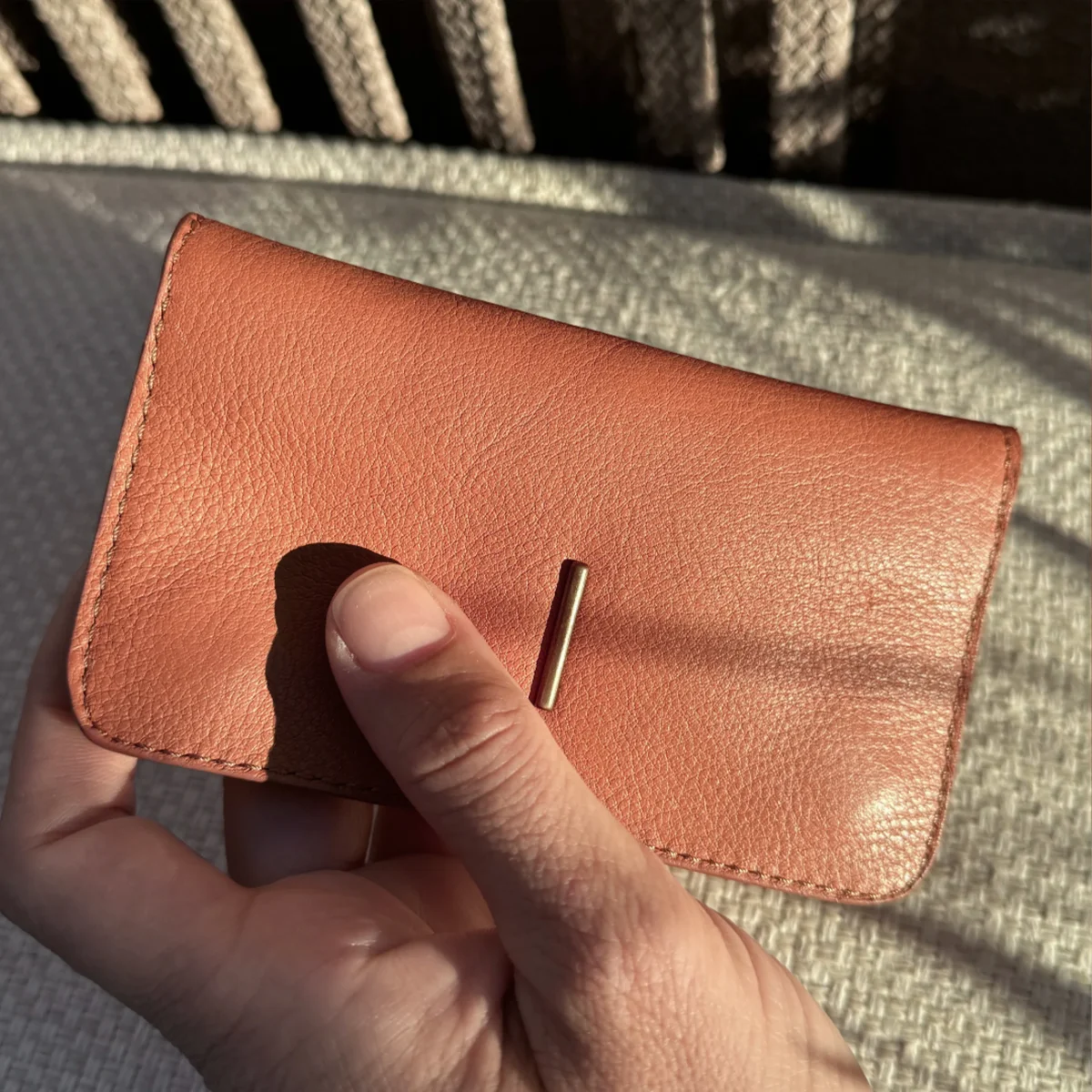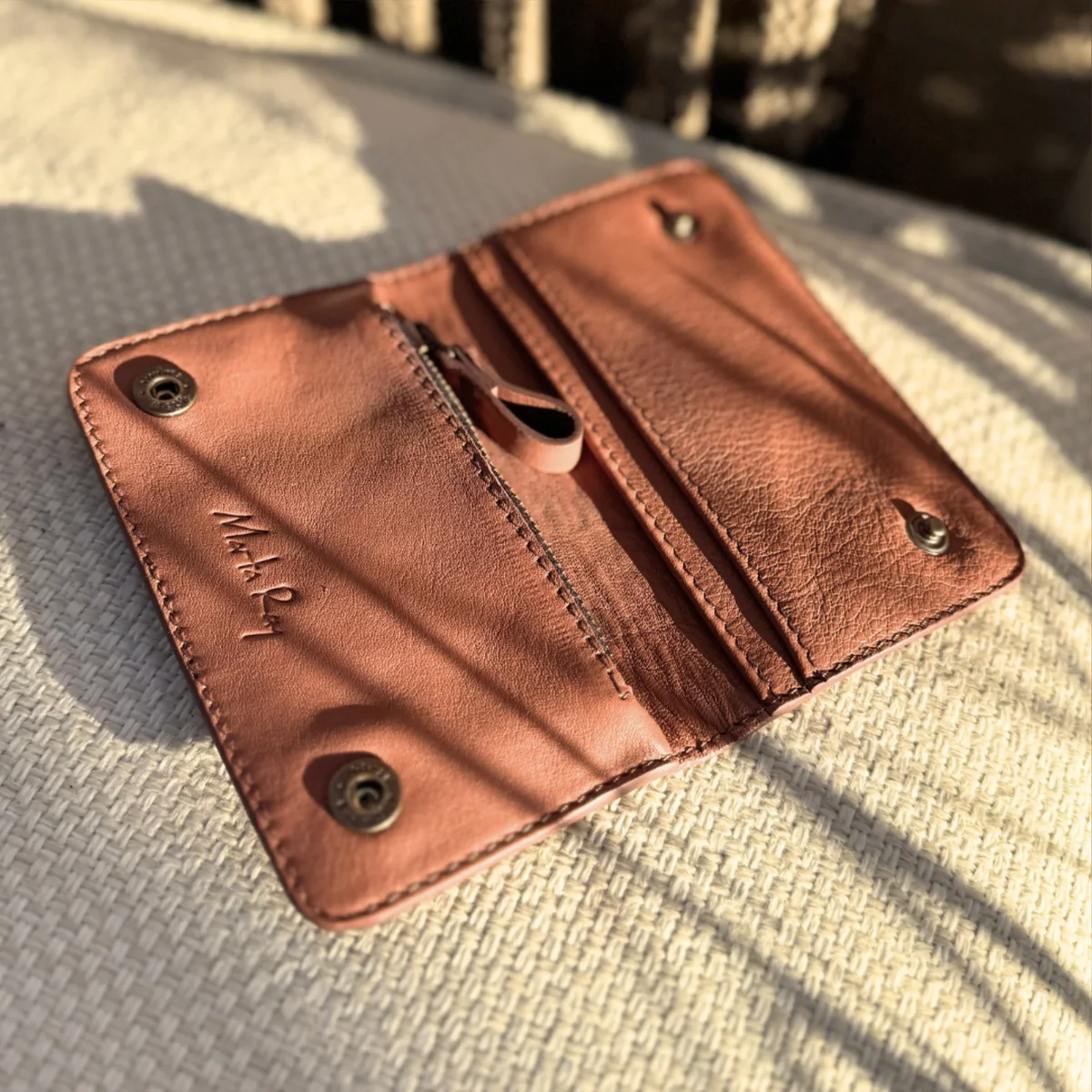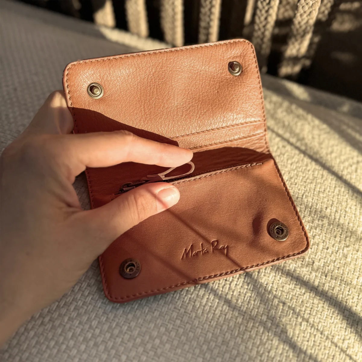 Portafoglio in pelle con i bordi rifiti con la tintura a mano. Due capienti scomparti per le carte da un lato, da altro la tasca con la zip, sotto la tasca principale troverai uno spazio dedicato per carte di credito e/o contanti.