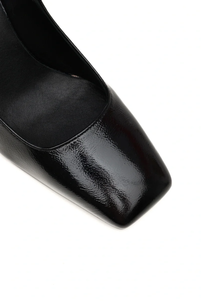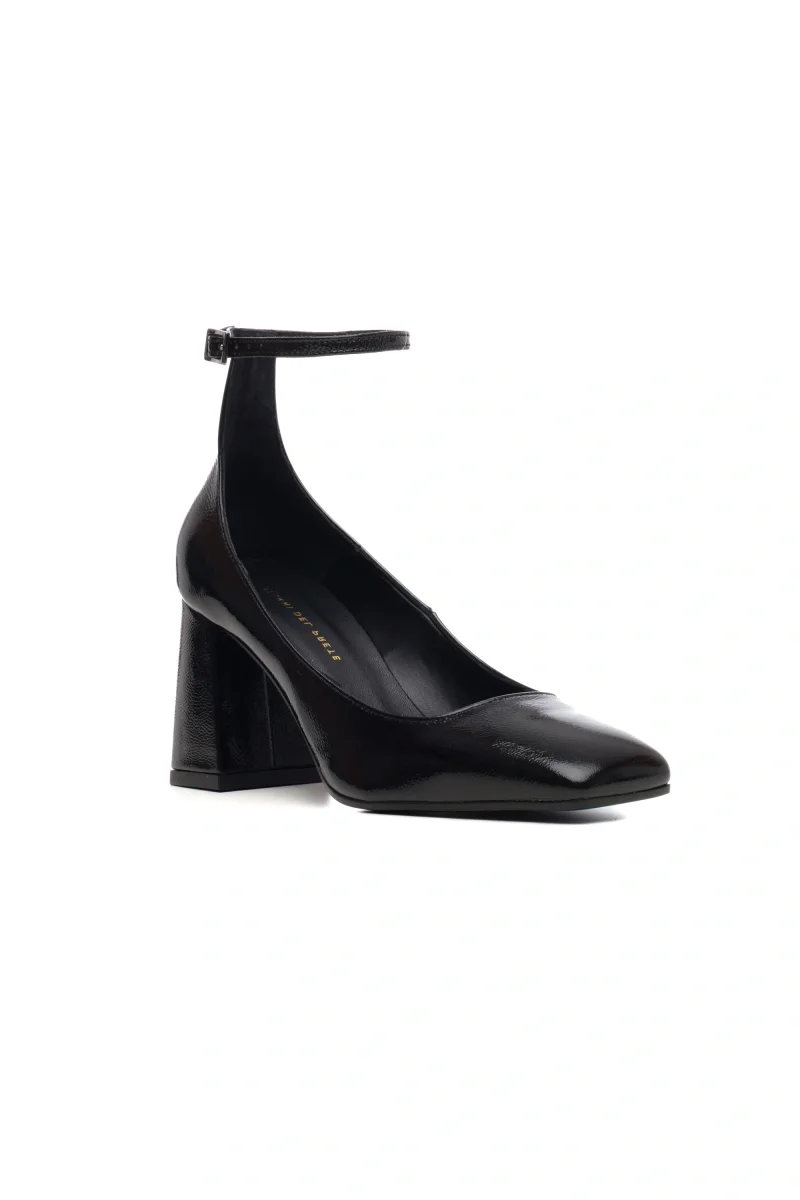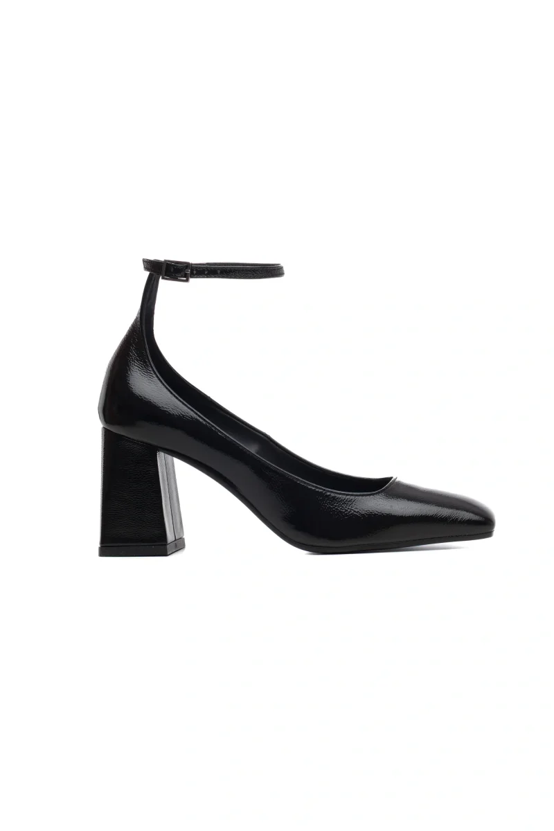 Realizzata in pelle effetto verniciato, kristen è uno stile dalla punta squadrata e con un tacco largo di 85mm. Il cinturino alla caviglia regolabile presenta una fibbia dalla forma rettangolare in metallo.