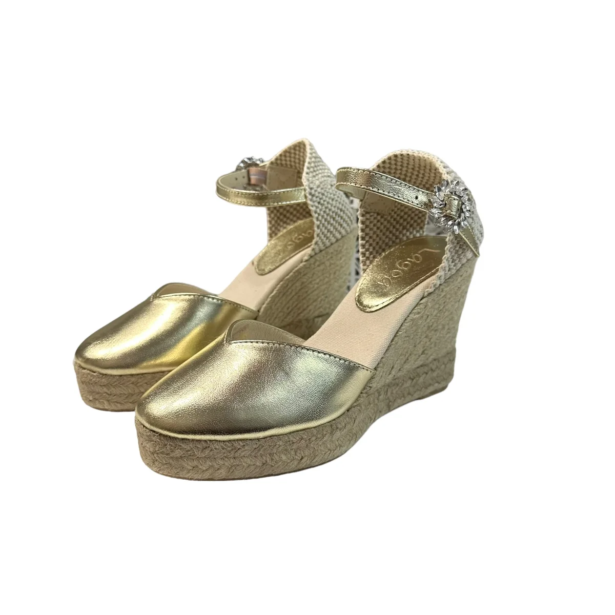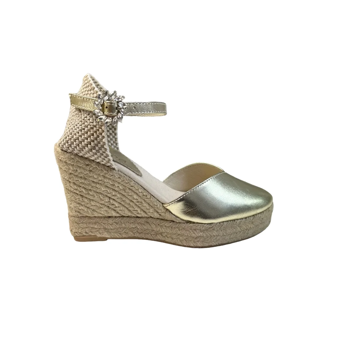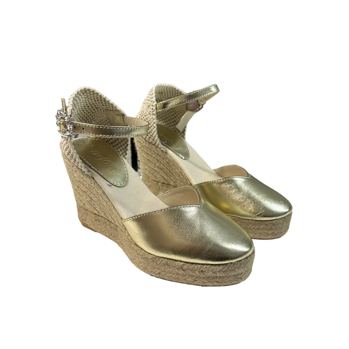 Zeppa in pelle laminata con bracciale alla caviglia, suola in corda tacco 10cm