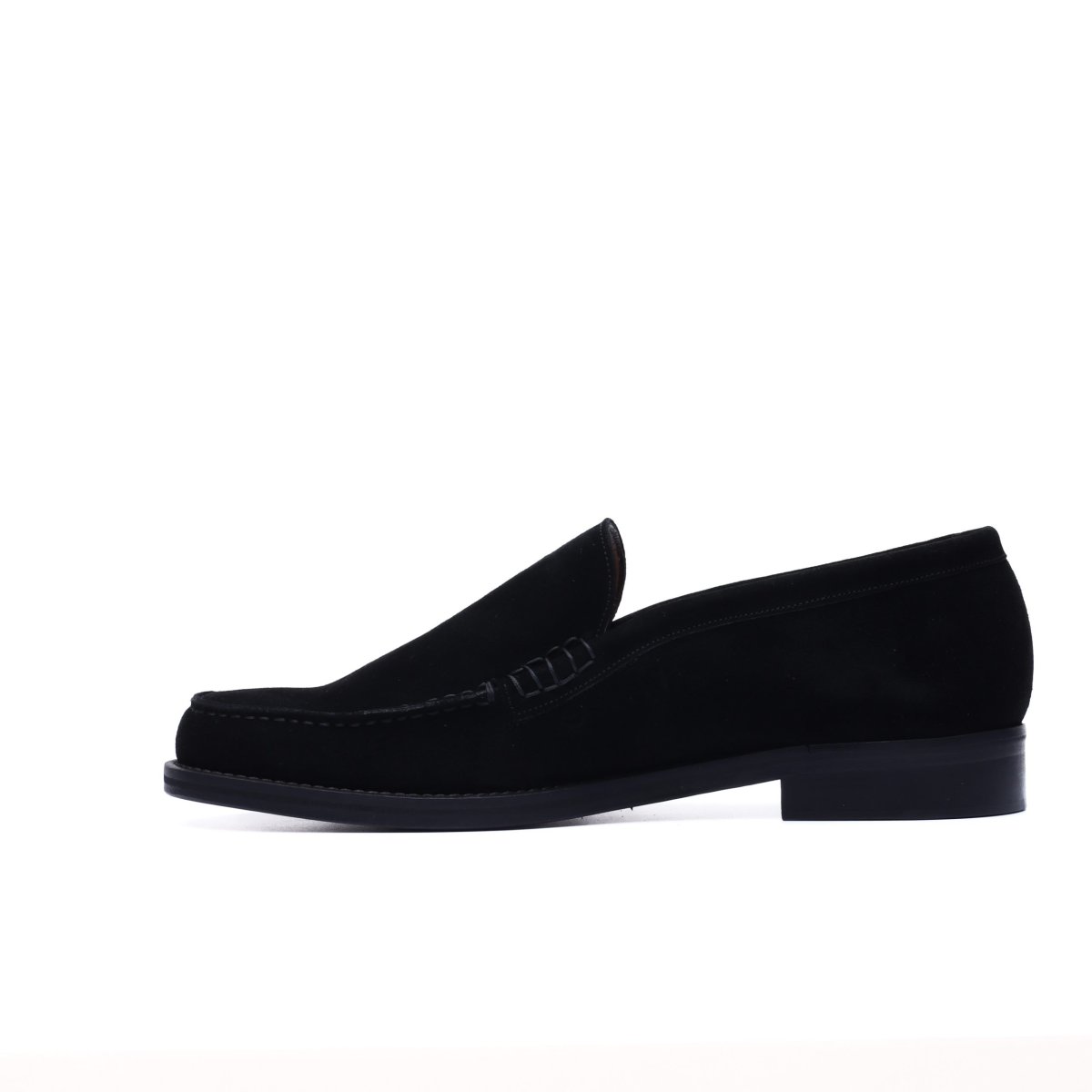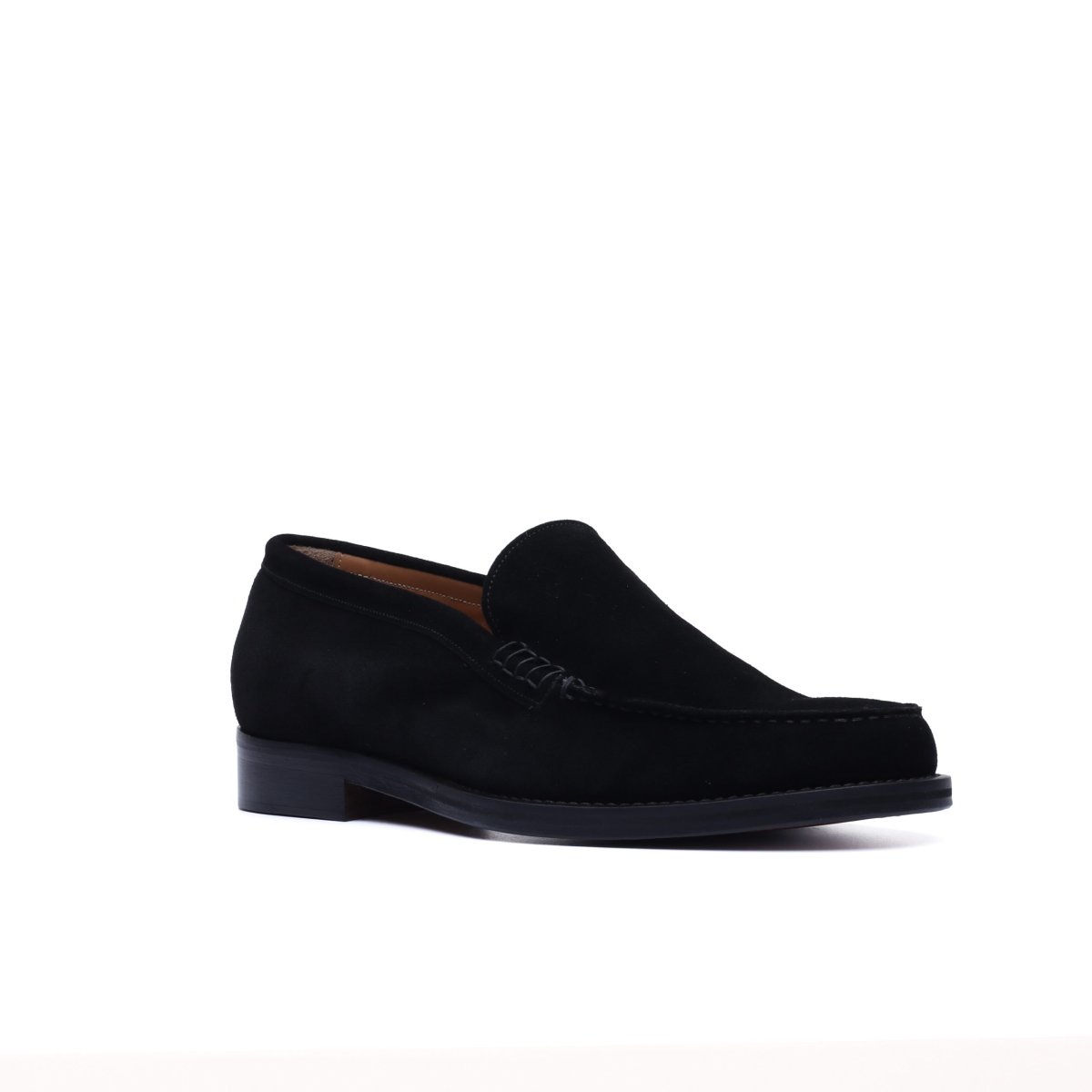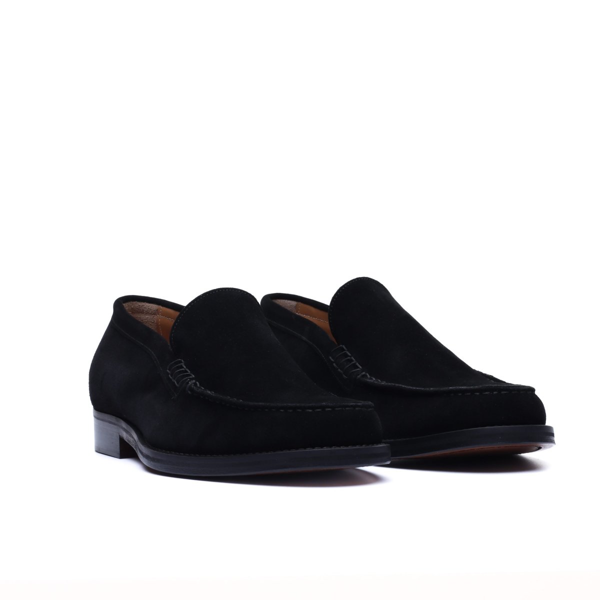 Calzatura artigianale made in Italy modello Mocassino, caratterizzata dalle cuciture decorative laterali sulla parte alta della tomaia. Realizzata in pelle scamosciata tinta nel colore nero. Interno foderato in pelle nel colore beige con logo stampato nel colore oro. Suola in cuoio con lavorazione blake, tinta a mano nel colore beige e logo corsivo inciso. Un classico dalla struttura eccezionale, indossale con dei pantaloni sartoriali o chinos slim fit. Questa calzatura realizzata a mano unisce storia, eleganza, comfort e robustezza tipici dei prodotti Made in Italy con lo stile unico di Andrea Nobile.