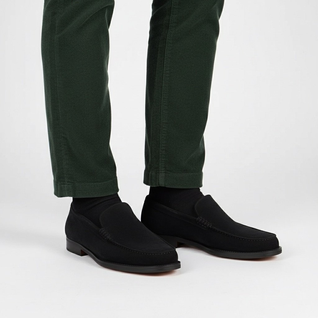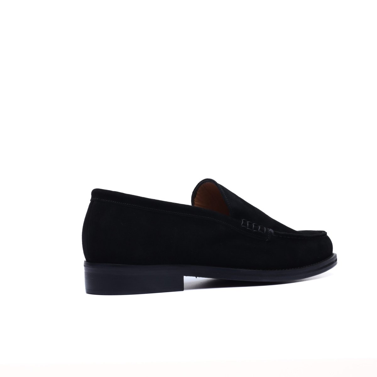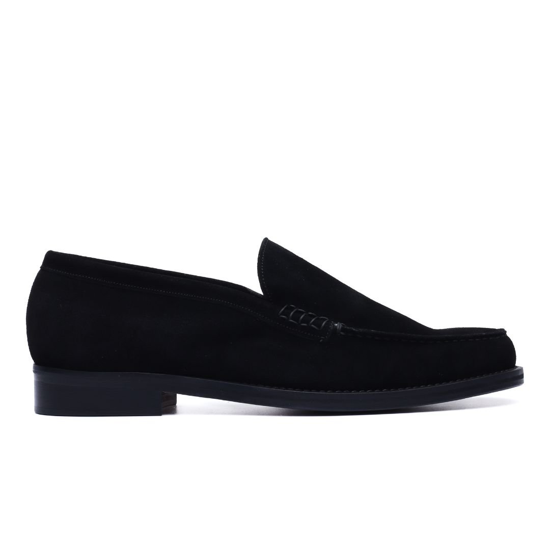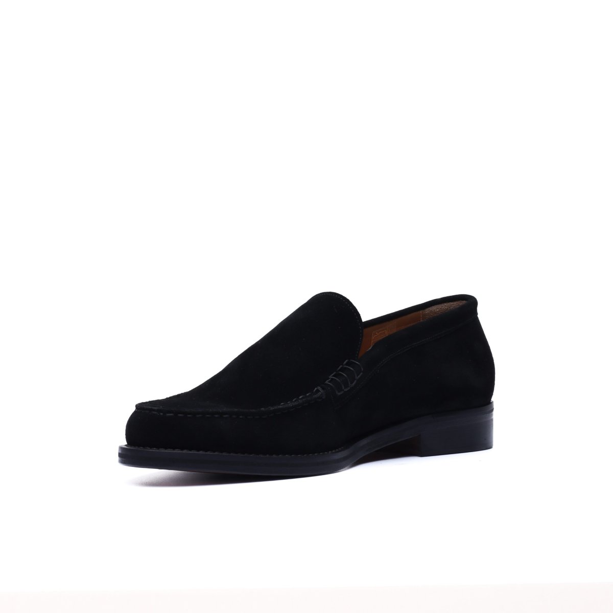 Calzatura artigianale made in Italy modello Mocassino, caratterizzata dalle cuciture decorative laterali sulla parte alta della tomaia. Realizzata in pelle scamosciata tinta nel colore nero. Interno foderato in pelle nel colore beige con logo stampato nel colore oro. Suola in cuoio con lavorazione blake, tinta a mano nel colore beige e logo corsivo inciso. Un classico dalla struttura eccezionale, indossale con dei pantaloni sartoriali o chinos slim fit. Questa calzatura realizzata a mano unisce storia, eleganza, comfort e robustezza tipici dei prodotti Made in Italy con lo stile unico di Andrea Nobile.