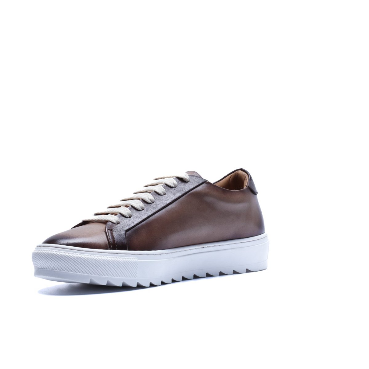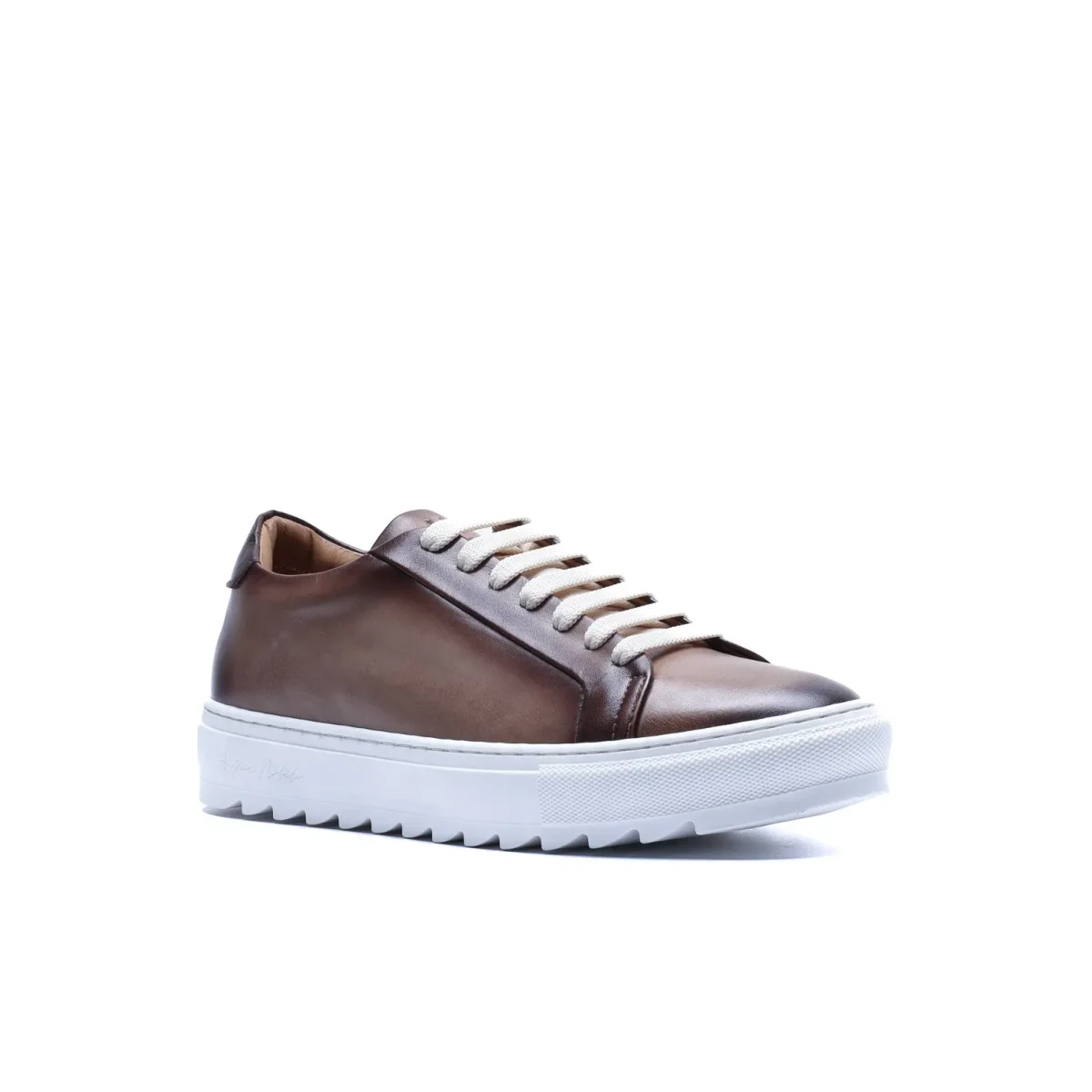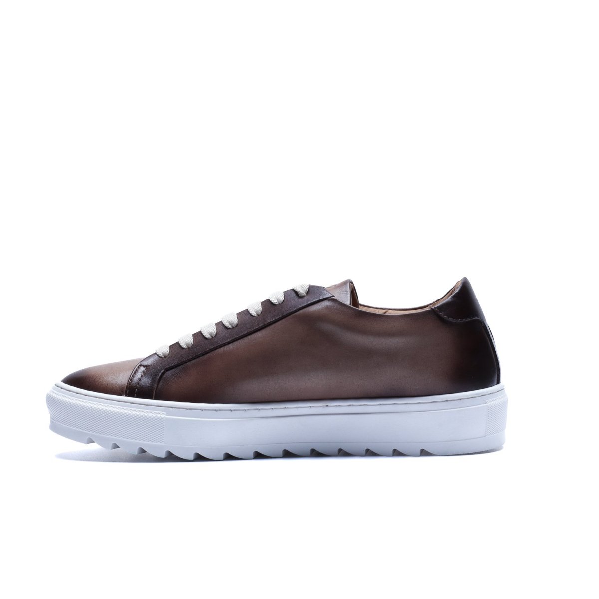 Sneaker Made in Italy realizzata in vera pelle tinta a mano nel colore talpa con sfumature naturali, caratterizzata da una suola bianca con disegno “dente di squalo” che aggiunge dinamismo e personalità alla silhouette.