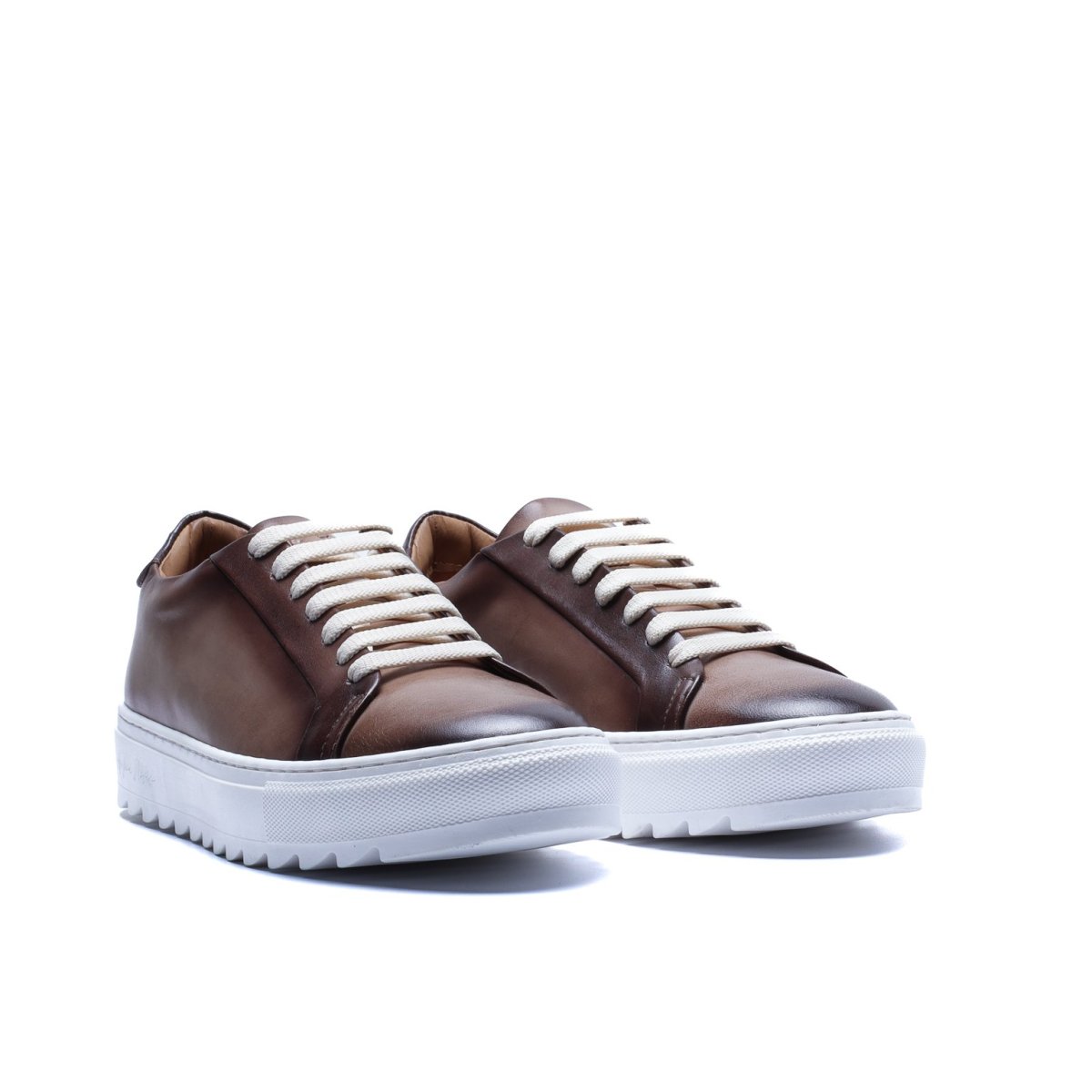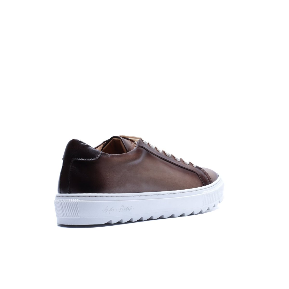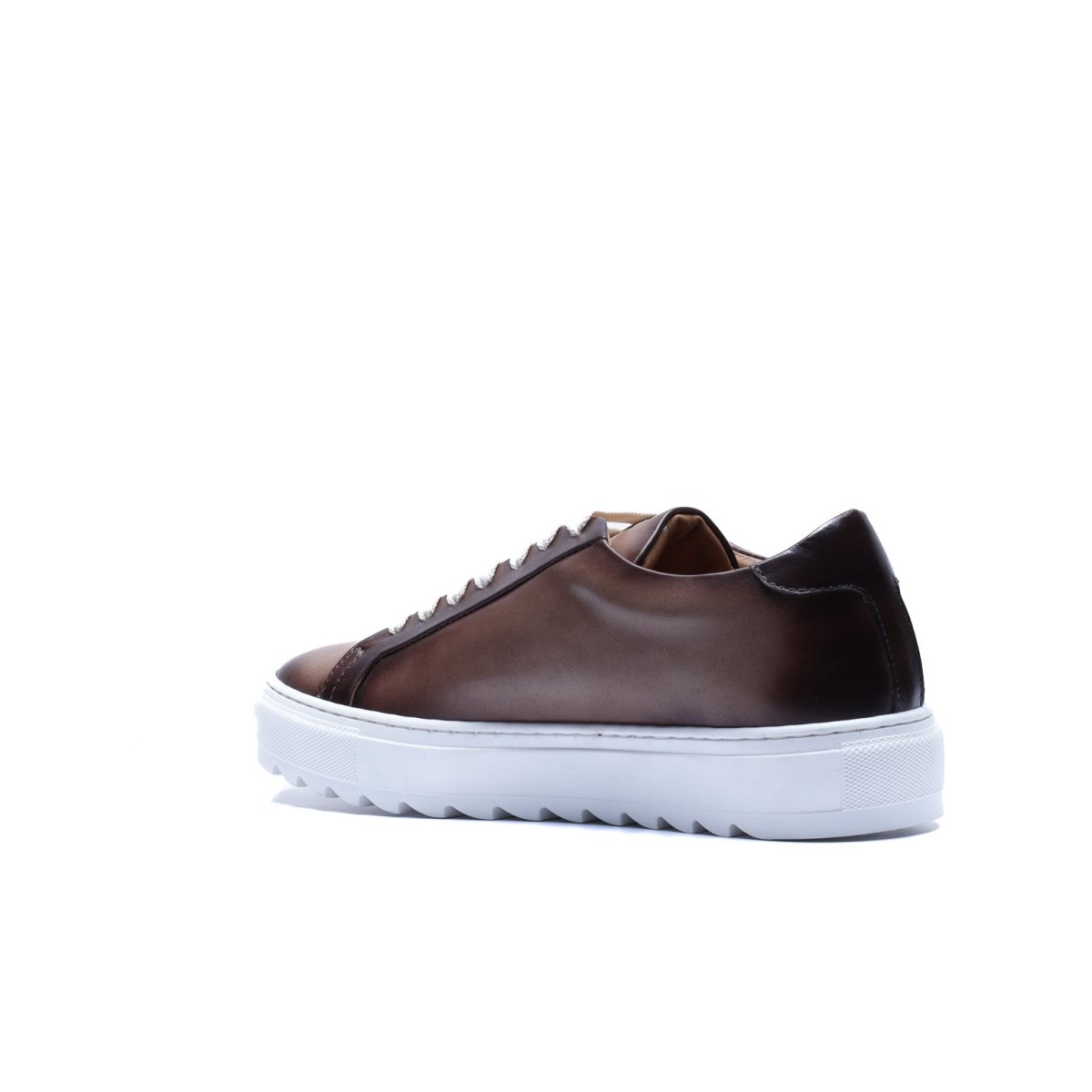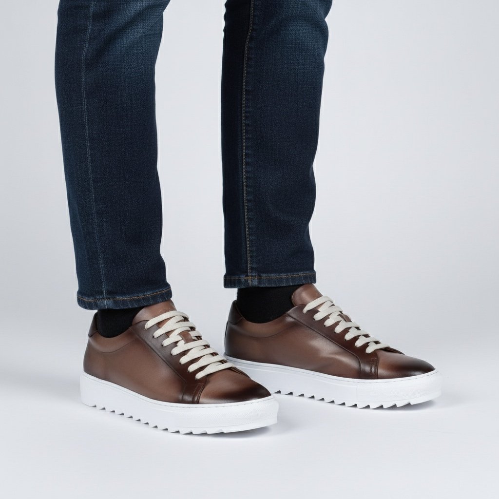 Sneaker Made in Italy realizzata in vera pelle tinta a mano nel colore talpa con sfumature naturali, caratterizzata da una suola bianca con disegno “dente di squalo” che aggiunge dinamismo e personalità alla silhouette.