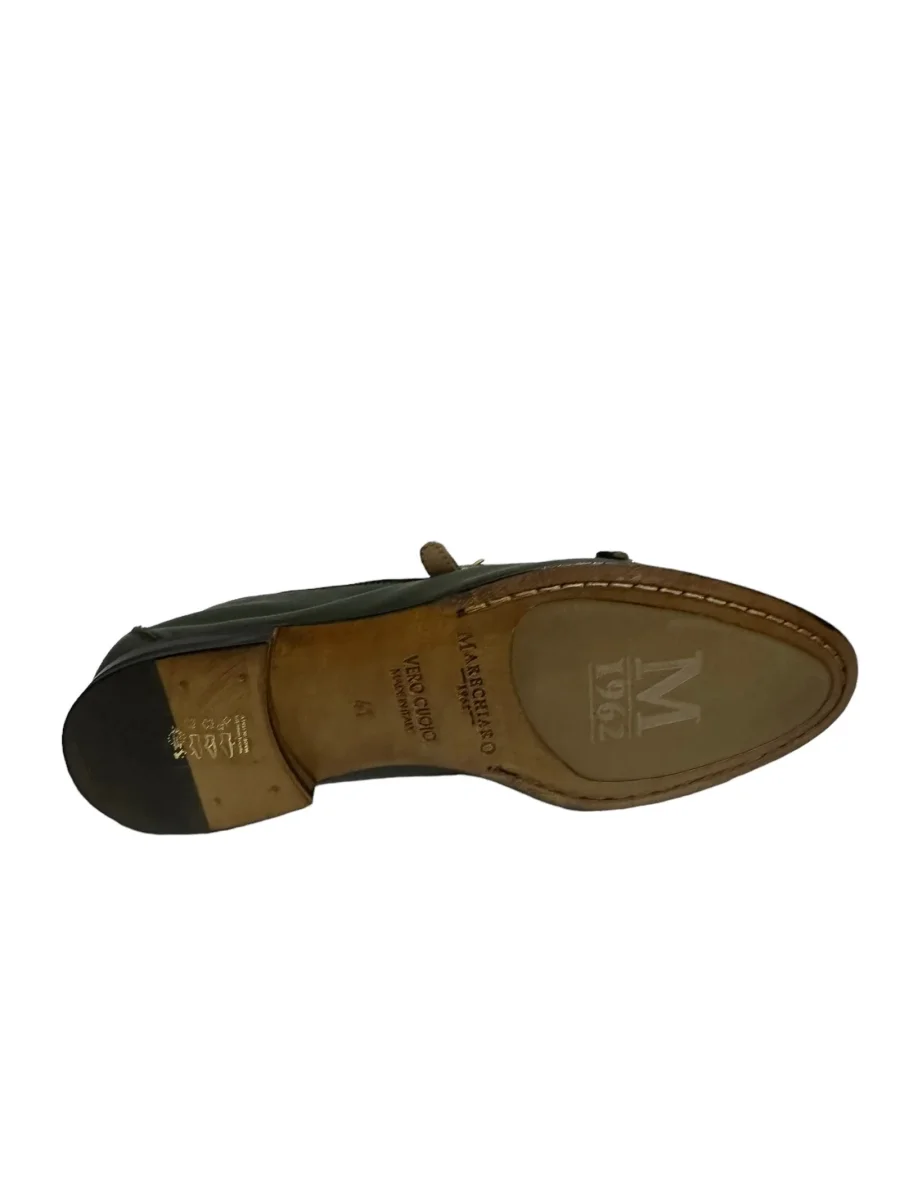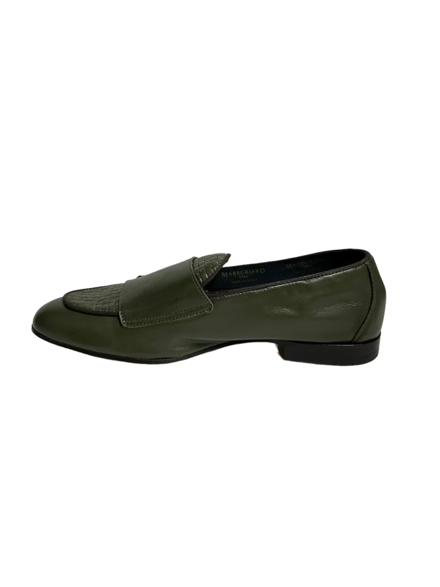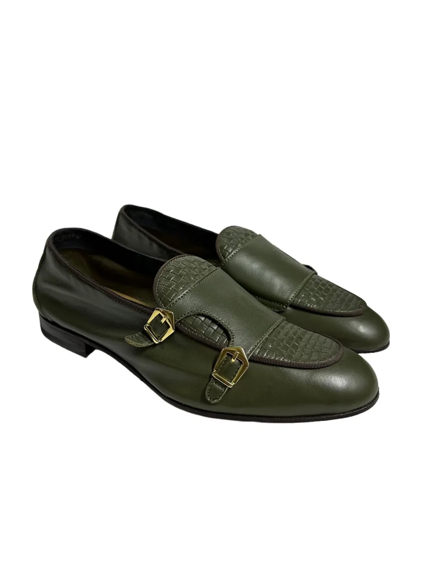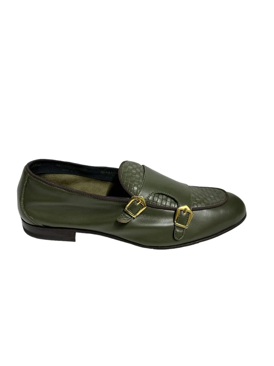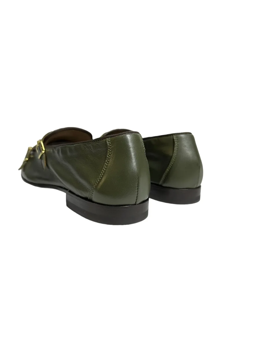 Mocassino in pelle verde doppia fibbia con fondo cuoio cucito e antiscivolo