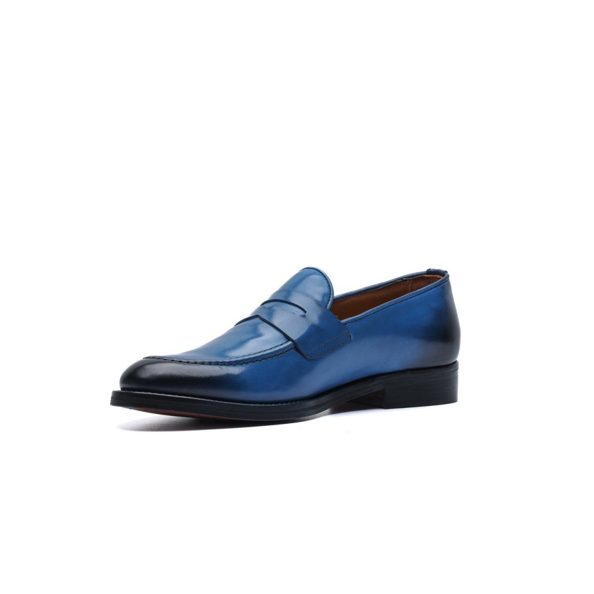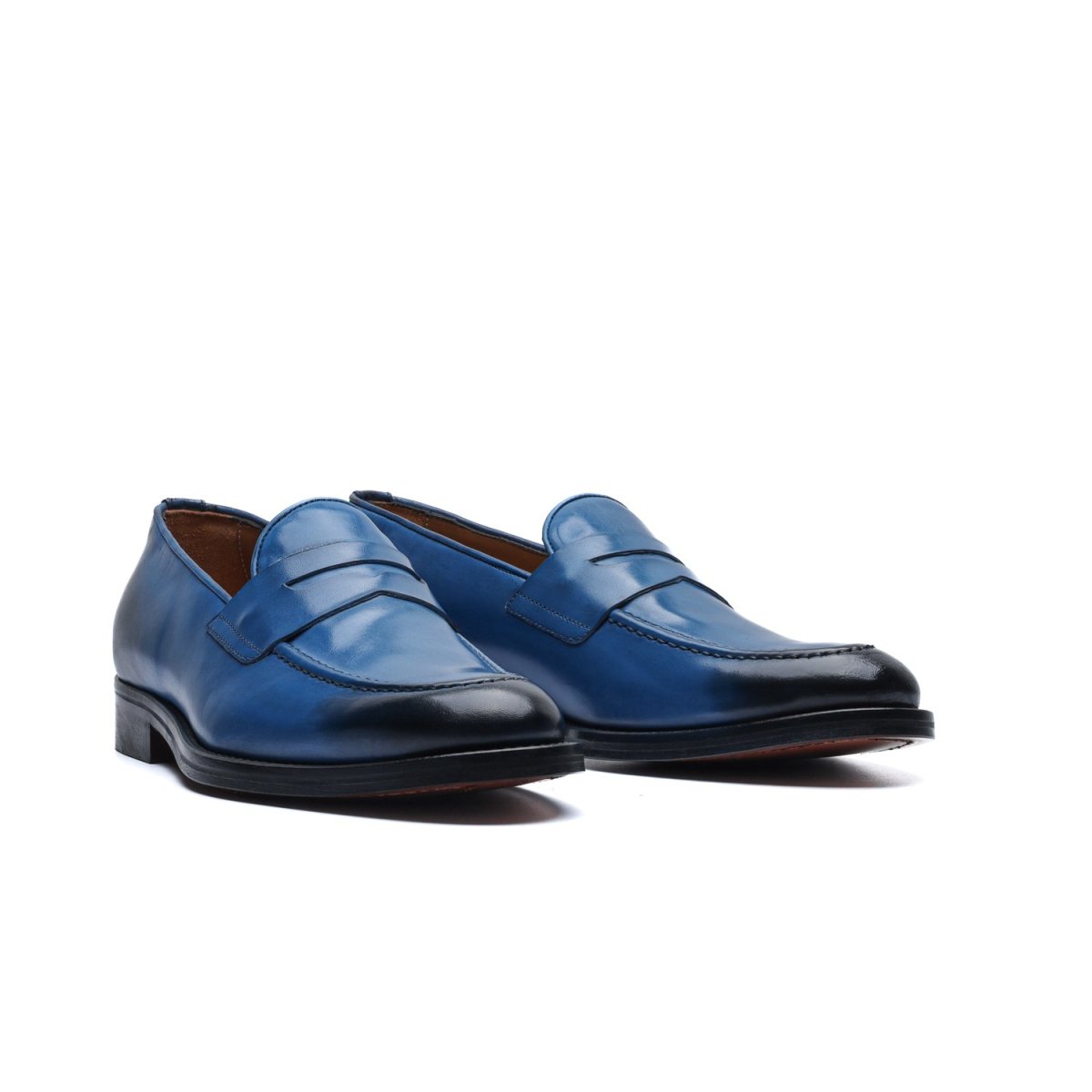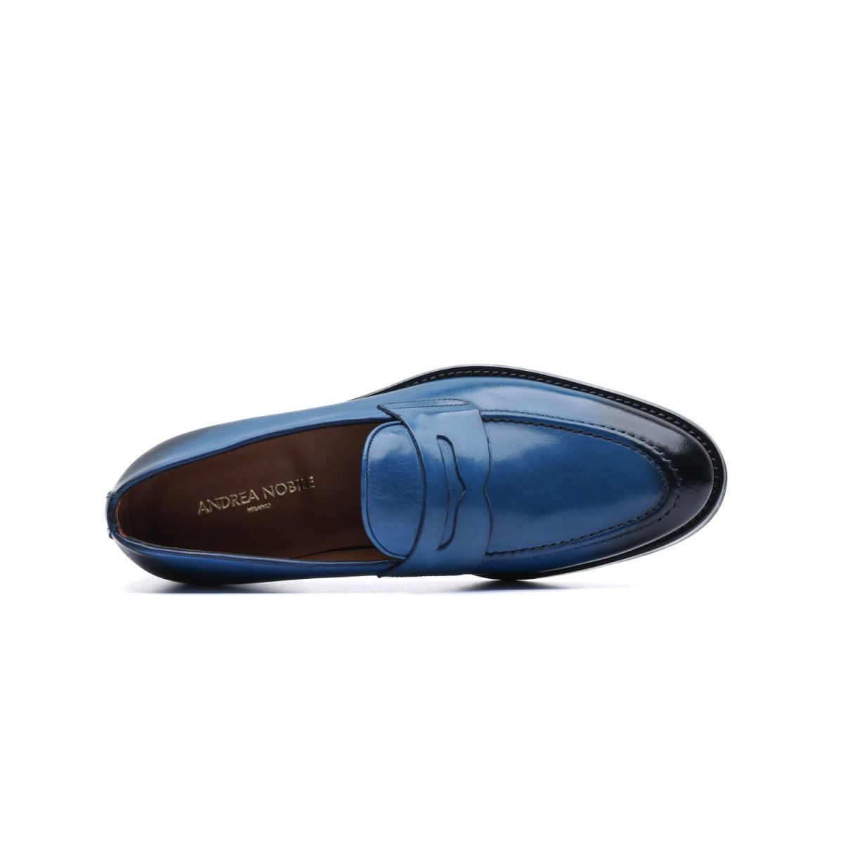 Calzature artigianali Made in Italy modello Penny Loafer o più comunemente conosciute come “Mocassini Penny”. Realizzate in pelle di vitello tinta nel colore blu con sfumature su punta e tallone, sulla parte frontale della tomaia è applicata l’iconica mascherina tono su tono. Interno foderato in pelle beige con logo stampato nel colore oro. La suola è in cuoio lavorata a blake, tinta a mano nel colore marrone. Tacco applicazione di gomma anti-scivolo. Un classico dalla struttura eccezionale, indossali con dei pantaloni sartoriali o chinos slim fit. Questa calzatura realizzata a mano unisce storia, eleganza, comfort e robustezza tipici dei prodotti…