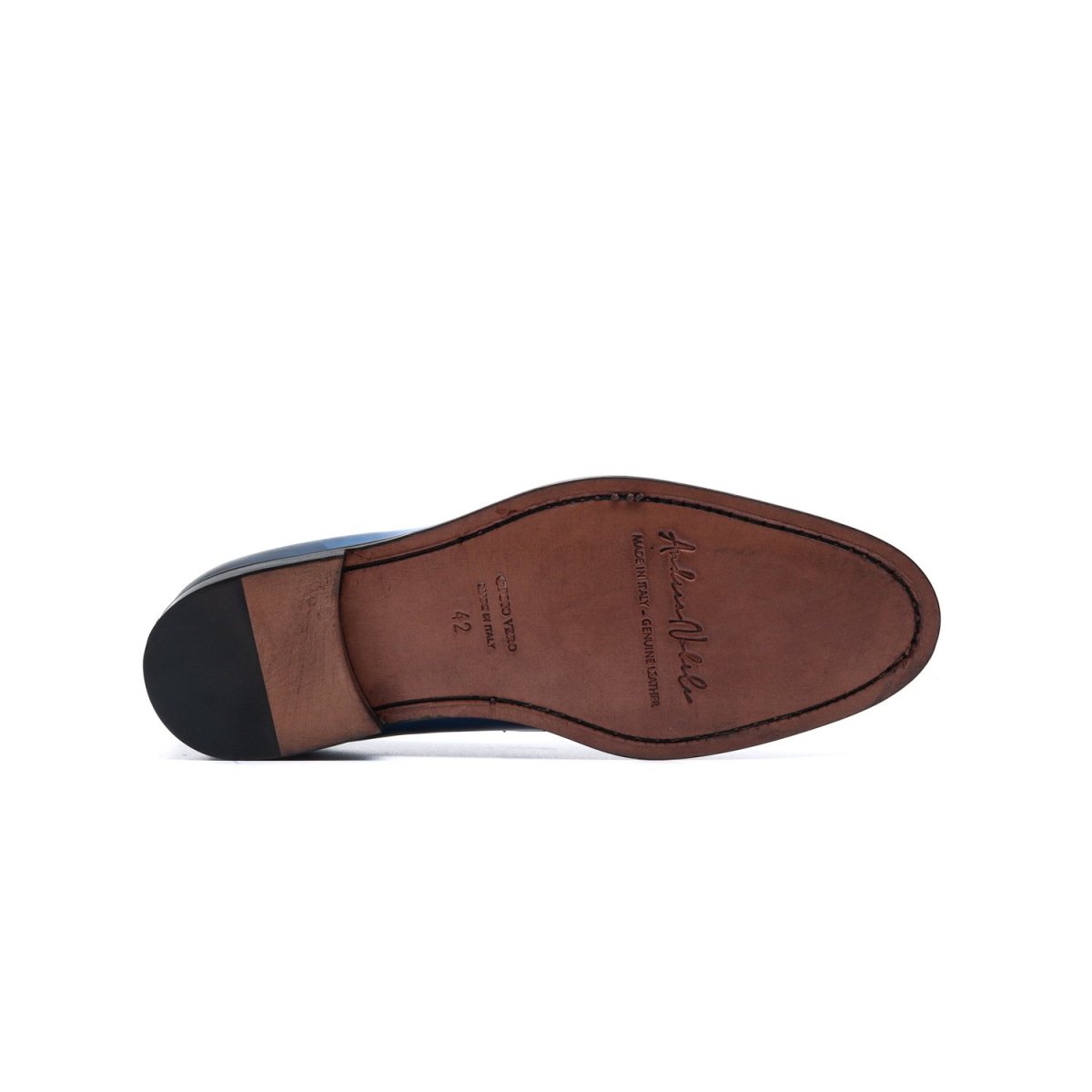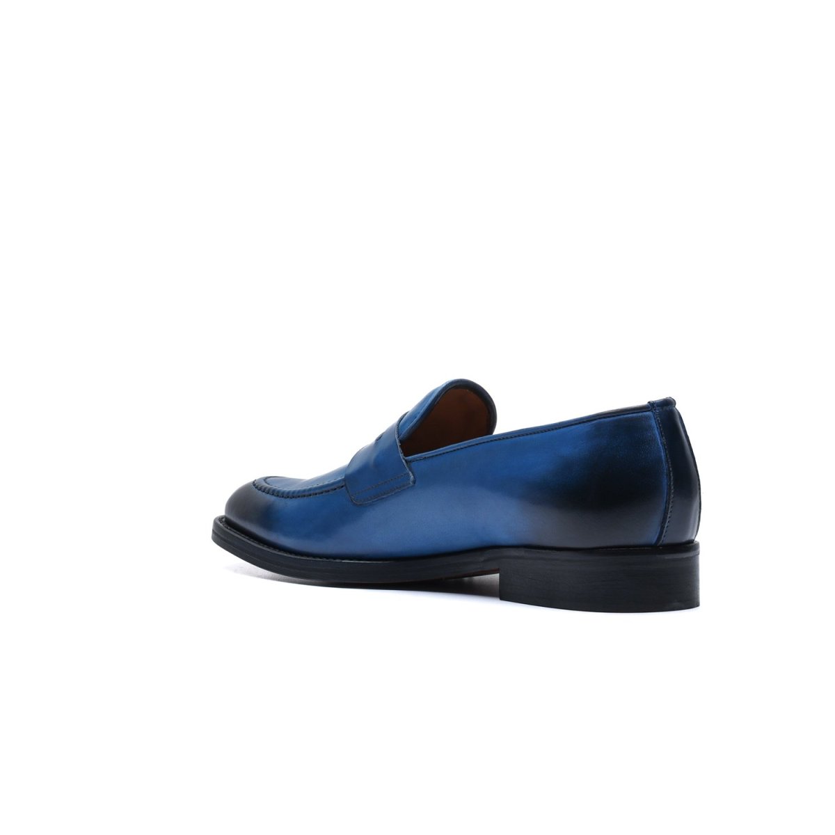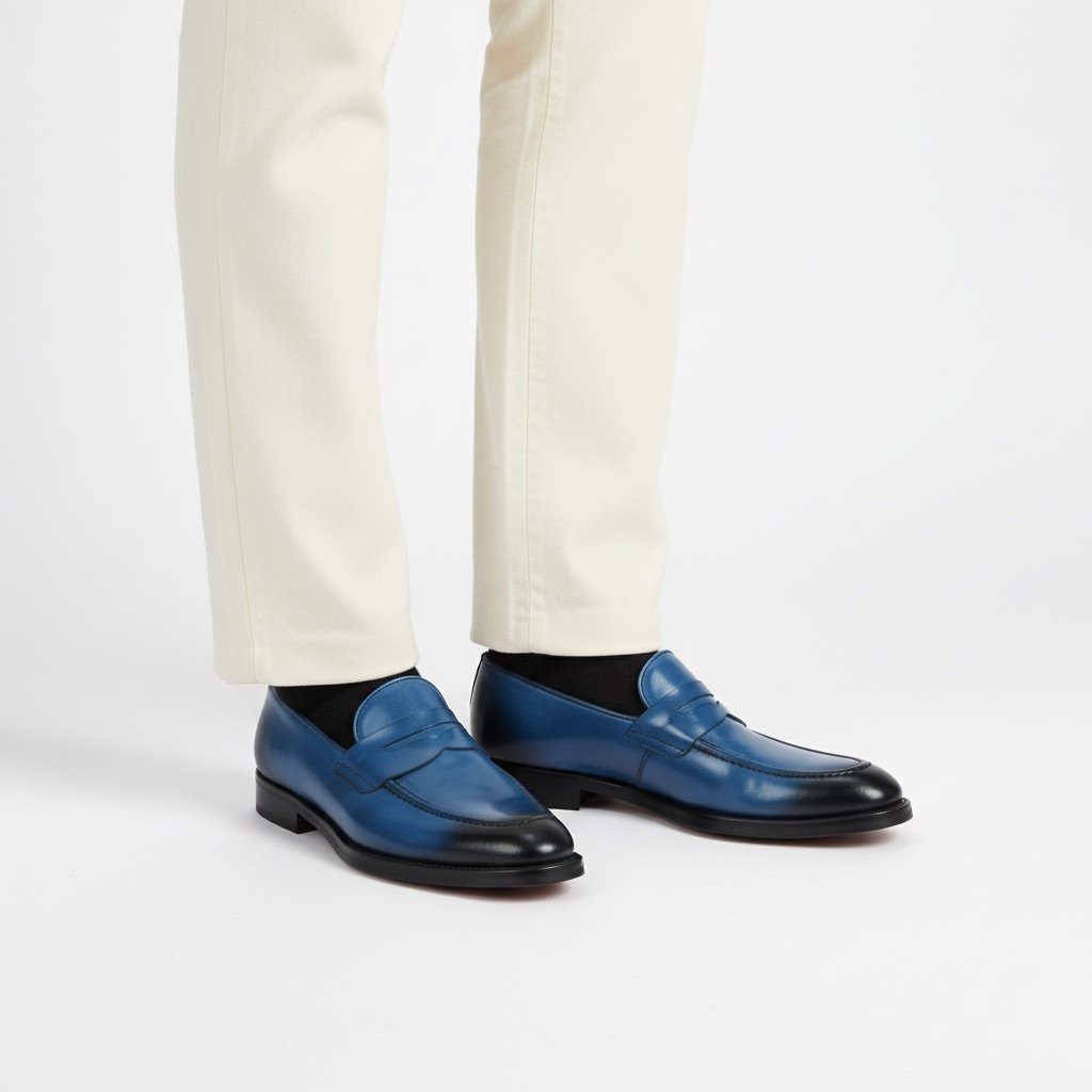 Calzature artigianali Made in Italy modello Penny Loafer o più comunemente conosciute come “Mocassini Penny”. Realizzate in pelle di vitello tinta nel colore blu con sfumature su punta e tallone, sulla parte frontale della tomaia è applicata l’iconica mascherina tono su tono. Interno foderato in pelle beige con logo stampato nel colore oro. La suola è in cuoio lavorata a blake, tinta a mano nel colore marrone. Tacco applicazione di gomma anti-scivolo. Un classico dalla struttura eccezionale, indossali con dei pantaloni sartoriali o chinos slim fit. Questa calzatura realizzata a mano unisce storia, eleganza, comfort e robustezza tipici dei prodotti…