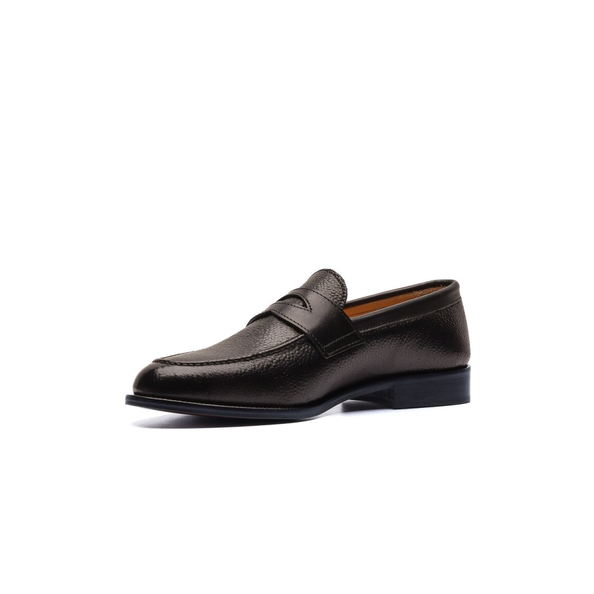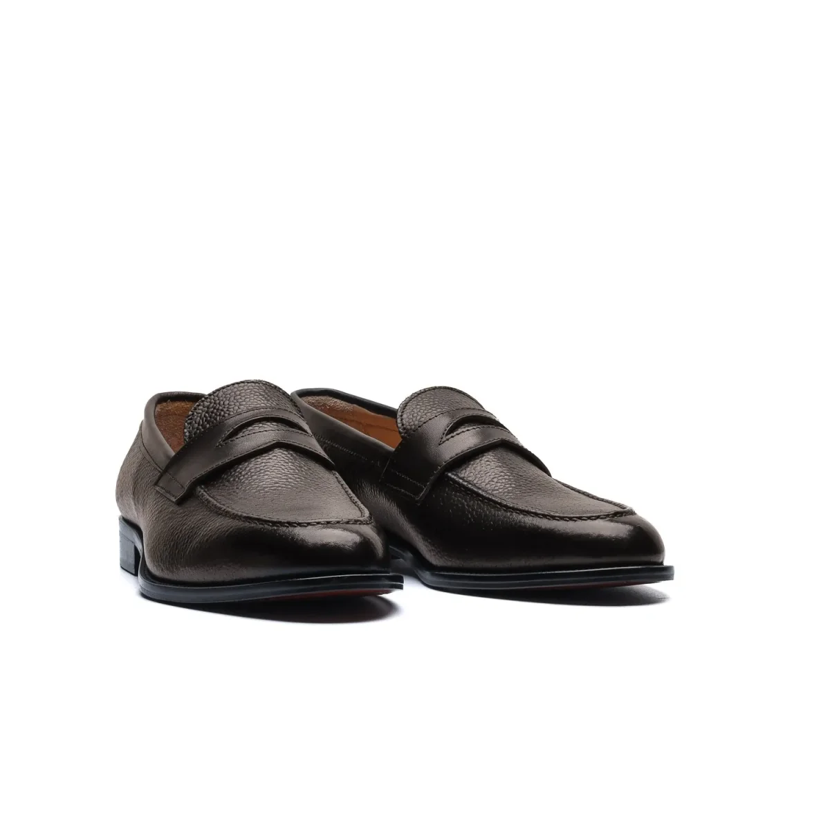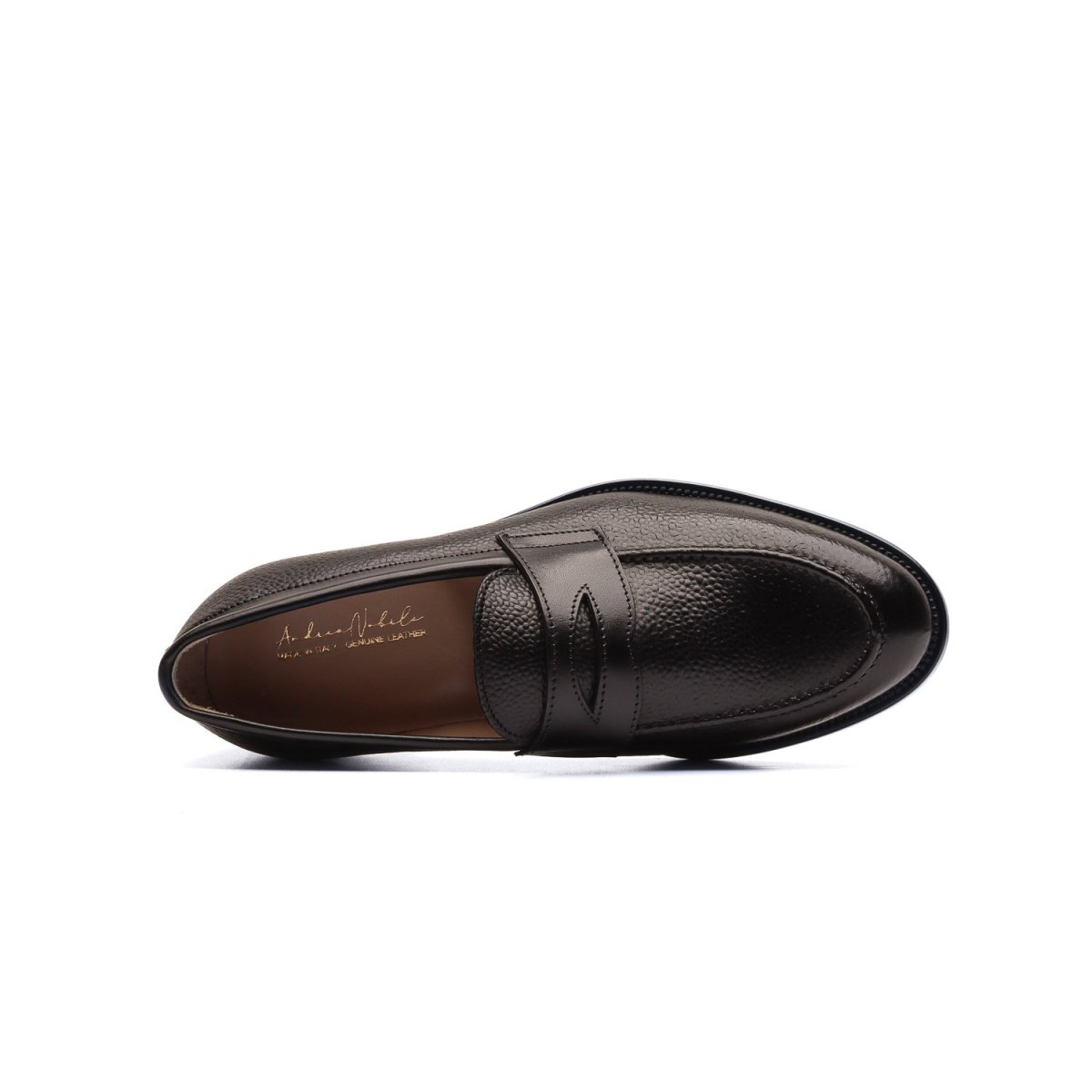 Calzature artigianali Made in Italy modello Penny Loafer o più comunemente conosciute come “Mocassini Penny”. Realizzate in pelle di vitello lavorata con motivo a chicco di riso tinta nel colore testa di moro, sulla parte frontale della tomaia è applicata l’iconica mascherina tono su tono. Interno foderato in pelle beige con logo stampato nel colore oro. La suola è in cuoio lavorata a blake, tinta a mano nel colore marrone. Tacco applicazione di gomma anti-scivolo. Un classico dalla struttura eccezionale, indossali con dei pantaloni sartoriali o chinos slim fit. Questa calzatura realizzata a mano unisce storia, eleganza, comfort e robustezza…