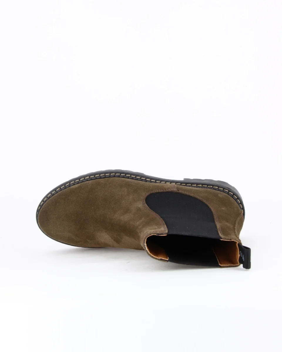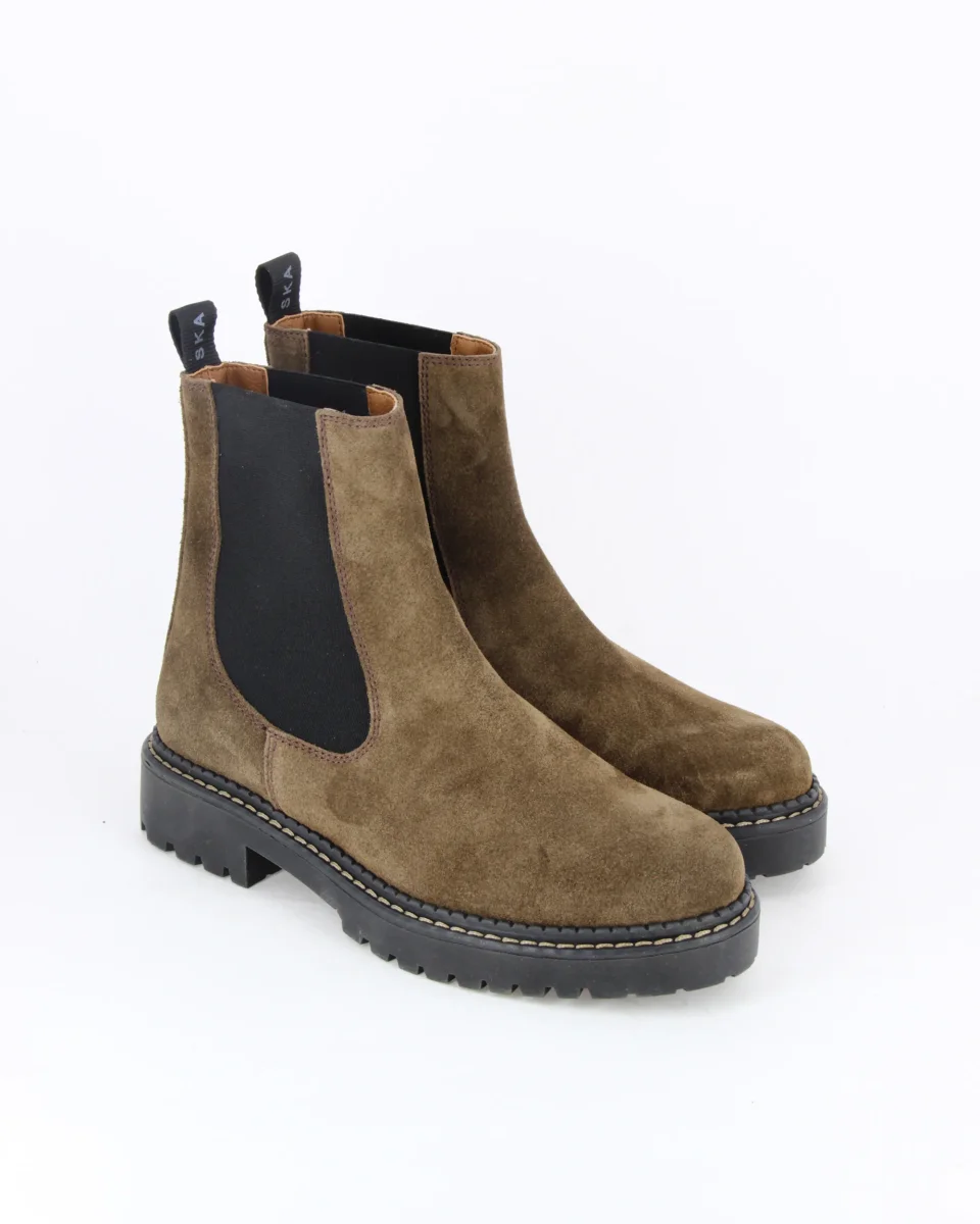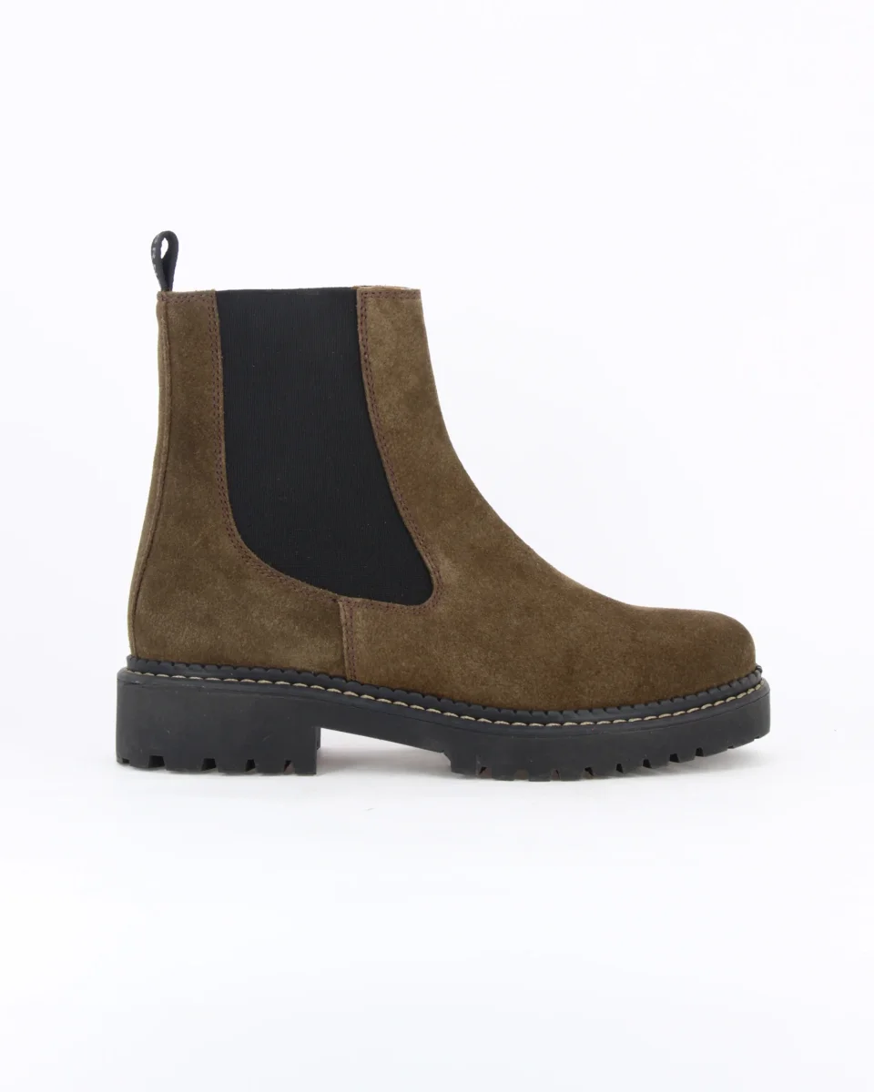 MONKEY è uno stivaletto in pelle scamosciata con elastici laterali. La suola è in gomma, tipo carrarmato; il guardolo è cucito con filo a contrasto. Il sottopiede è in pelle.