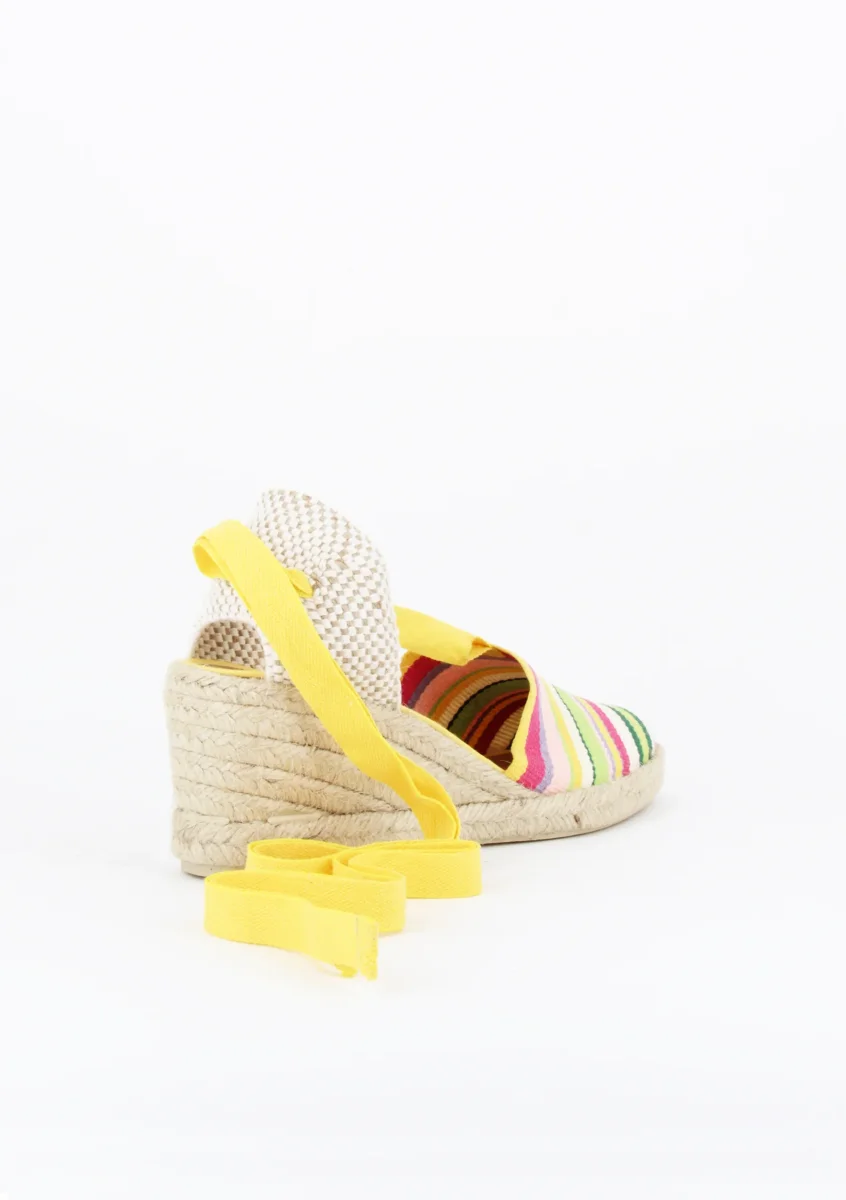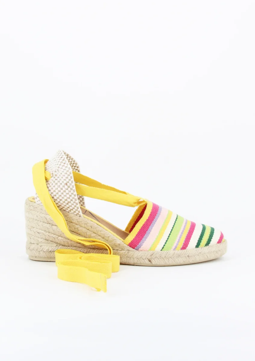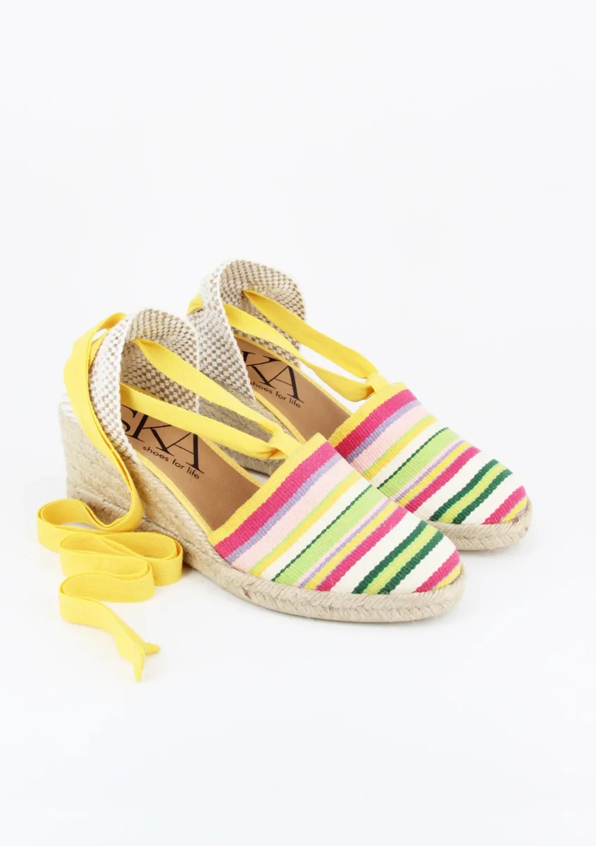 MORNA Espadrillas in tessuto con laccio, zeppa in iute naturale con allacciatura alla caviglia alta 5 cm e plateau di 1 cm. MORENA è una espadrillas in tessuto con punta chiusa e fettuccia dal dorso alla caviglia da annodare.